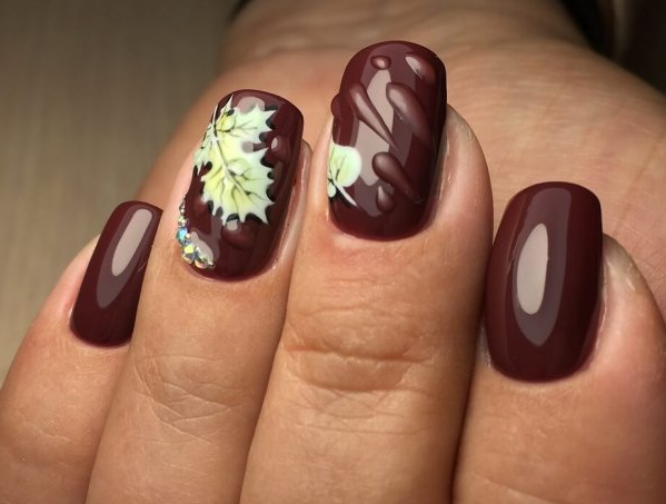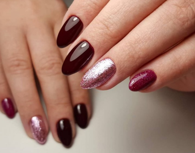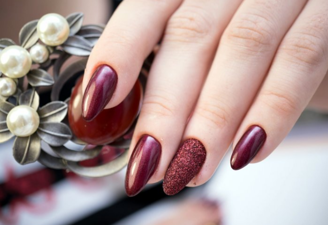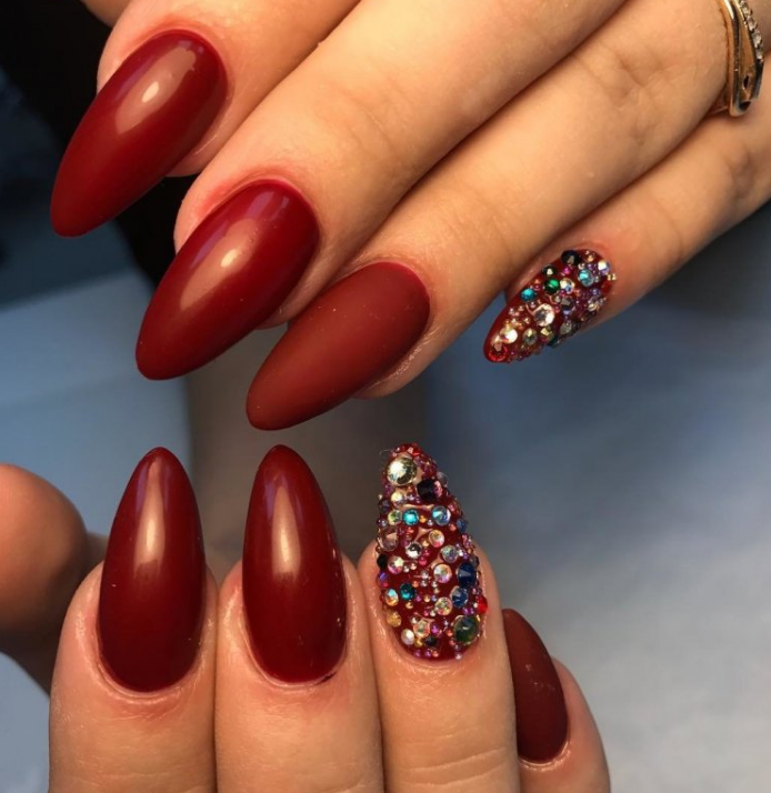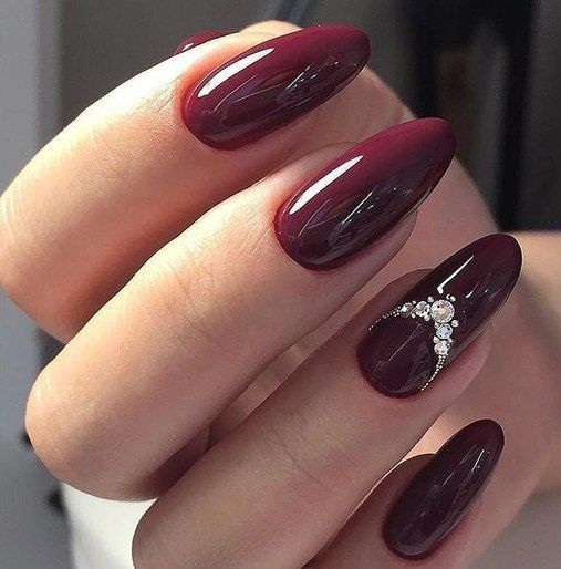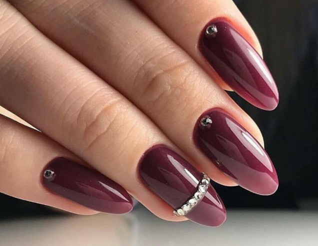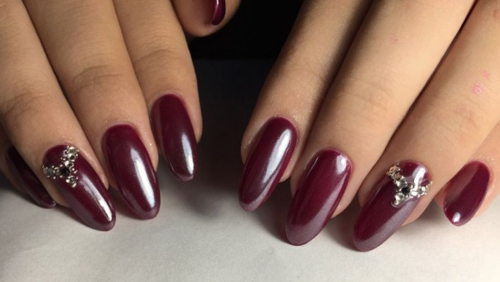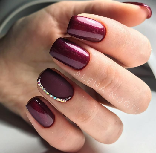 Бордовый — основной цвет палитры темно-красных теплых тонов. Сами по себе эти оттенки поражают воображение яркостью, глубиной. При желании ногти можно дополнительно украсить декором — блестками, втиркой, фольгой, рисунками, стемпингом и др.