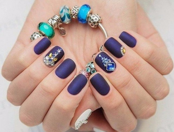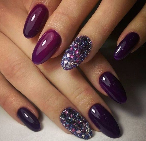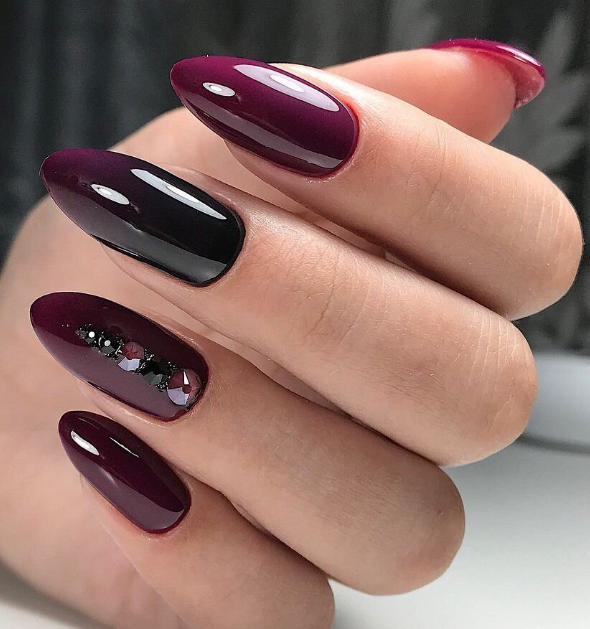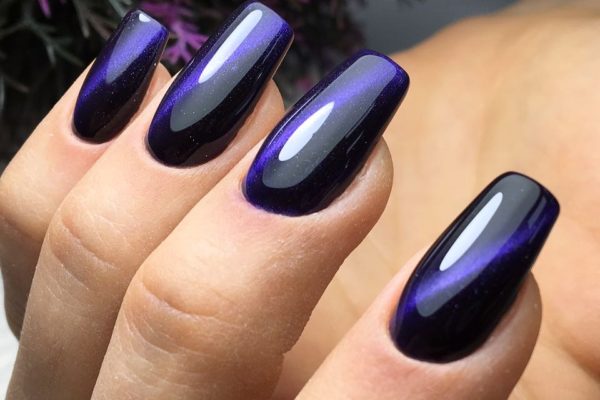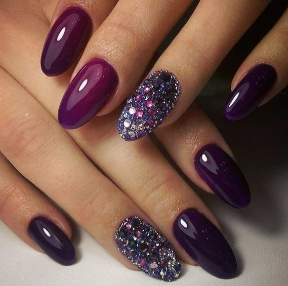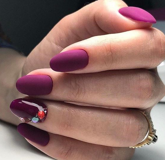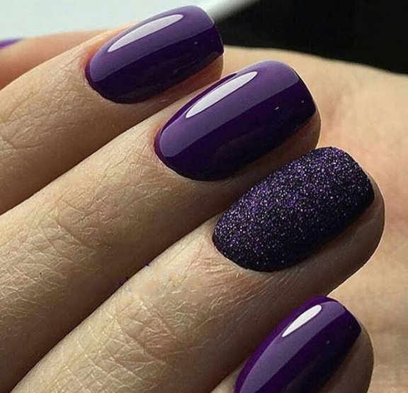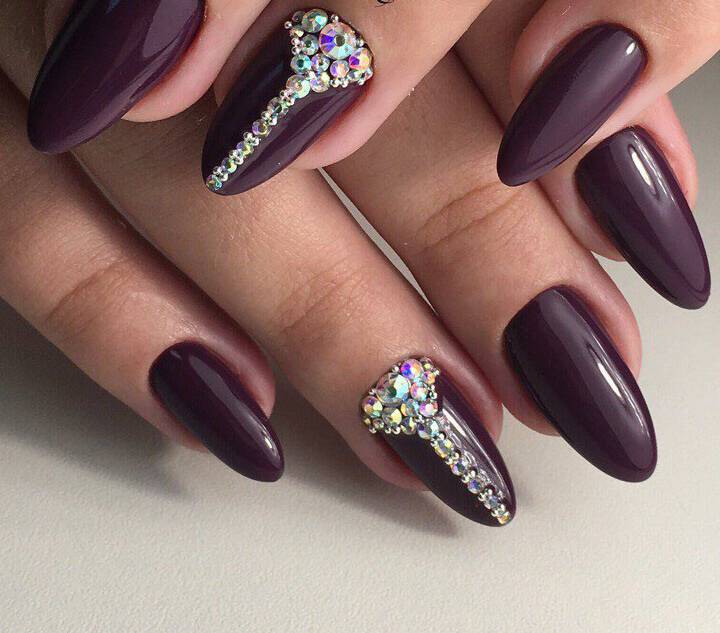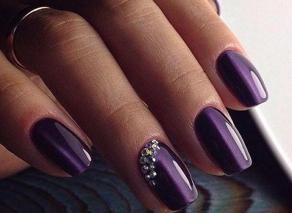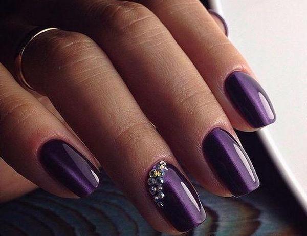 Особенно эффектно темный фиолетовый смотрится в дизайне кошачий глаз, омбре, с матовым топом, с декором стразами.