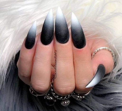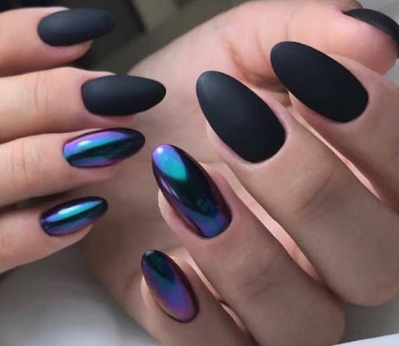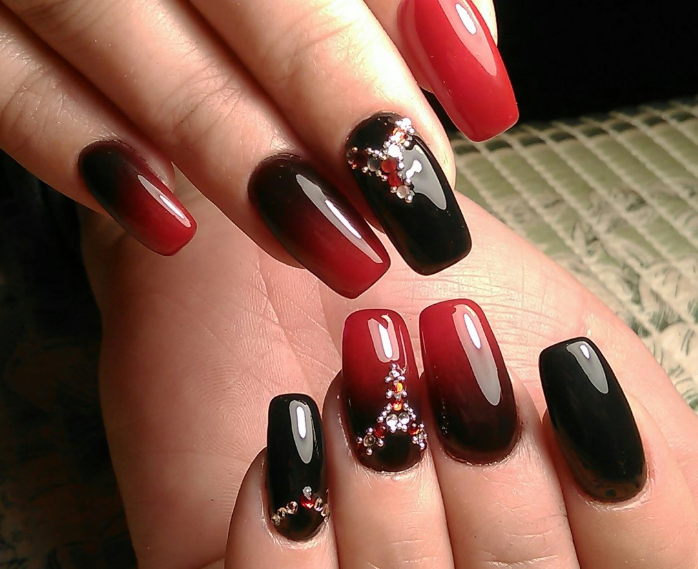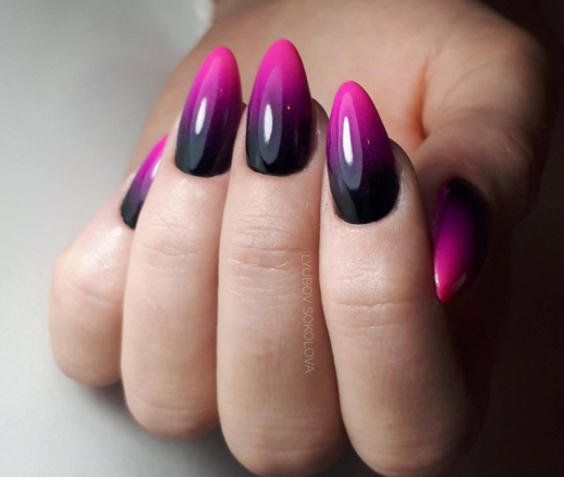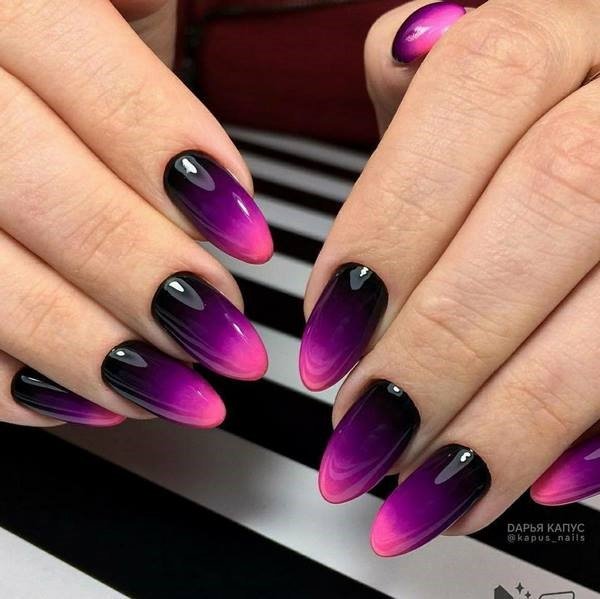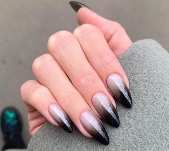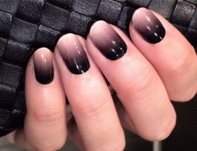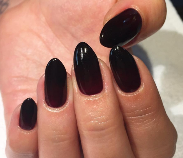 Градиент и омбре — возможность показать на одном ноготке палитру темного цвета. Начните с черного или самого мрачного из выбранных оттенков и плавно переходите к более светлому.