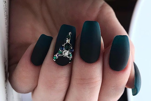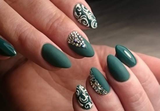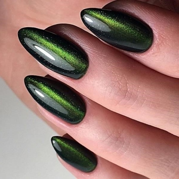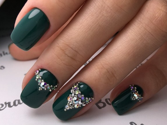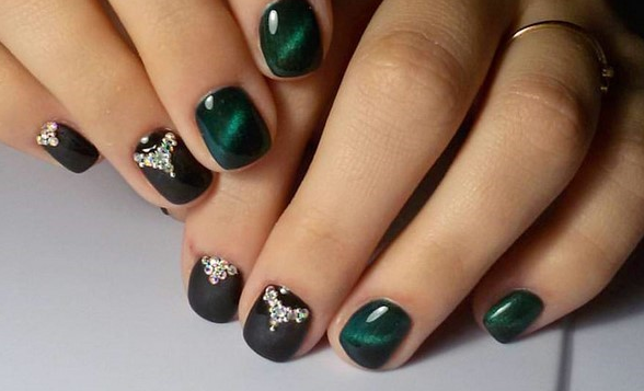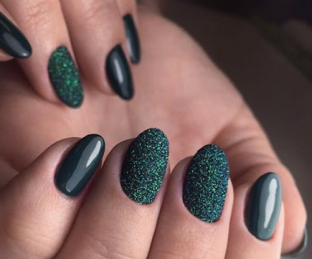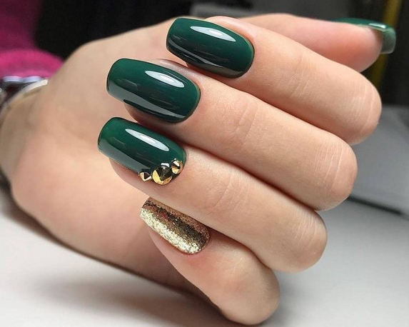 Интересно, что темно-зеленый (близкий к малахиту) часто называют цветом оптимистов. Удивительное свойство оттенка — возможность создать дизайн ногтей, где будут сочетаться сложные оттенки — фиолетовый, желтый, салатовый, золотой. Одно из классических сочетаний зеленого с золотым можно сделать с помощью блесток или фольги.