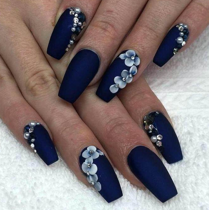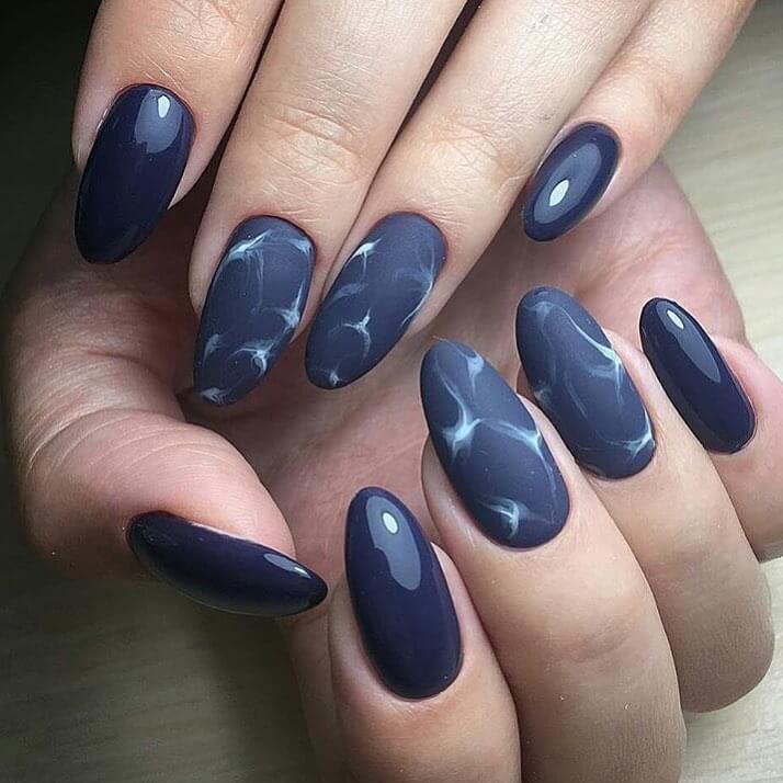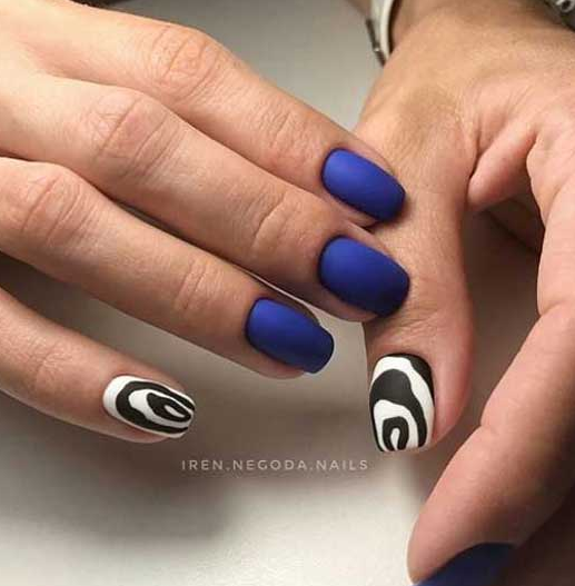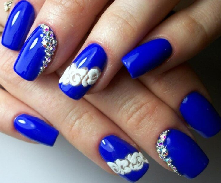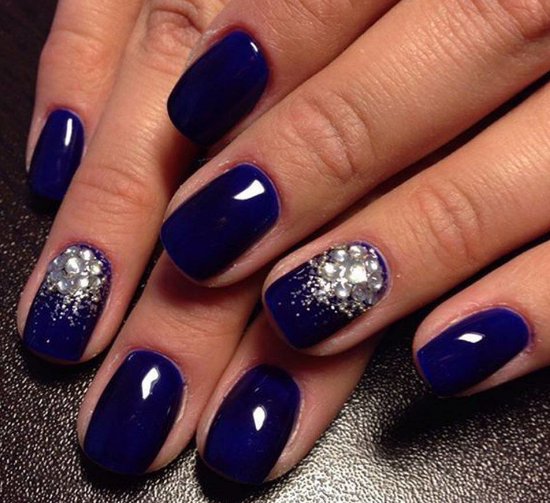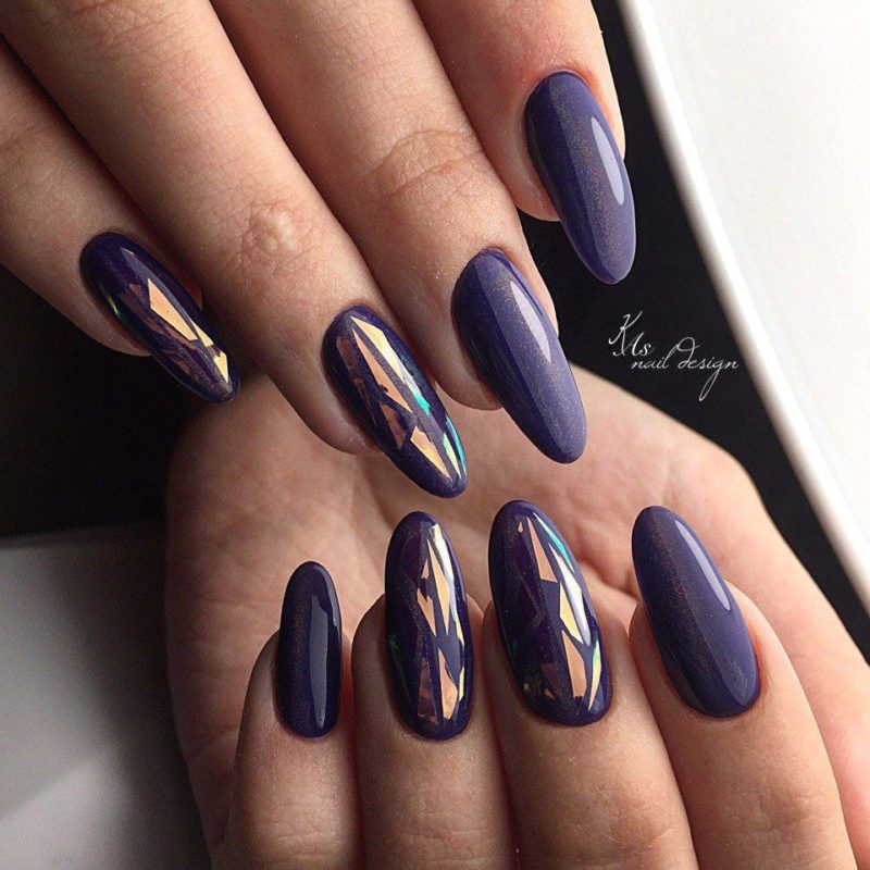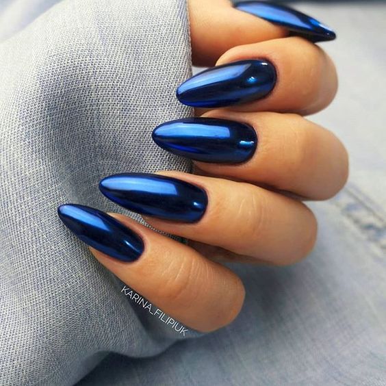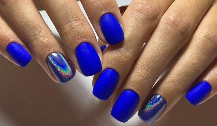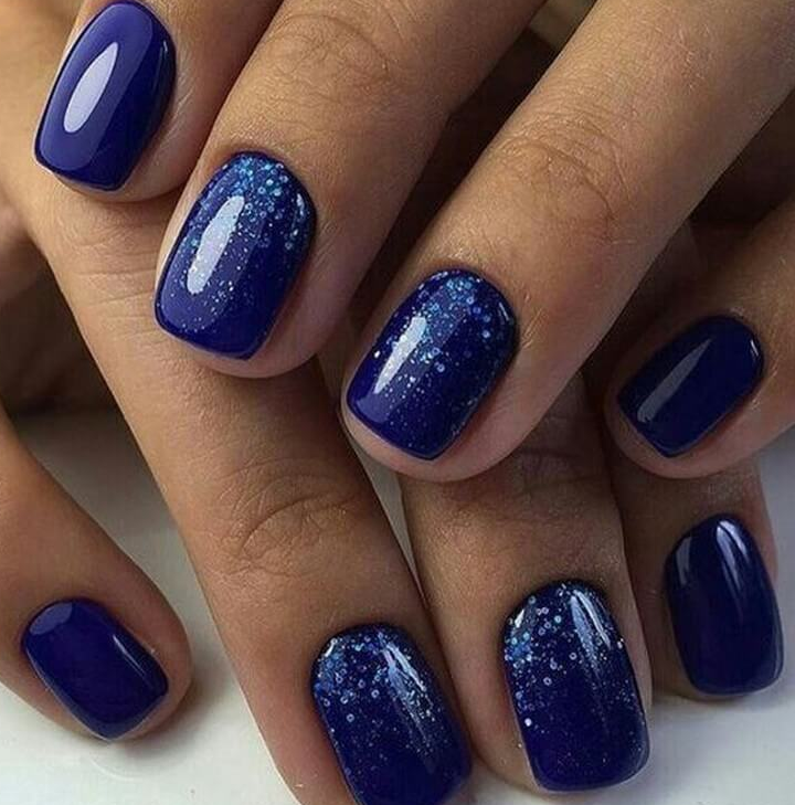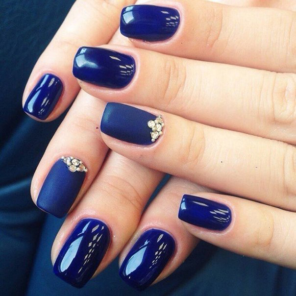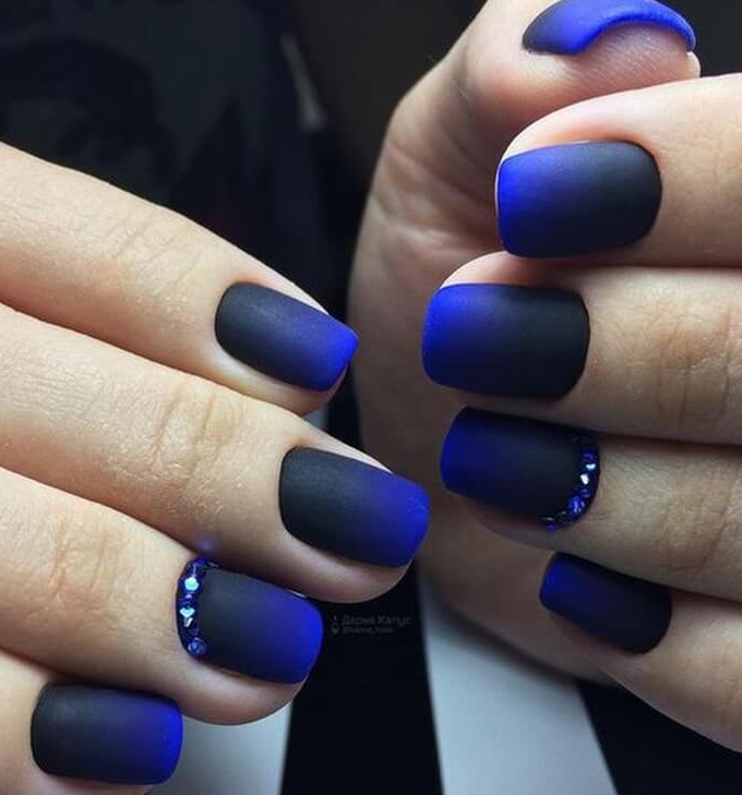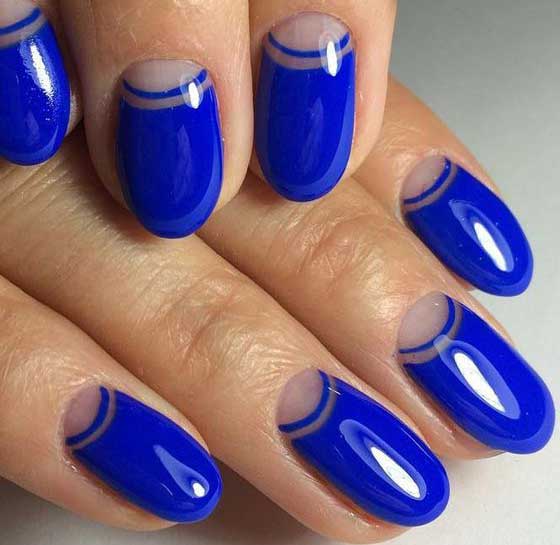 Если яркие небесные оттенки — это лето и солнце, то глубокий королевский синий актуален с началом осени и до поздней весны. Благородный цвет отлично смотрится в однотонном дизайне, но не менее эффектен и градиент с использованием прозрачного тона или других оттенков синего.