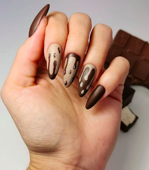 Какао, шоколад — молочный и горький, коричневый с подтоном горчицы — палитра этого сложного цвета разнообразна. Шоколадное покрытие станет еще более шикарным в матовом исполнении. Вы можете добавить нюдовых или контрастных цветов в дизайн.