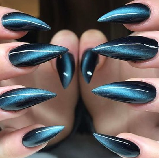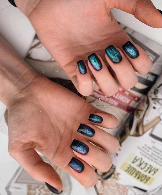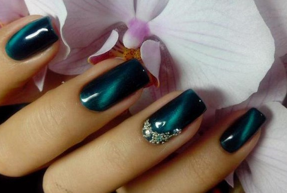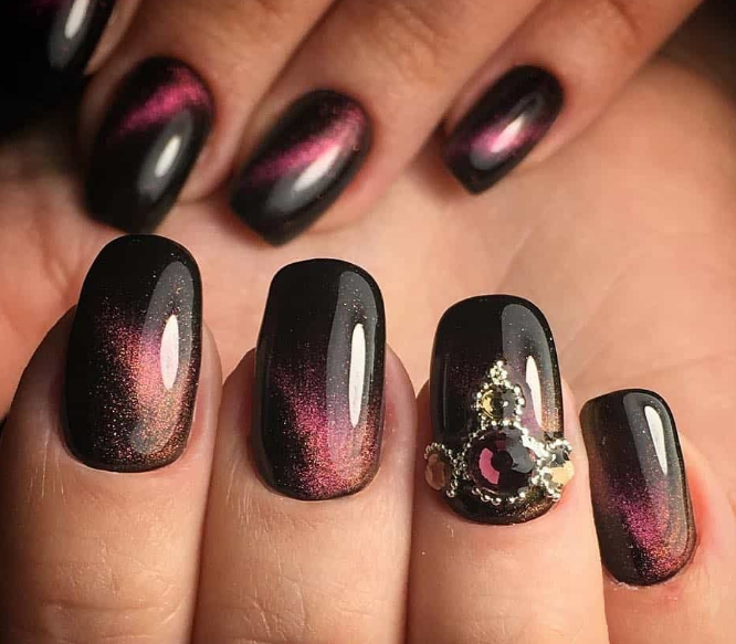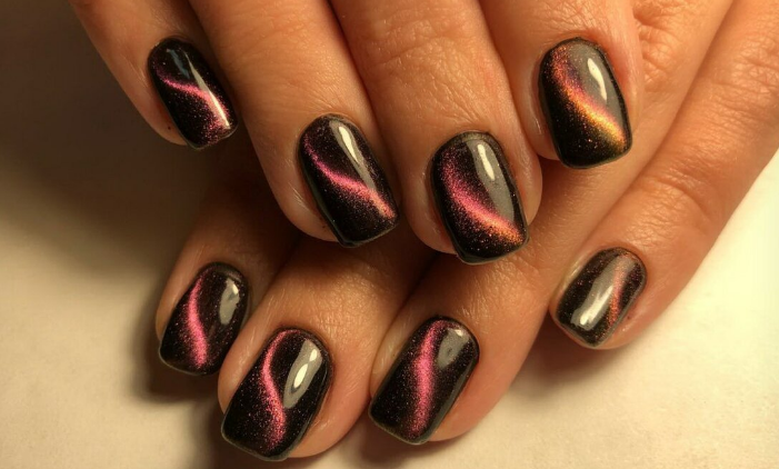 Простой декор с помощью магнитного лака. Темные цвета словно раскрываются в таком дизайне, можно увидеть многослойность и многогранность того или иного оттенка. Берите в руки магнит и творите — здесь нет правил, важна только фантазия.