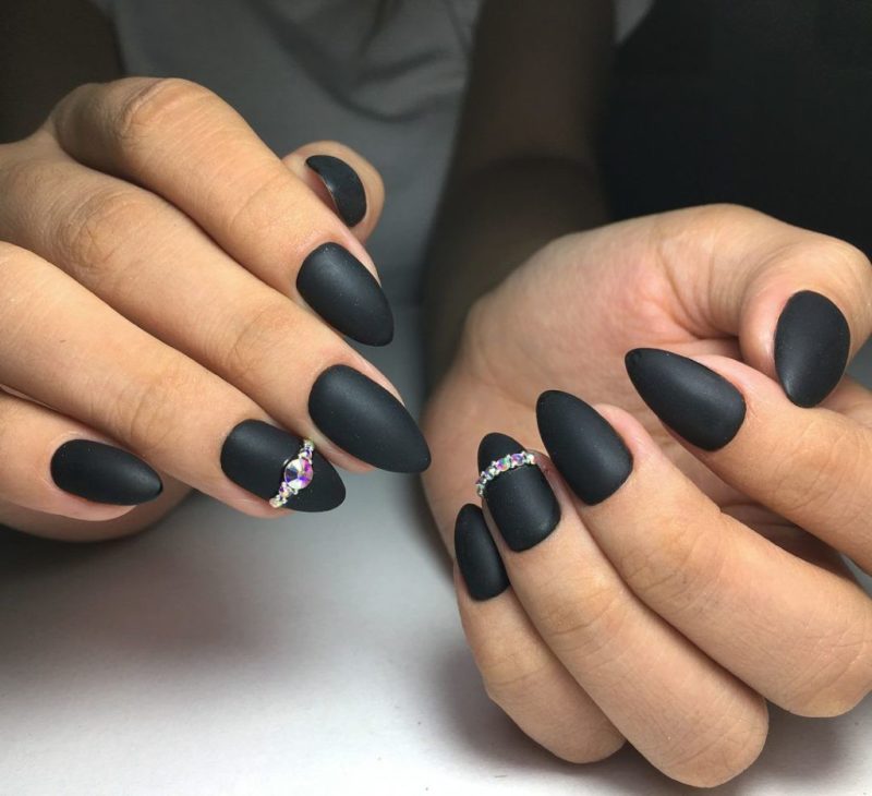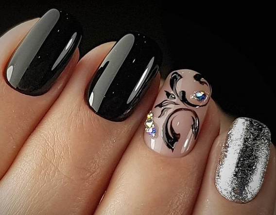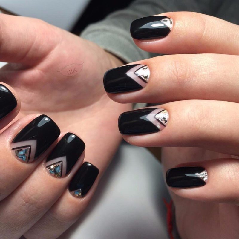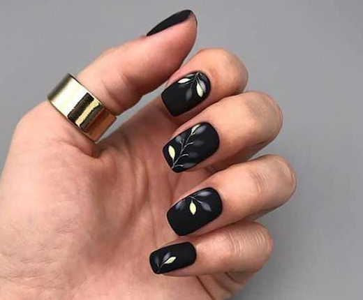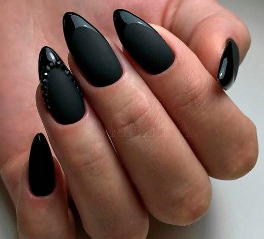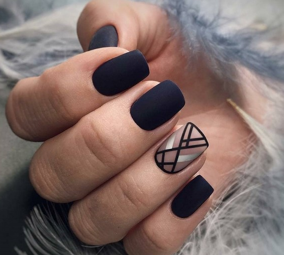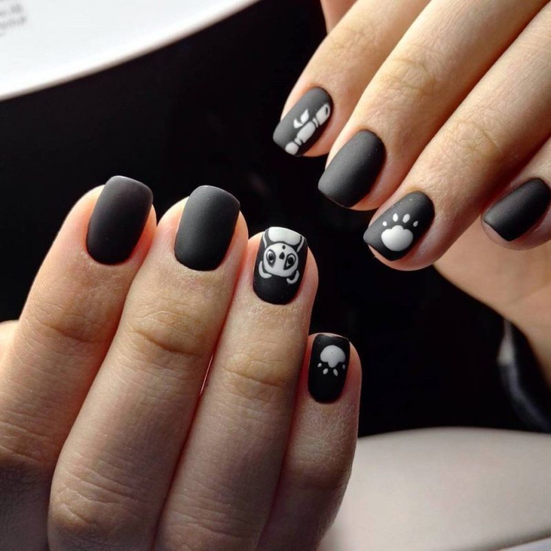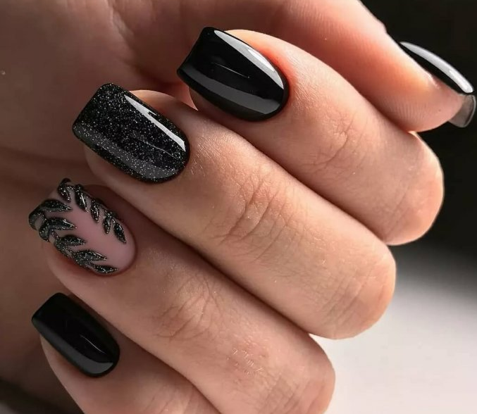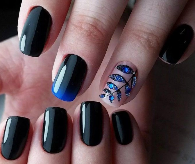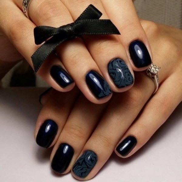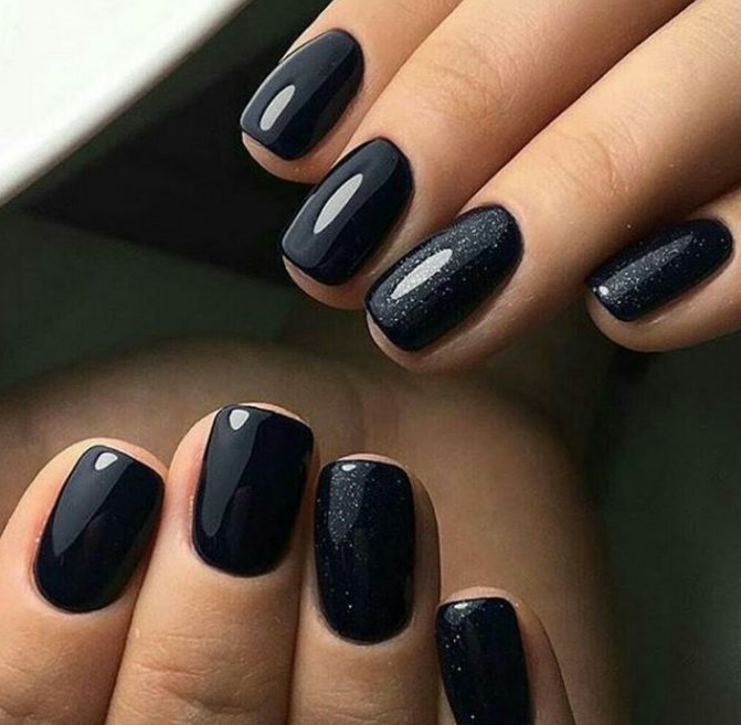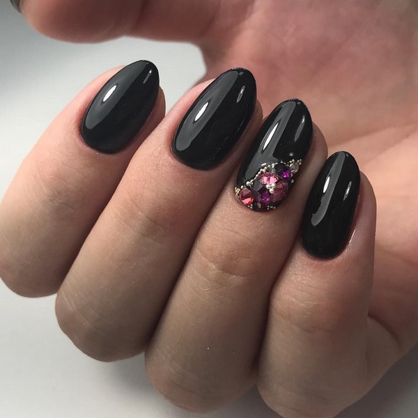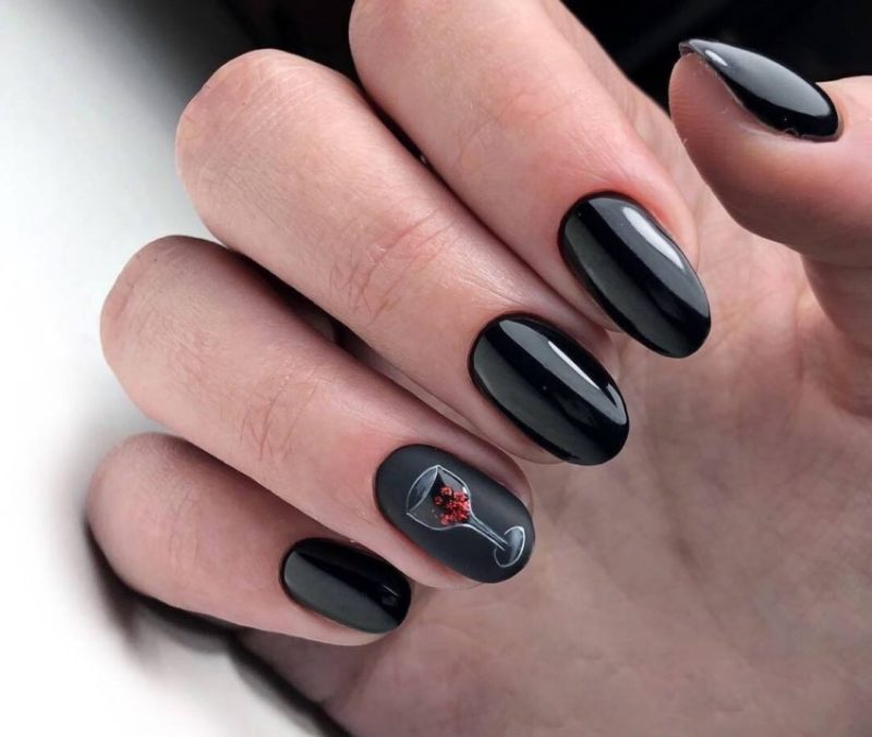 Современные тенденции нейл-арта практически всегда включают черный цвет в тренды сезона. Допускается не только оформить в этот темный цвет все ногти, но и выделить отдельные ноготочки. Эффектно смотрится как глянцевое, так и матовое покрытие.