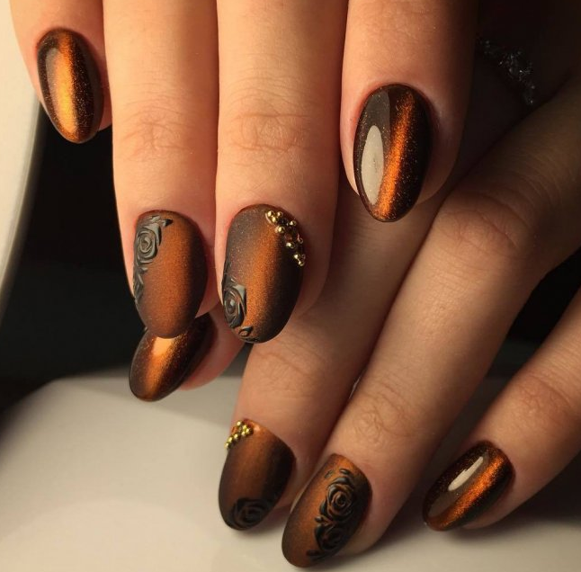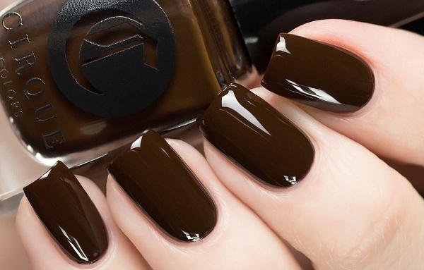 Отдельно стоит сказать о цвете горький шоколад. Этот тон находится на стыке черного и темно-коричневого. Его сложность и создает тот шикарный эффект, который можно получить на ногтях, если покрыть их матовым топом, использовать магнитный лак.