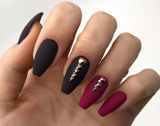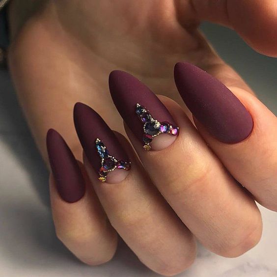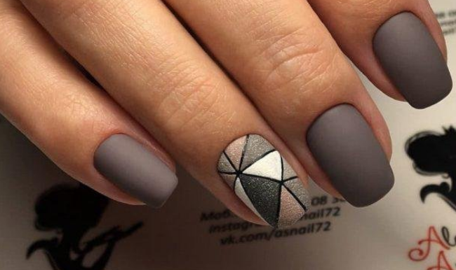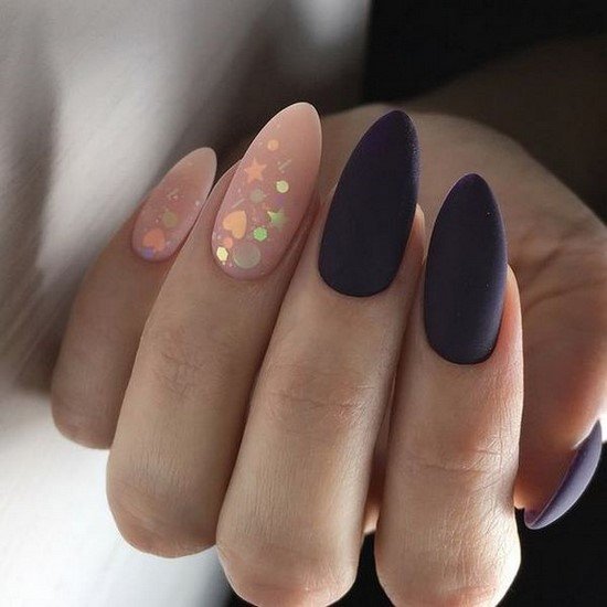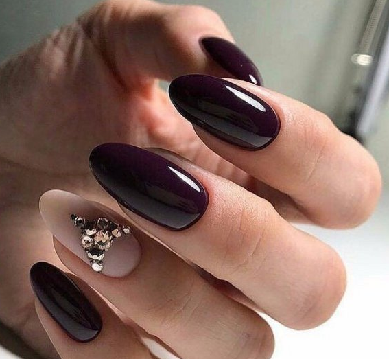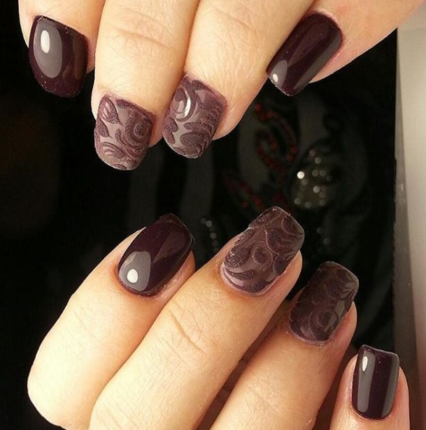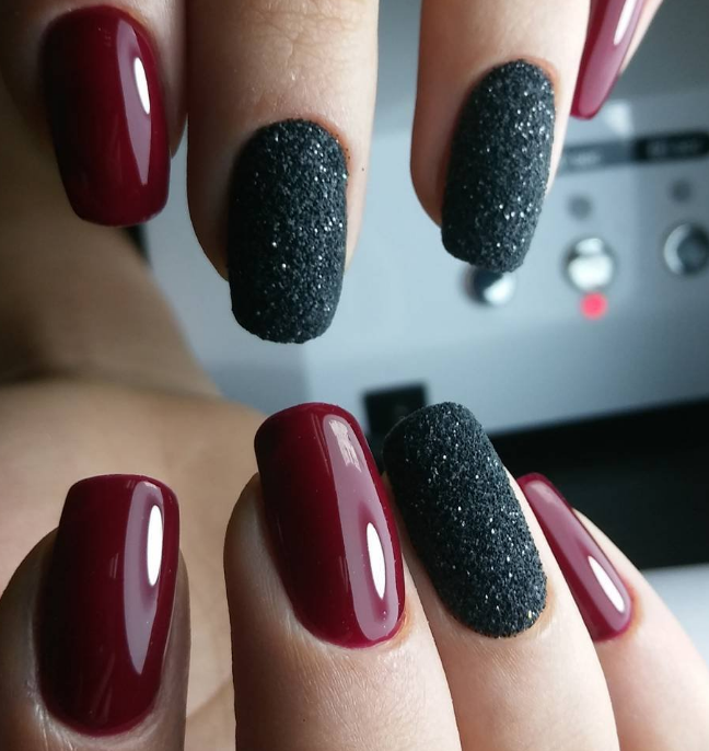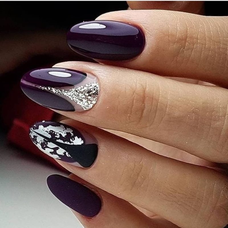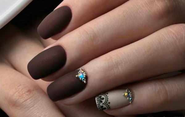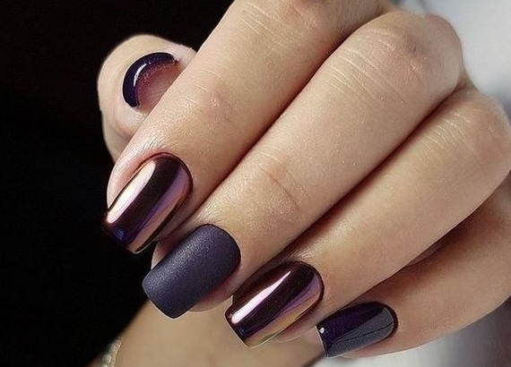 Темные цвета лака и матовый топ — убойное сочетание для модного маникюра. Вы сможете воплотить множество идей. Самое простое — сочетание матового и глянцевого оформления на одной руке.