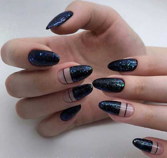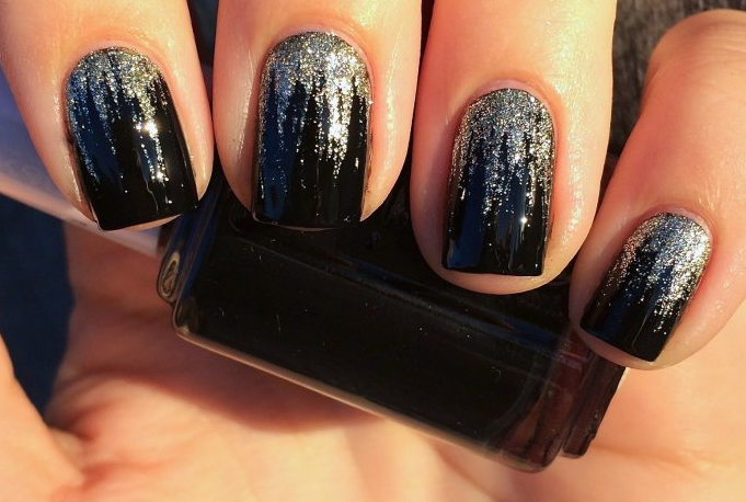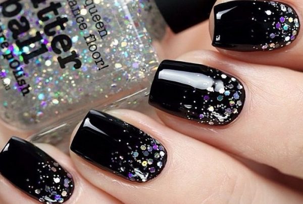 Блестки (лак или рассыпчатая пудра) — простой и недорогой способ придать блеска обыденному оформлению ногтей. Вариантов множество — от покрытия всех пластин до продольных полосок кисточкой или френча.