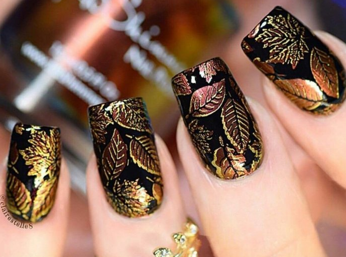 Темная база отлично подходит для рисунков — флористических, анималистических, геометрических и др. Рисунок можно нанести с помощью трафарета, стемпинга, наклейки или нарисовать кисточкой.