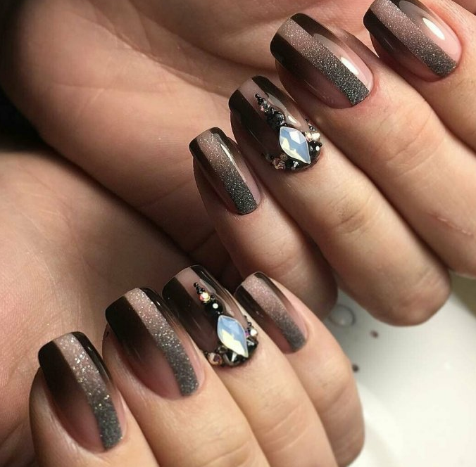 Совет: последние тренды нейл-арта предлагают выделять стразами не только верх пластины, но и украсить ее изнутри — видимую часть.