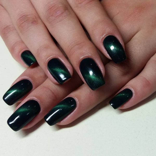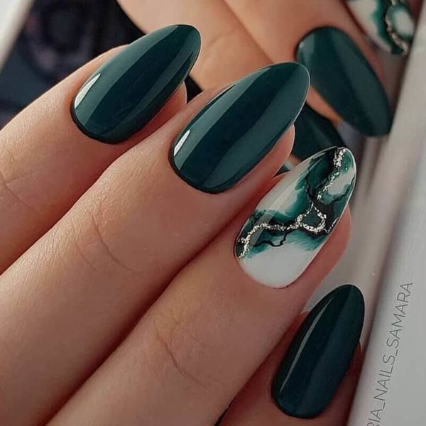 Совет: темно-зеленый подходит для дизайна “мрамор”, который создает на ногтях малахитовое покрытие.