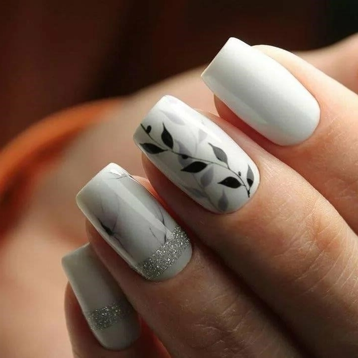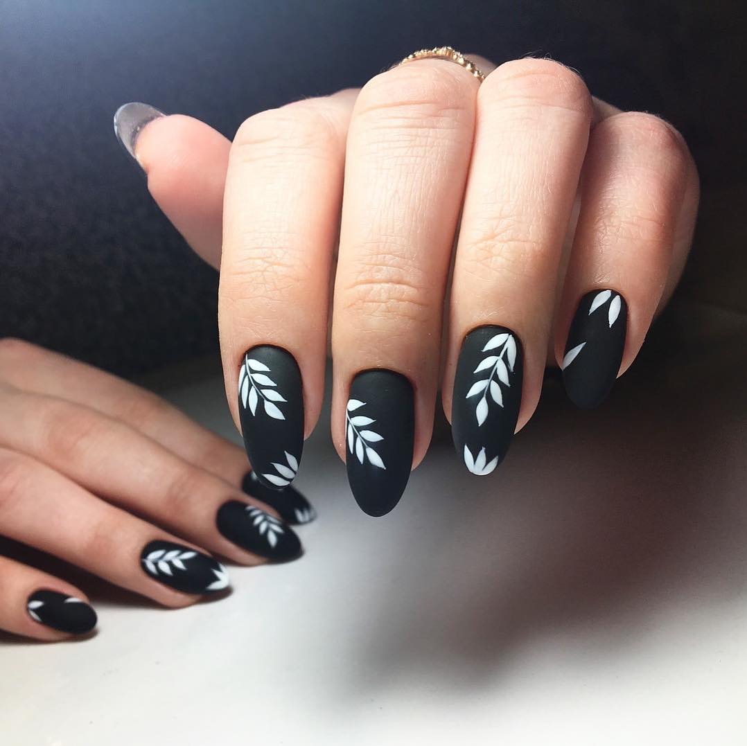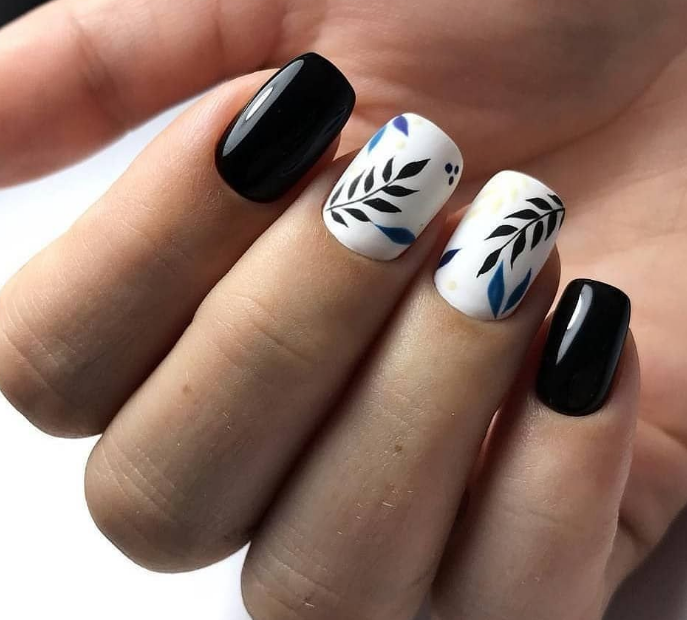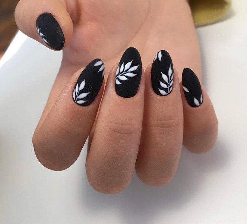 Совет: отлично смотрится на ногтях и маникюр с белыми, черными листьями — лучше на контрастном фоне. Они удлиняют пальцы, придавая женственной ручке изящество. Благодаря контрастной палитре листья будут потрясающе смотреться в любом случае и обстановке. Этот универсальный вариант подойдет дамам разного возраста. В стильном нейл-арте легкость и женственность дизайна покоряет своим непревзойденным внешним видом.