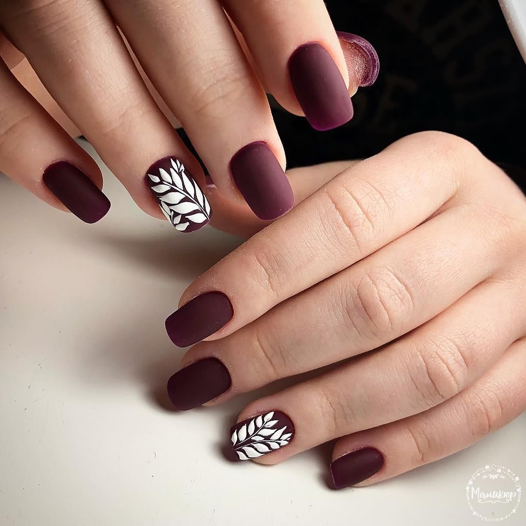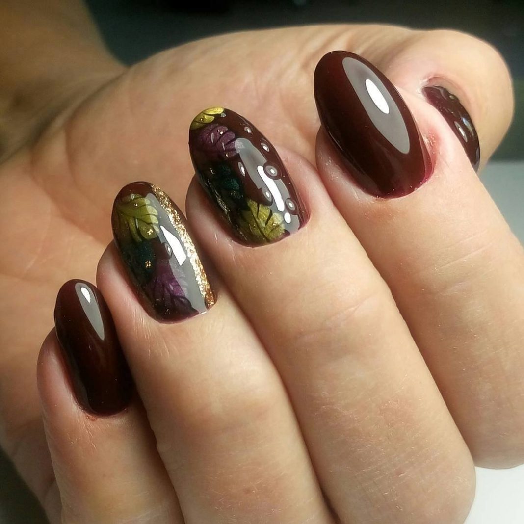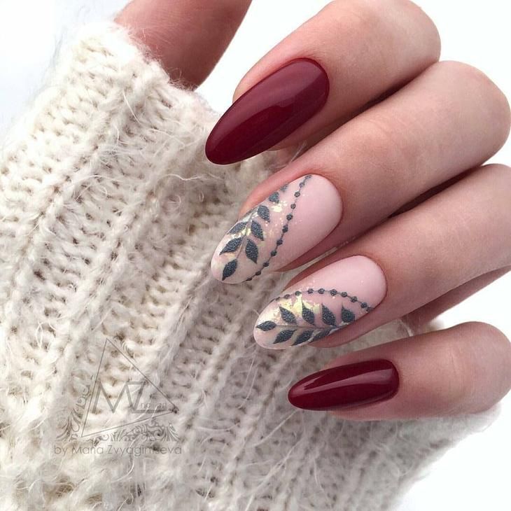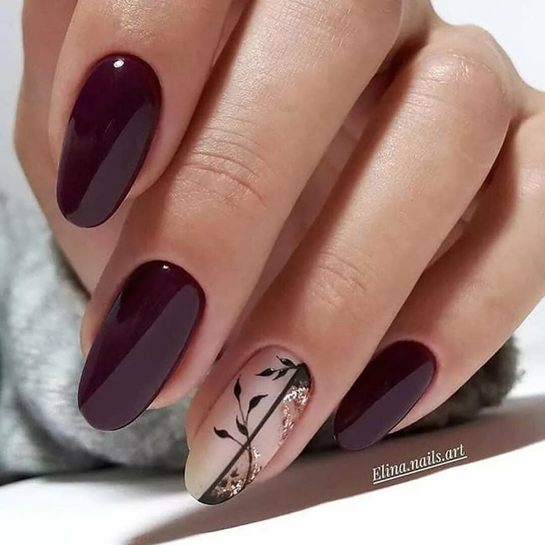 Еще один очень стильный вариант модного маникюра. Бордо способен заменить яркий и страстный красный. На этой базе отлично смотрятся золотые листики или классические оранжевые.