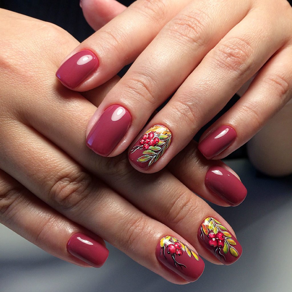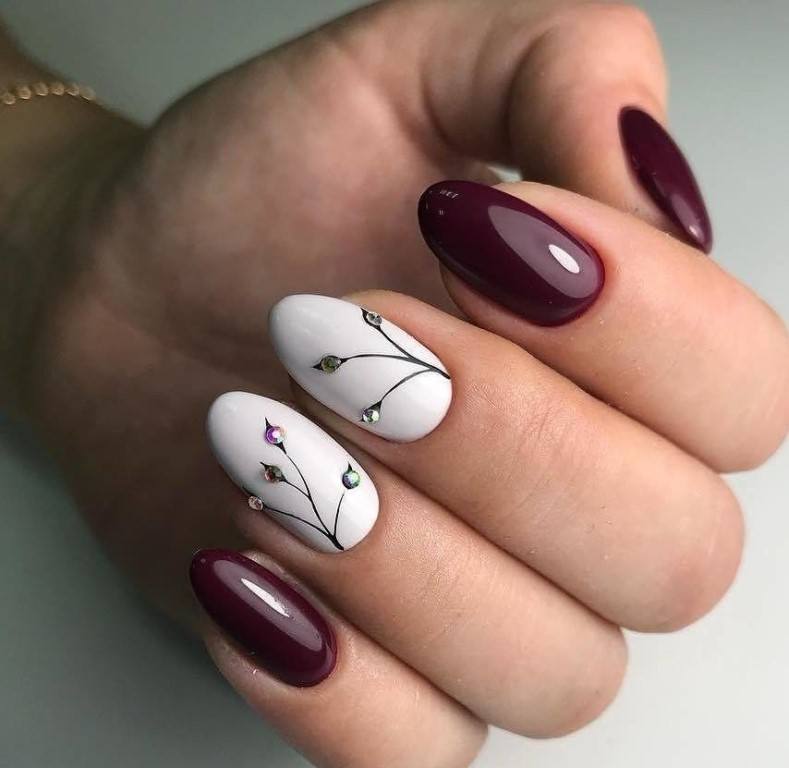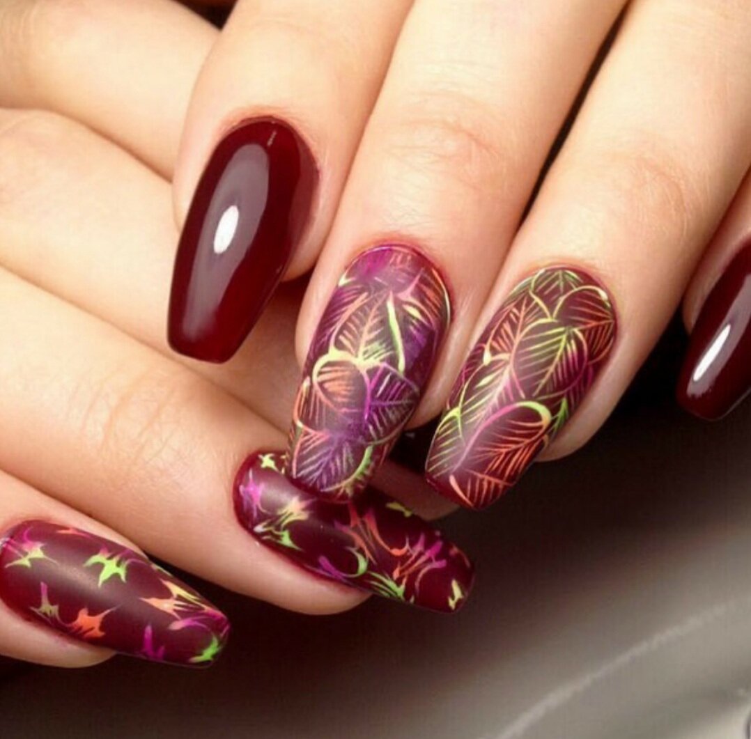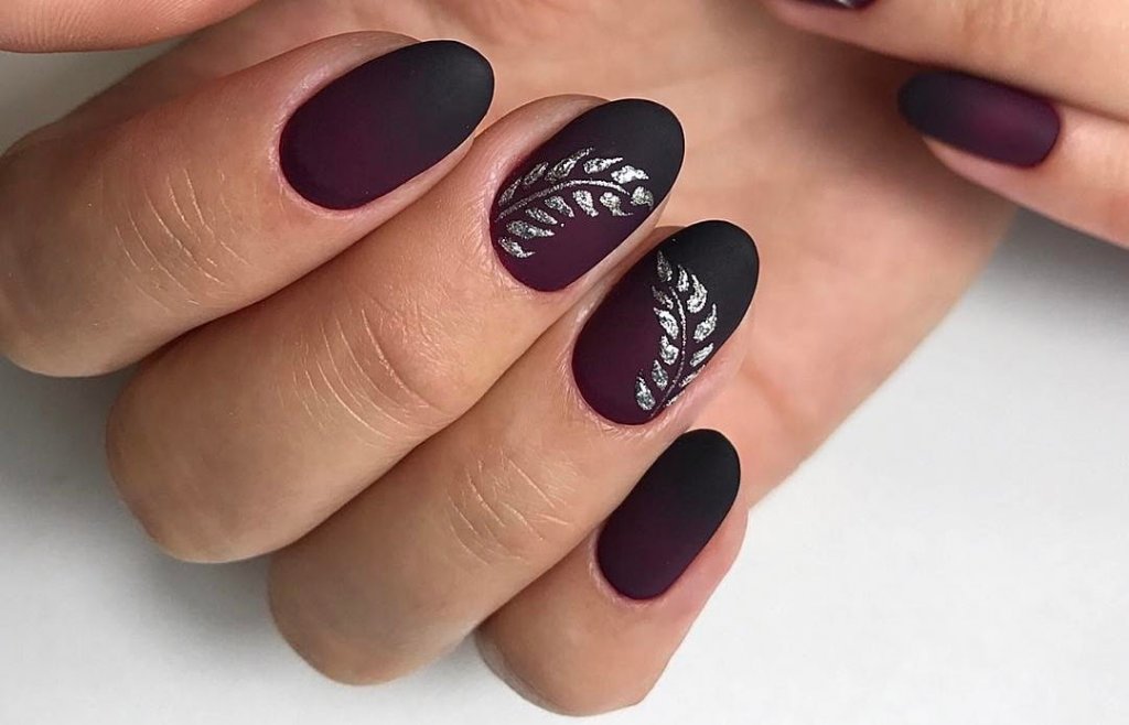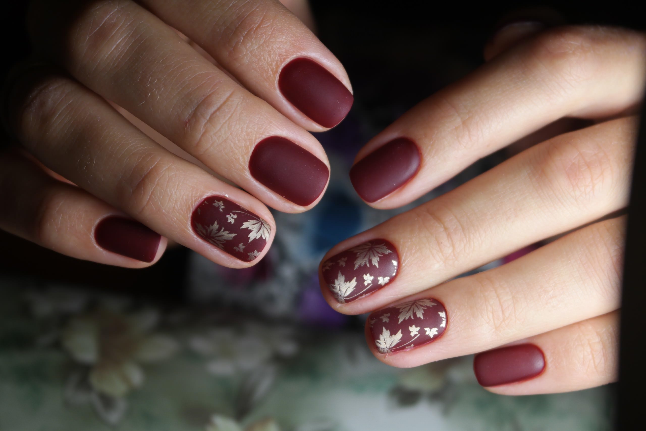 Еще один очень стильный вариант модного маникюра. Бордо способен заменить яркий и страстный красный. На этой базе отлично смотрятся золотые листики или классические оранжевые.