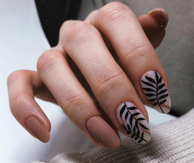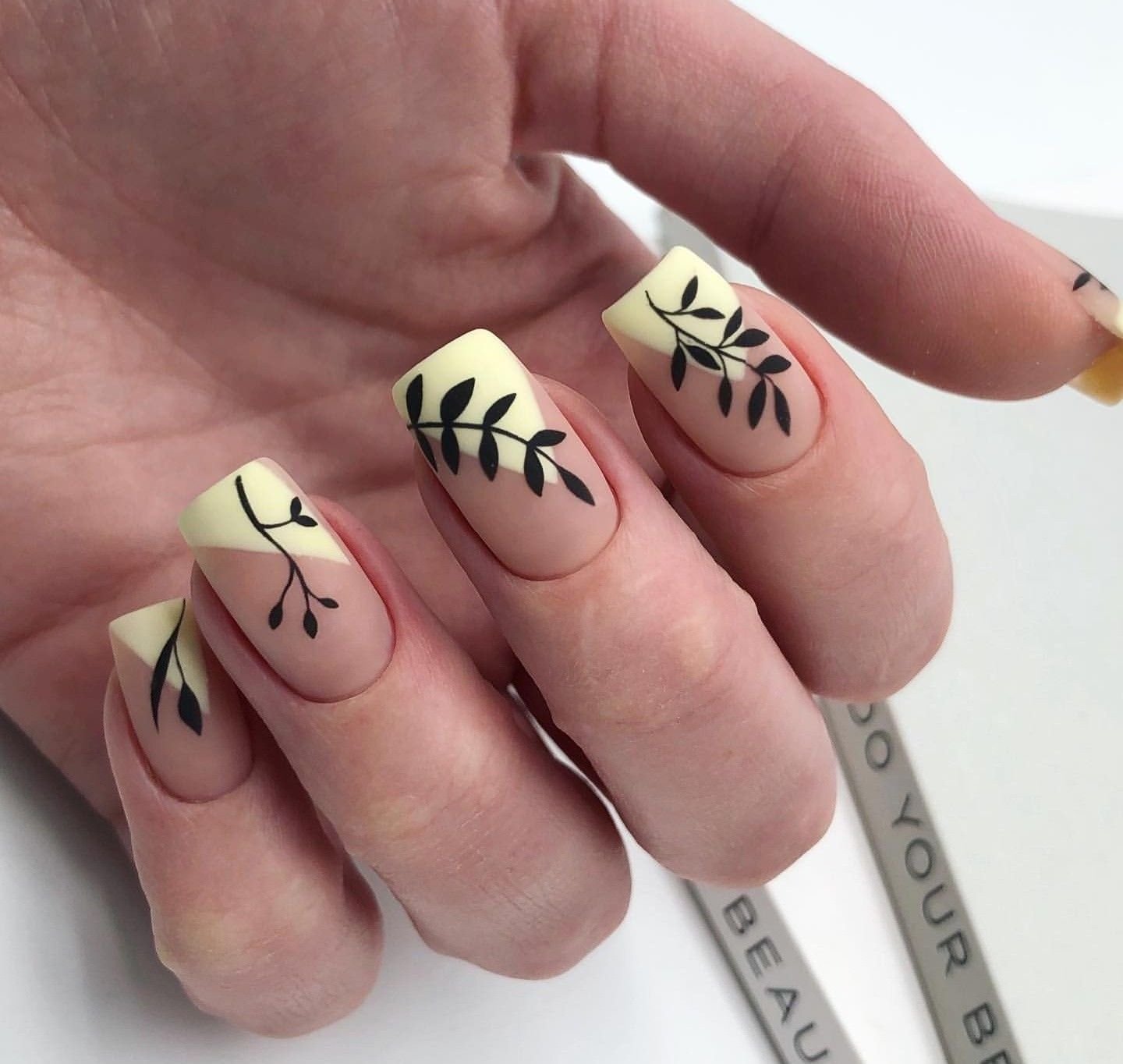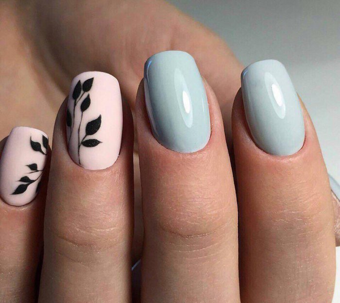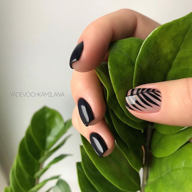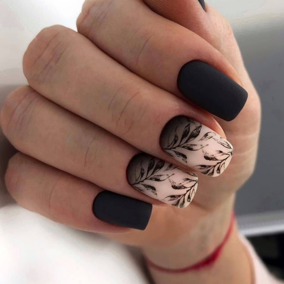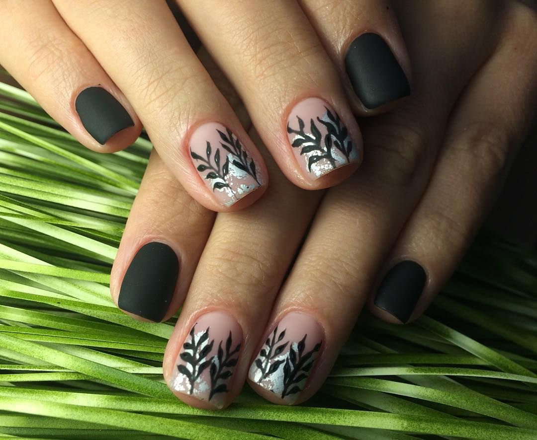 Совет: для любительниц стиля минимализм больше подойдет маникюр без лишних деталей. Сочетайте нейтральный фон с принтами черных листьев. Например, с классическим дизайном омбре в молочно-бежевом цвете. Если хочется больше романтики, смело выбирайте пастельный маникюр с черными листьями.