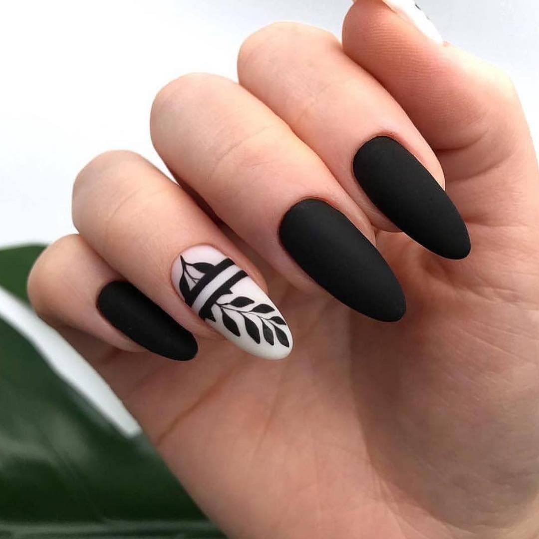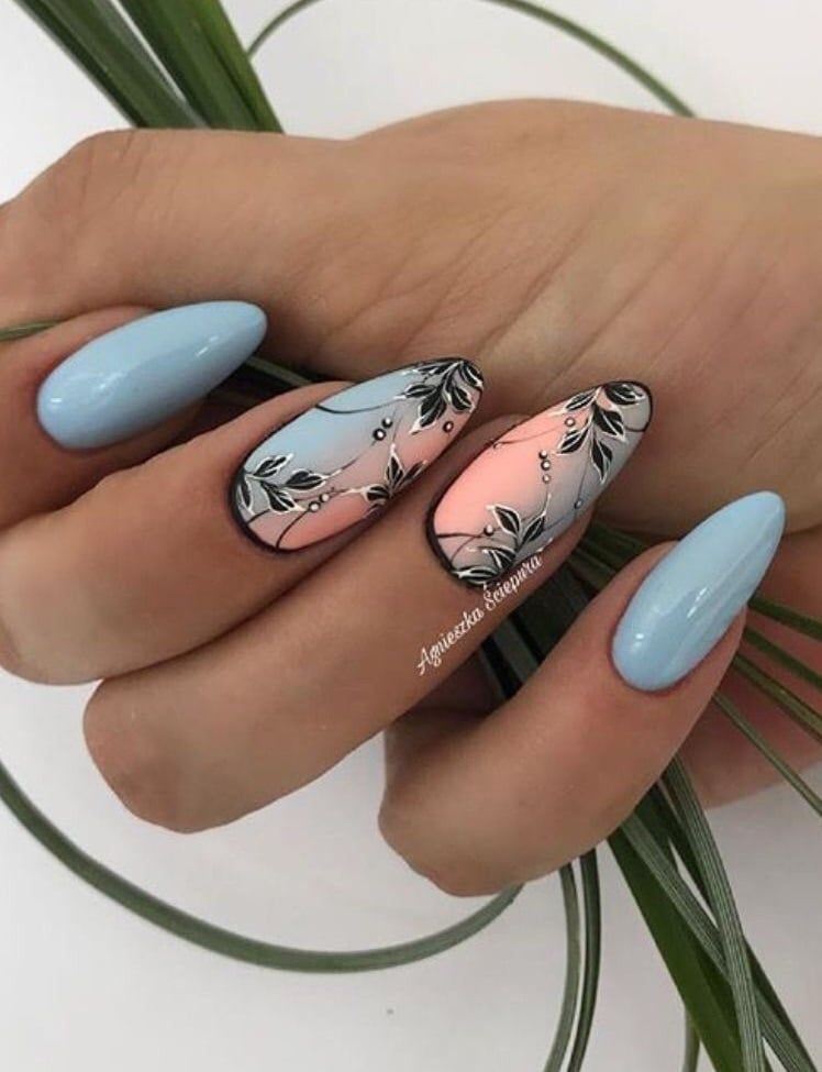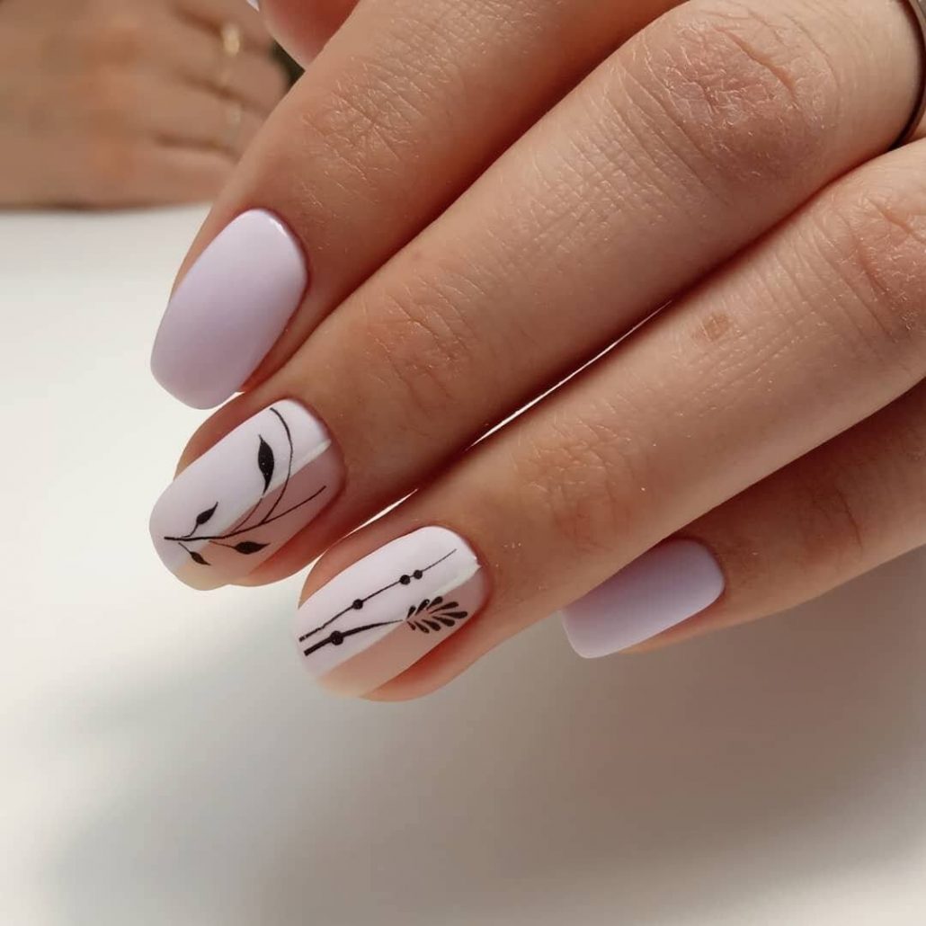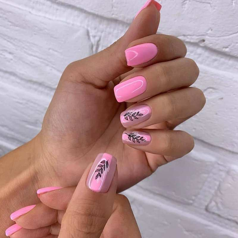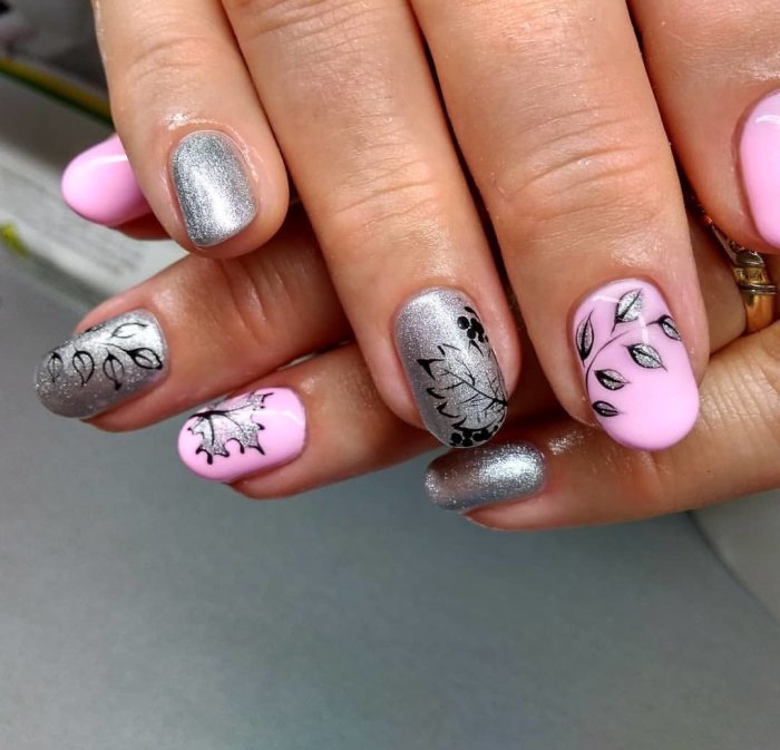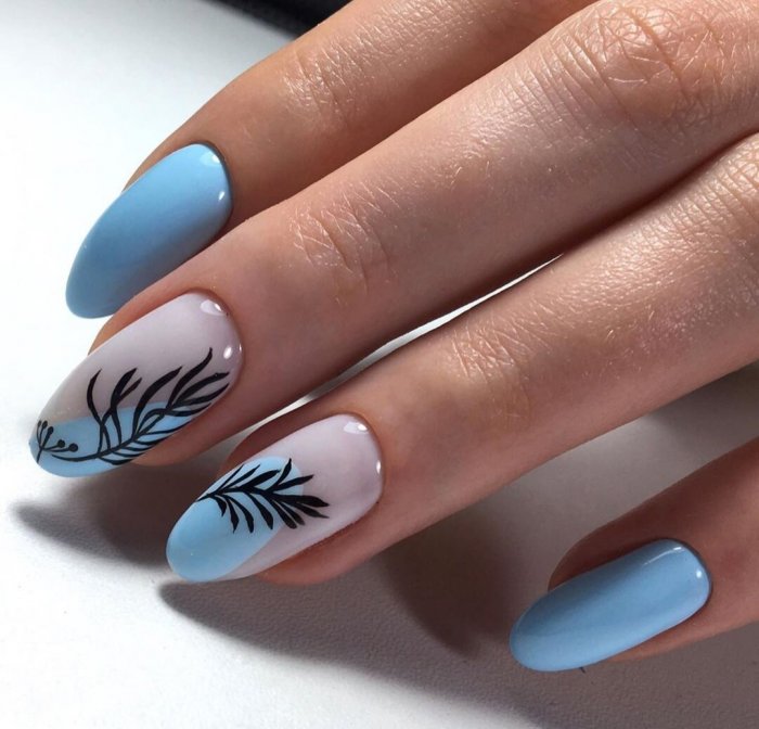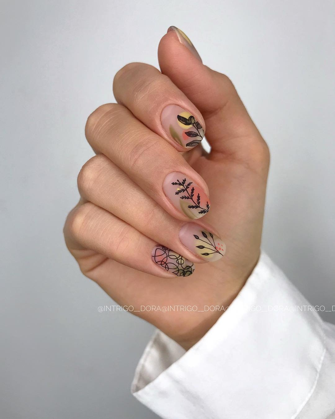 Совет: для любительниц стиля минимализм больше подойдет маникюр без лишних деталей. Сочетайте нейтральный фон с принтами черных листьев. Например, с классическим дизайном омбре в молочно-бежевом цвете. Если хочется больше романтики, смело выбирайте пастельный маникюр с черными листьями.