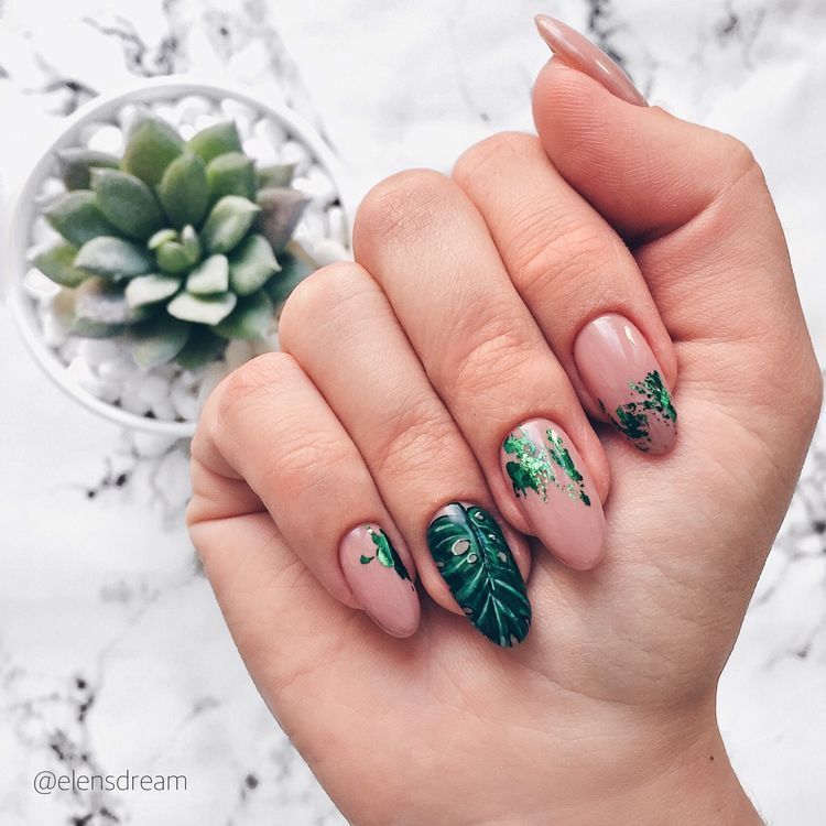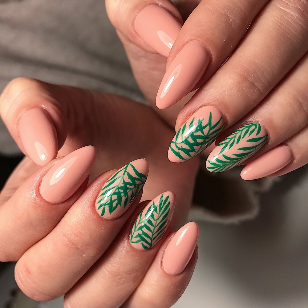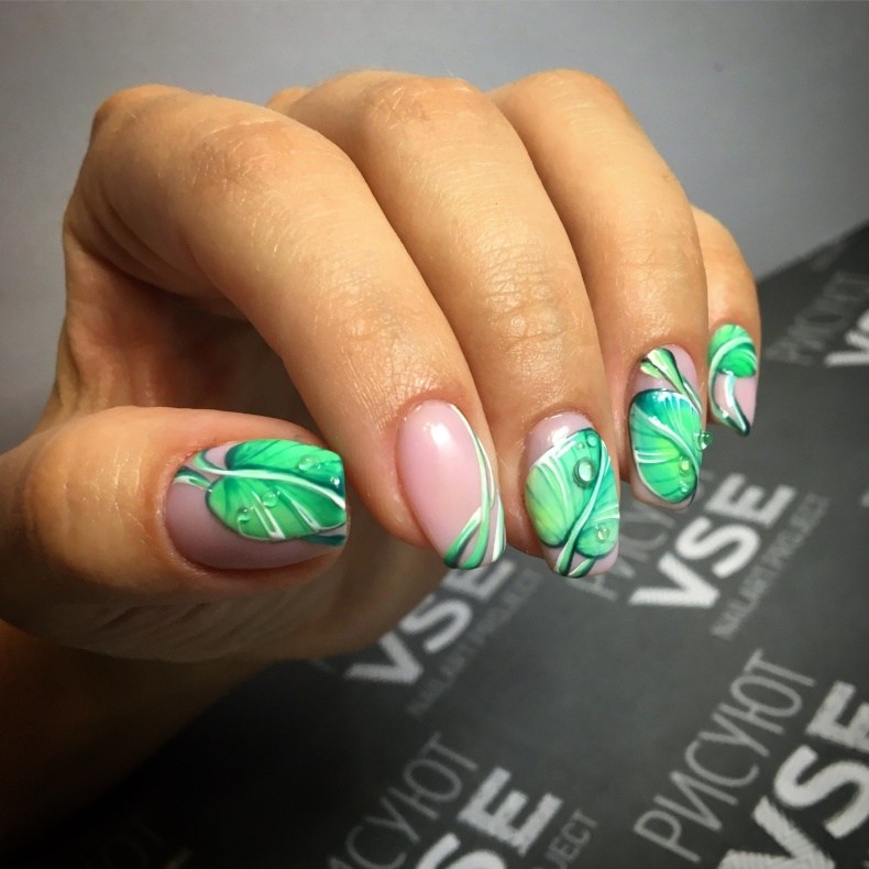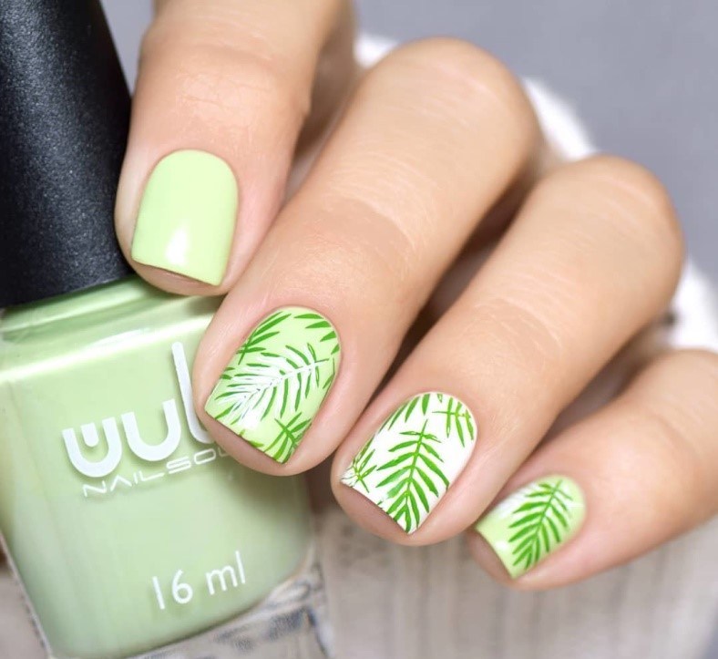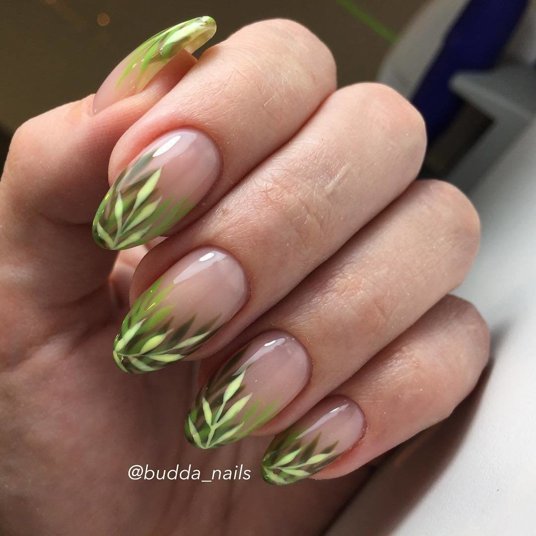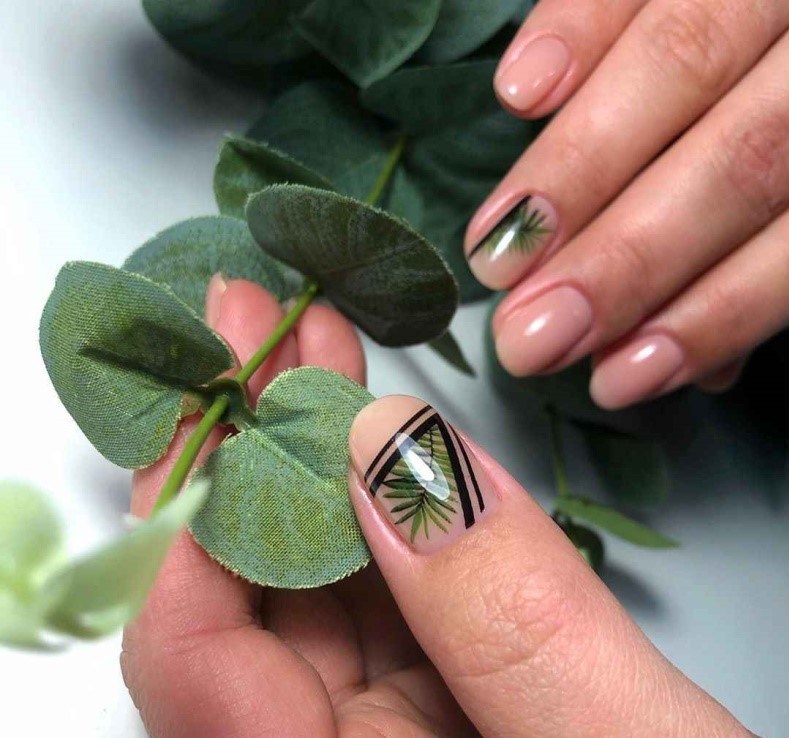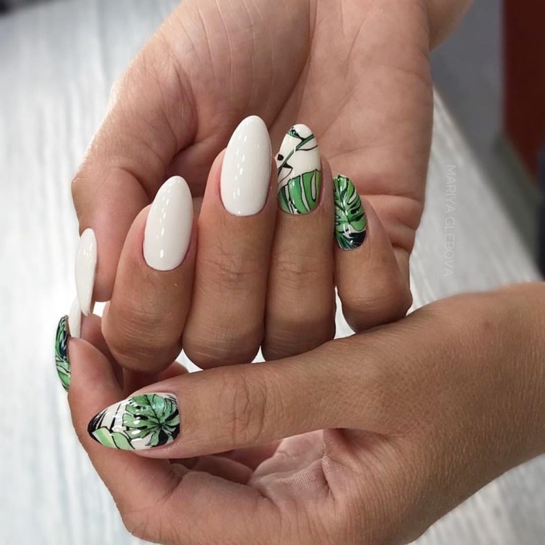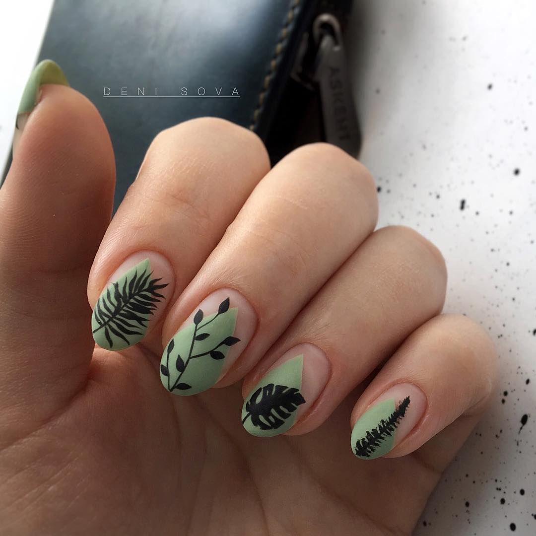 Зеленые сочные листочки преобразят любой дизайн. Даже обычные молочные ноготки будут выглядеть интересно и стильно. Такой маникюр универсален и подходит не только для кэжуал стиля, но и офисного. Листья можно нарисовать или нанести на ногти с помощью трафарета, слайдера или стемпинга.