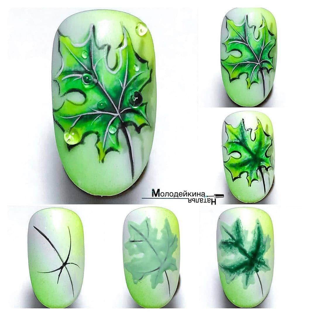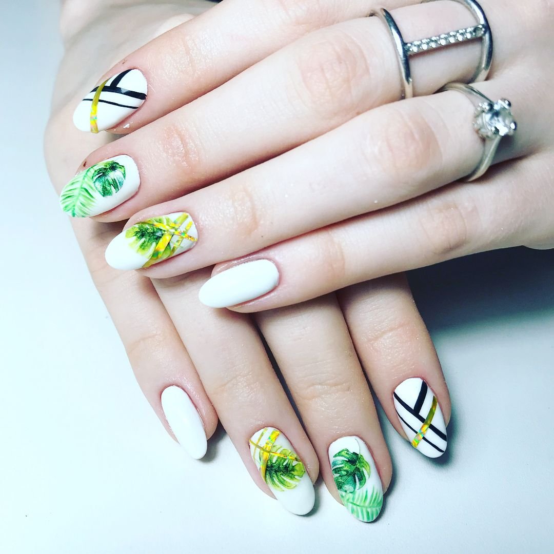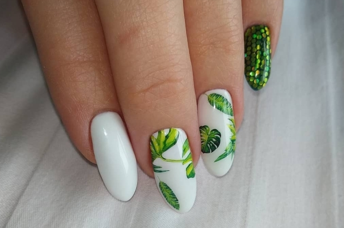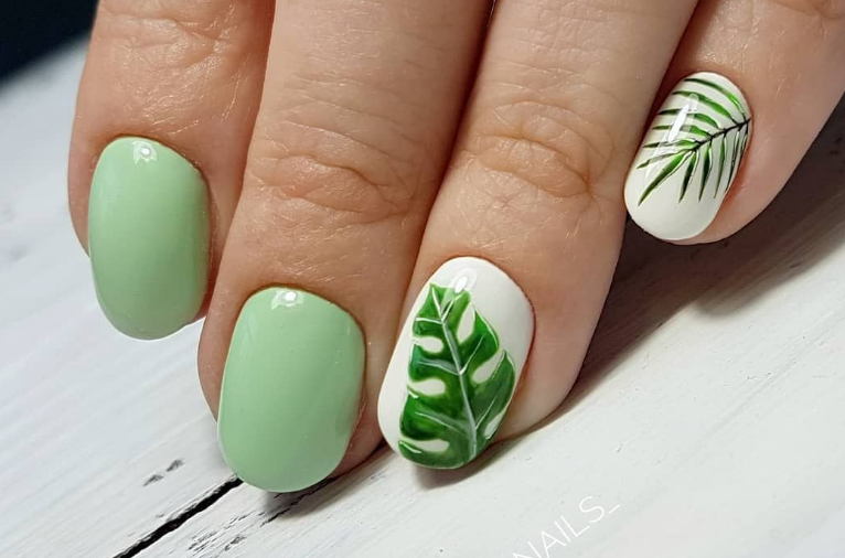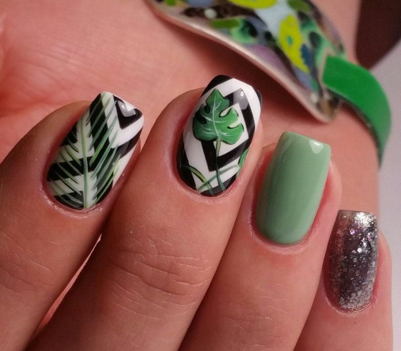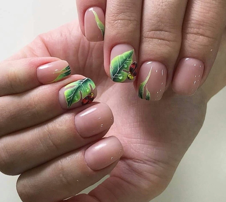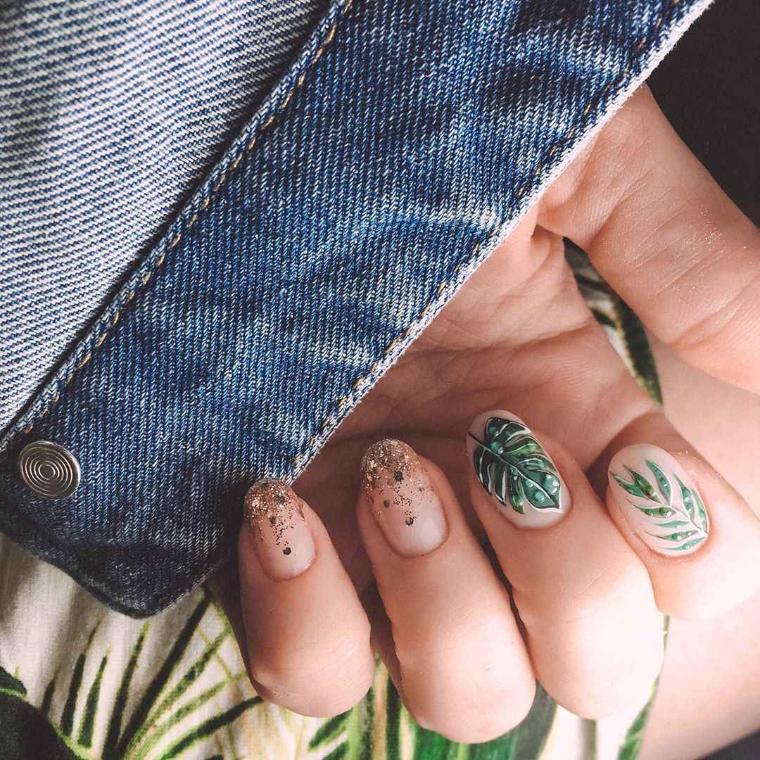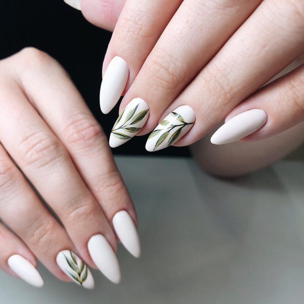 Зеленые сочные листочки преобразят любой дизайн. Даже обычные молочные ноготки будут выглядеть интересно и стильно. Такой маникюр универсален и подходит не только для кэжуал стиля, но и офисного. Листья можно нарисовать или нанести на ногти с помощью трафарета, слайдера или стемпинга.