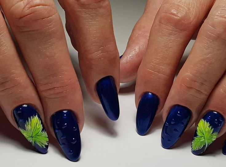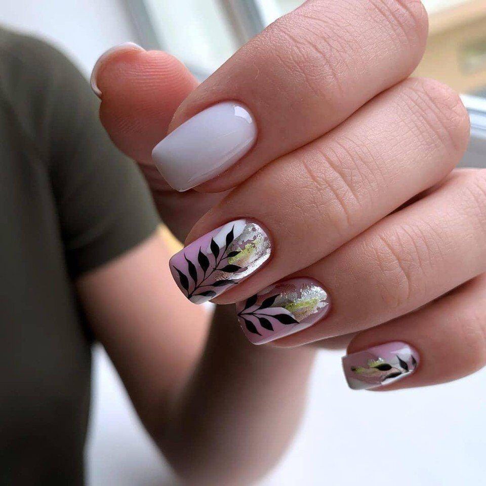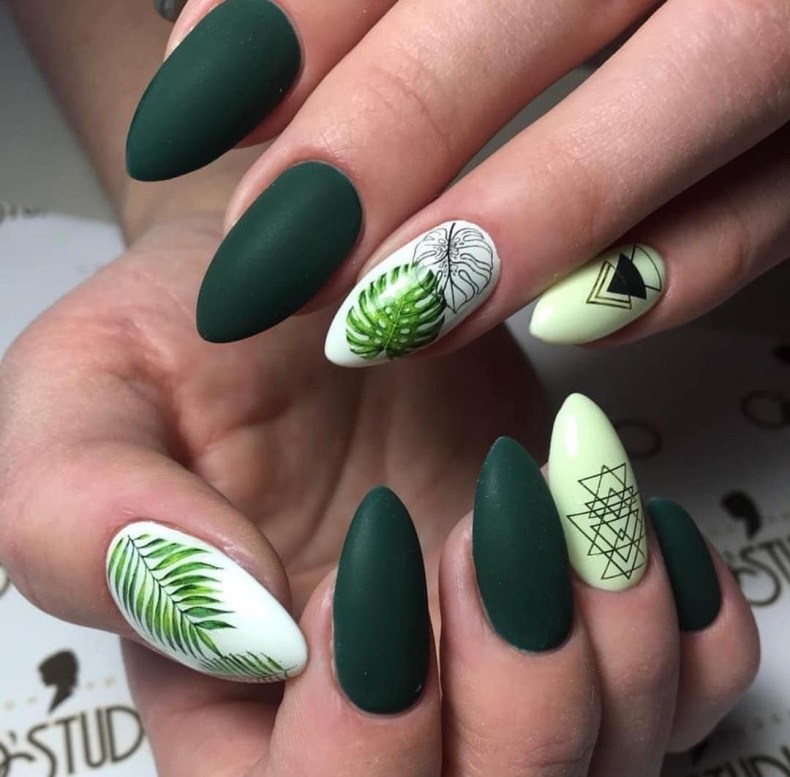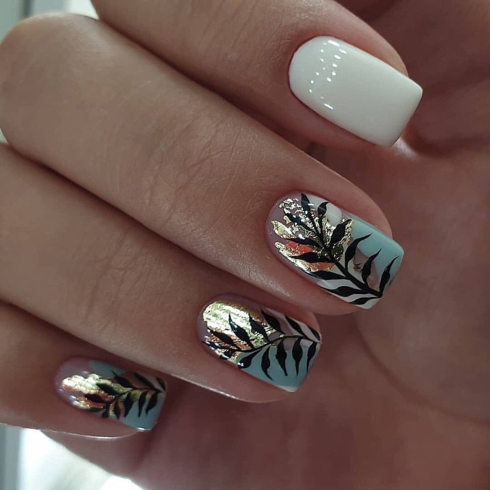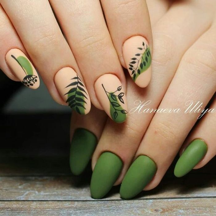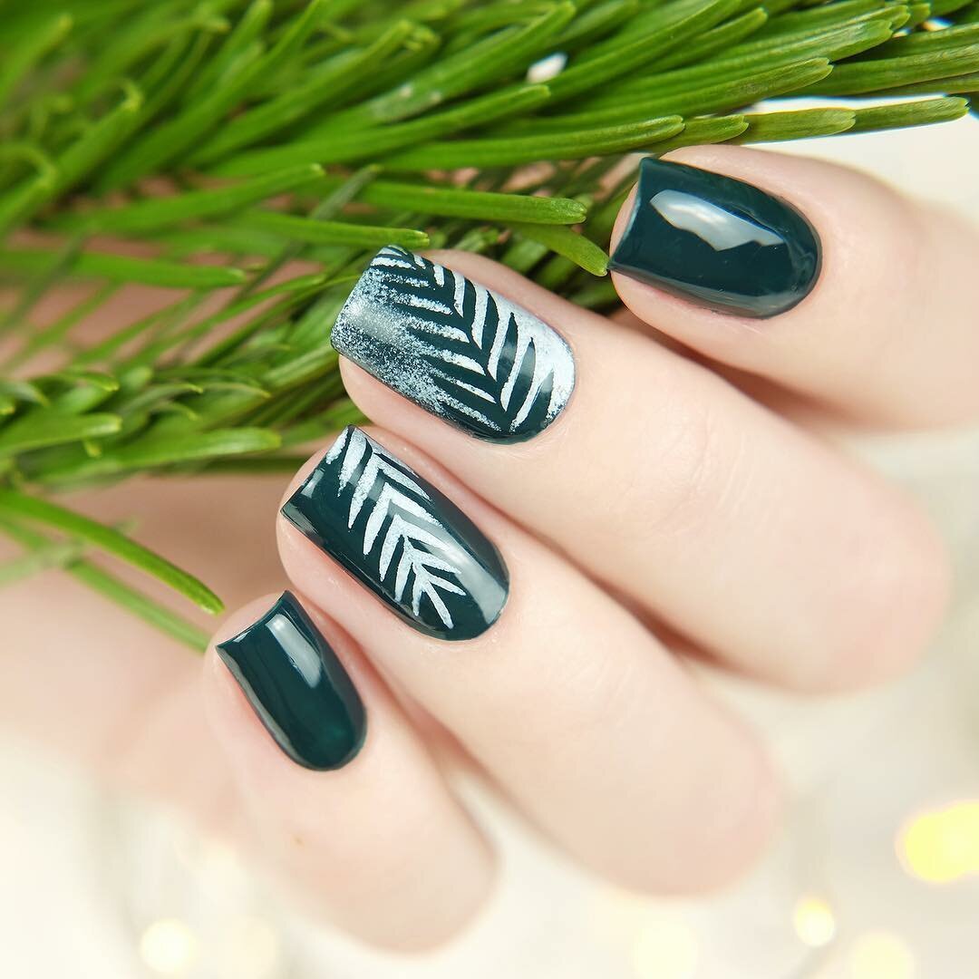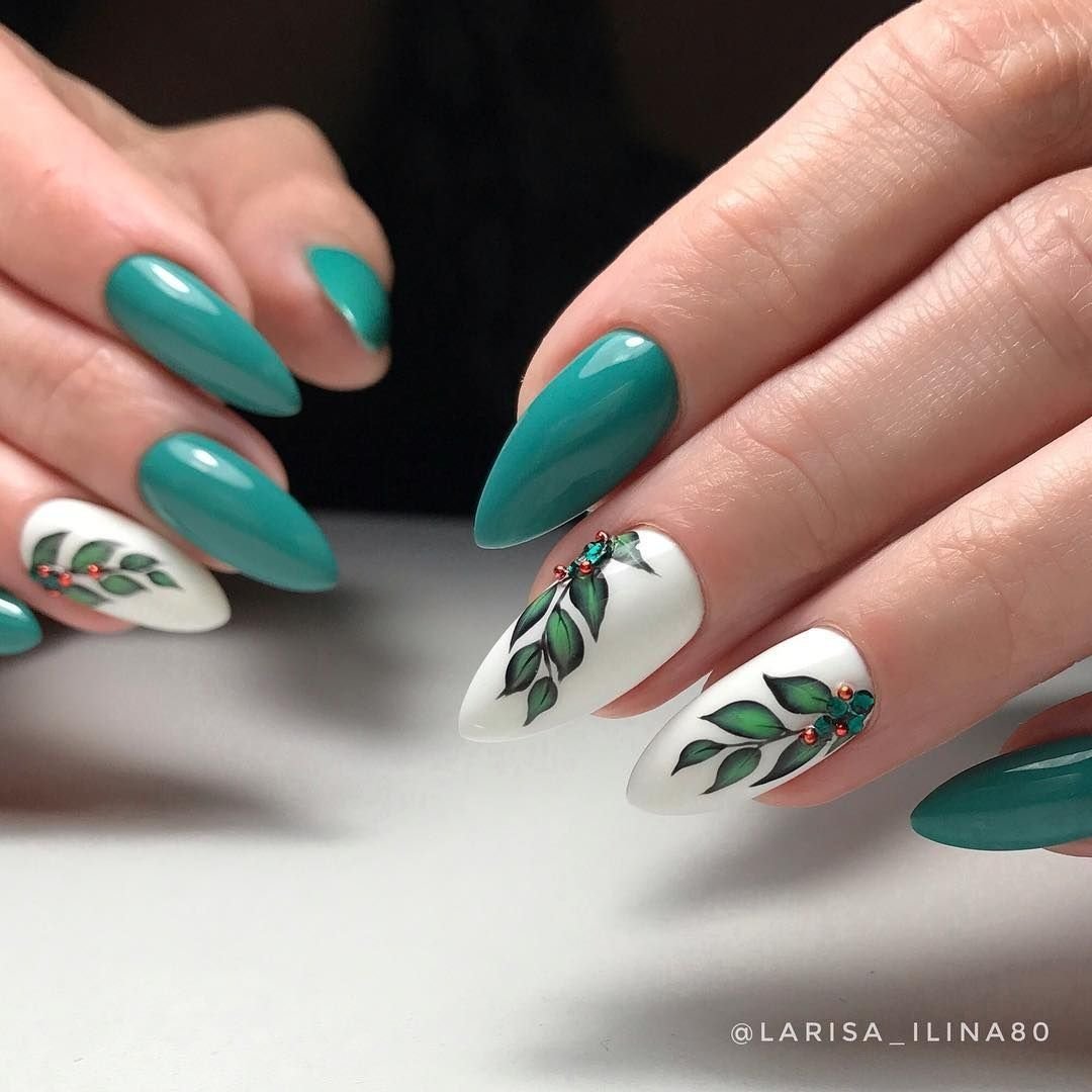 Зеленые сочные листочки преобразят любой дизайн. Даже обычные молочные ноготки будут выглядеть интересно и стильно. Такой маникюр универсален и подходит не только для кэжуал стиля, но и офисного. Листья можно нарисовать или нанести на ногти с помощью трафарета, слайдера или стемпинга.