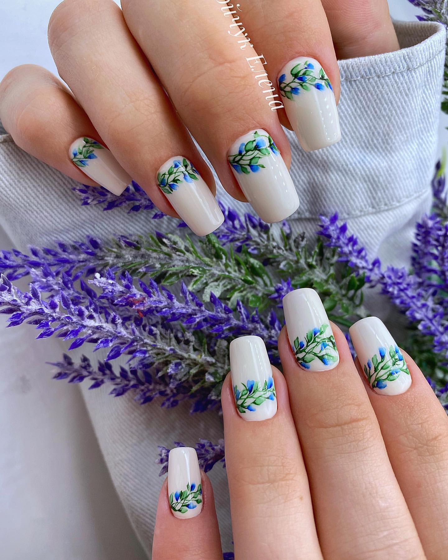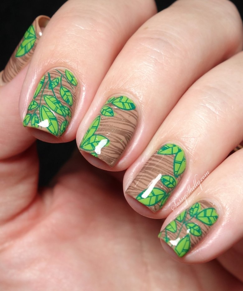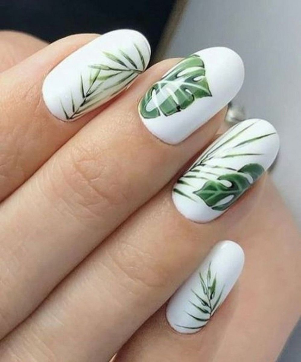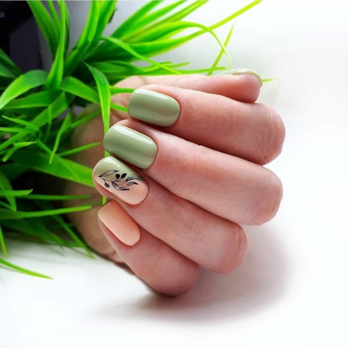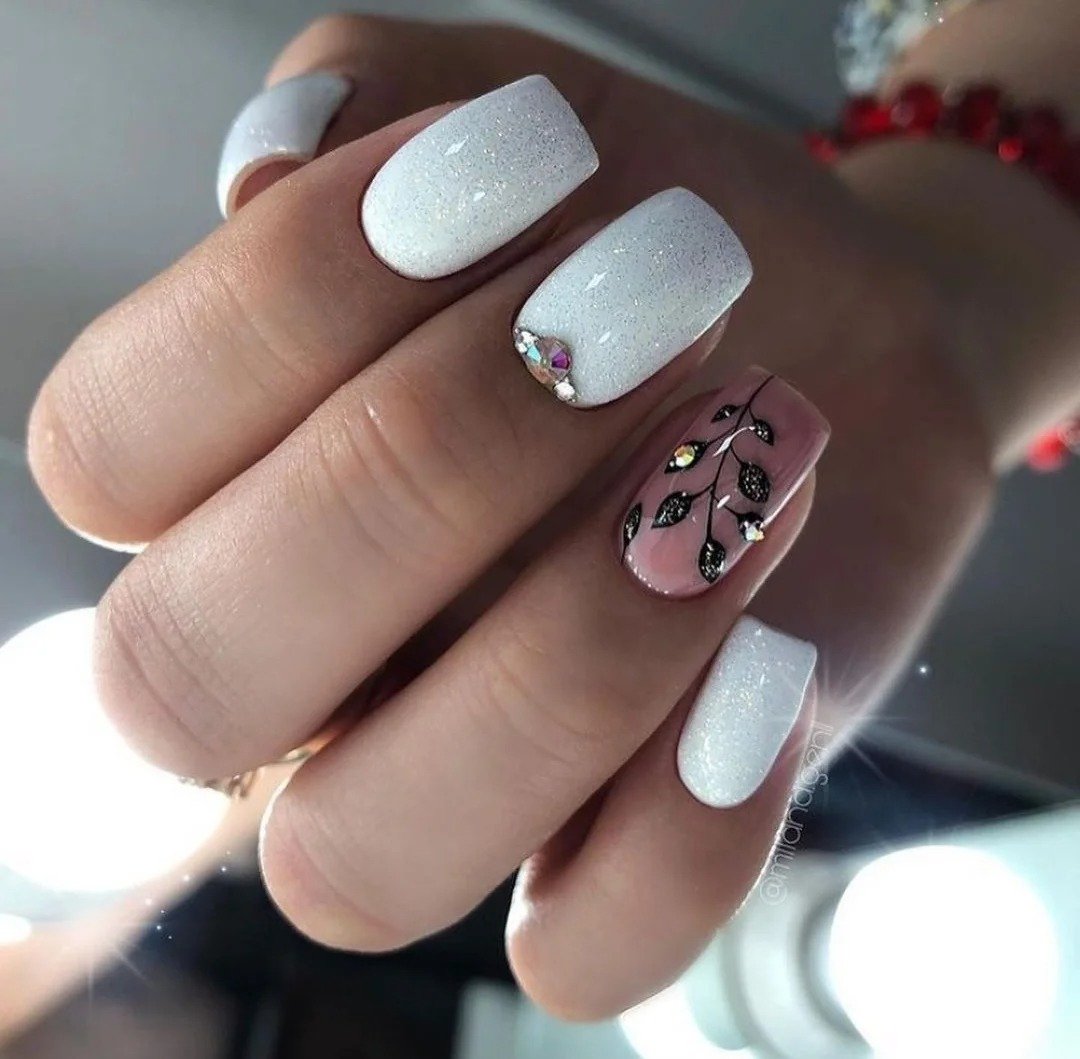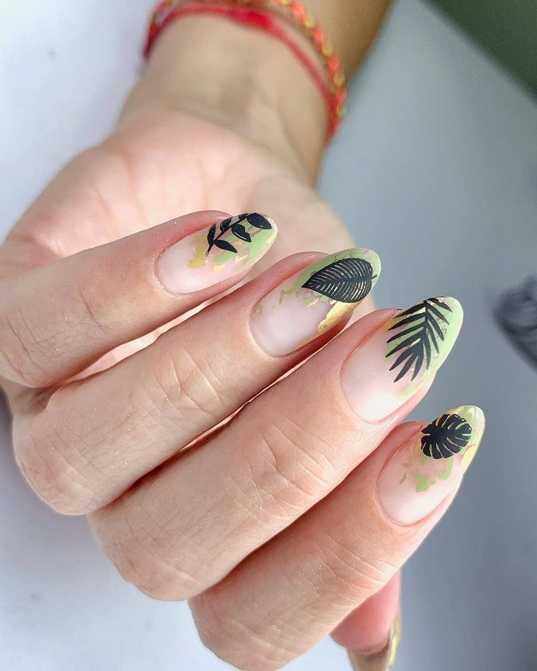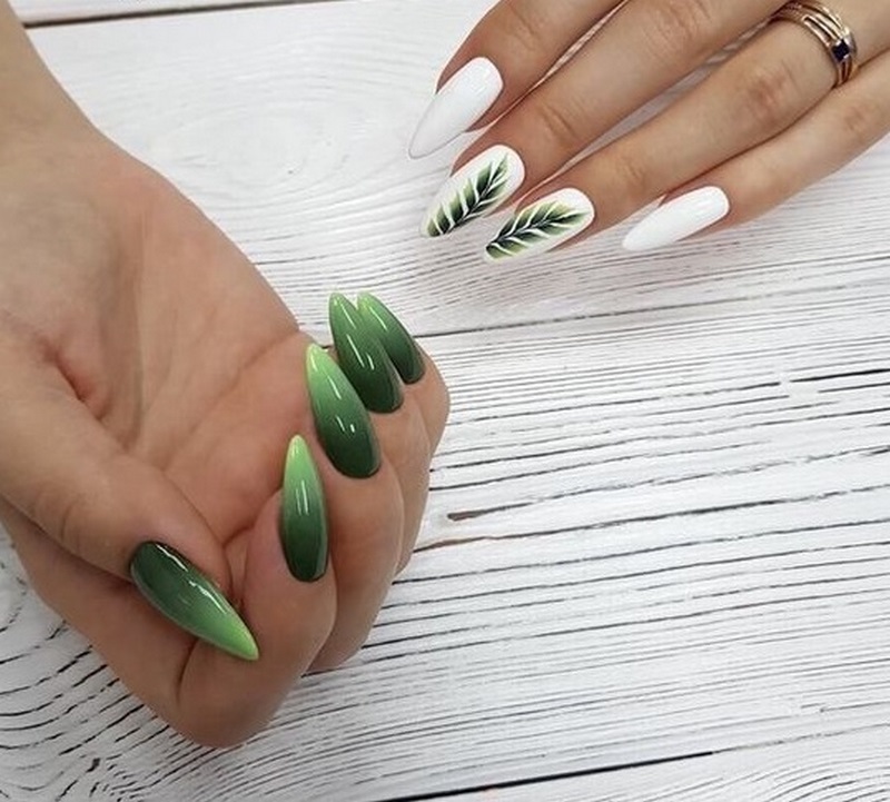 Зеленые сочные листочки преобразят любой дизайн. Даже обычные молочные ноготки будут выглядеть интересно и стильно. Такой маникюр универсален и подходит не только для кэжуал стиля, но и офисного. Листья можно нарисовать или нанести на ногти с помощью трафарета, слайдера или стемпинга.