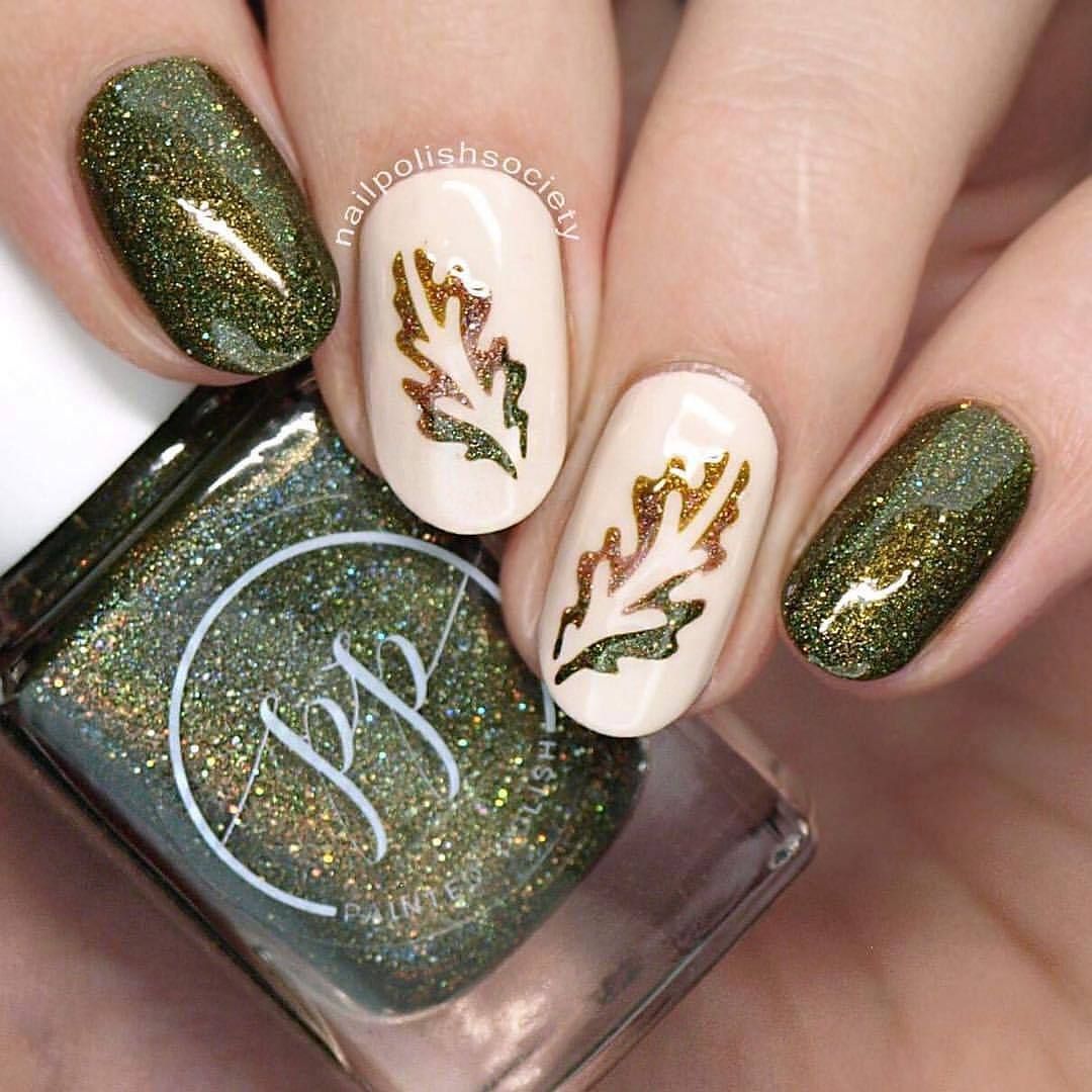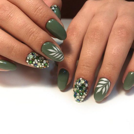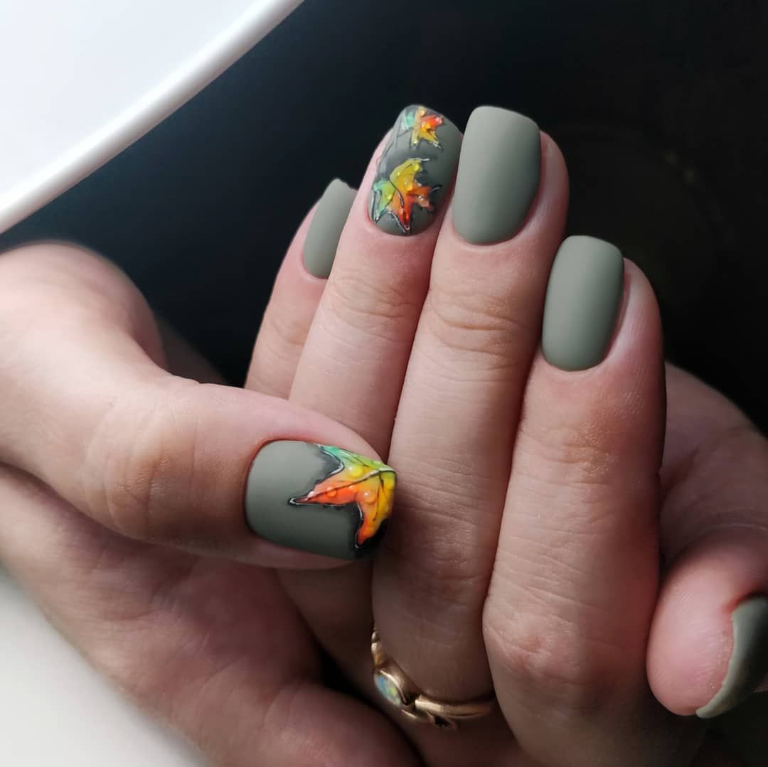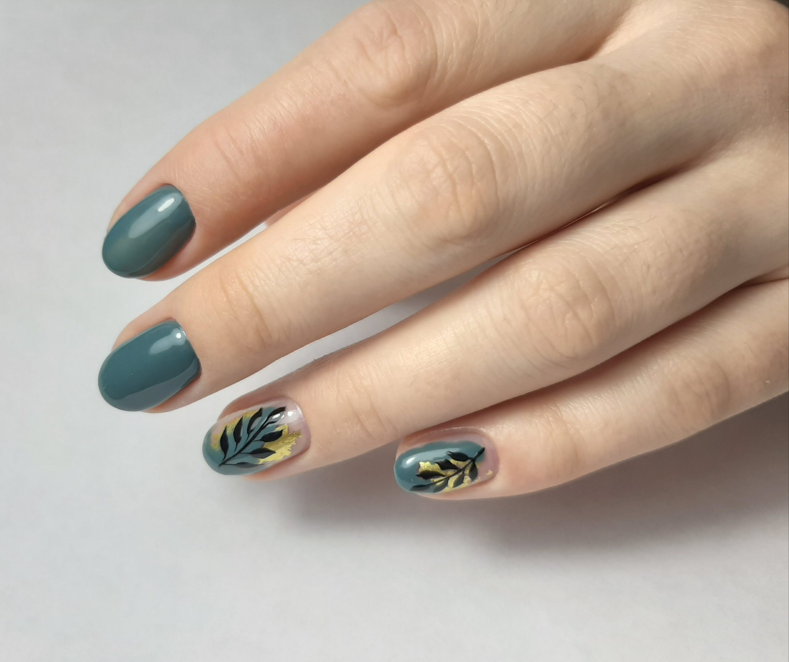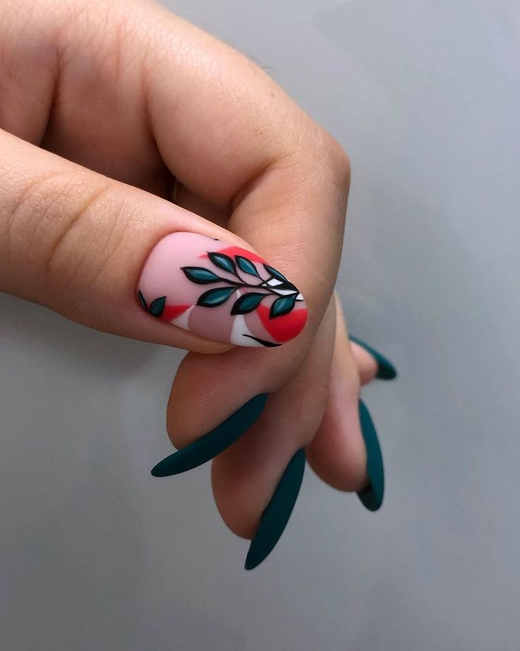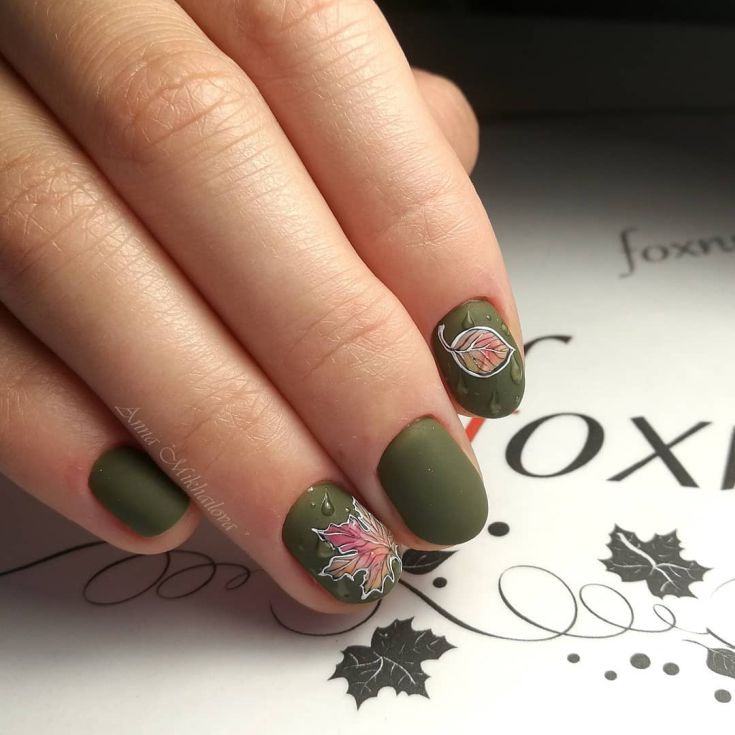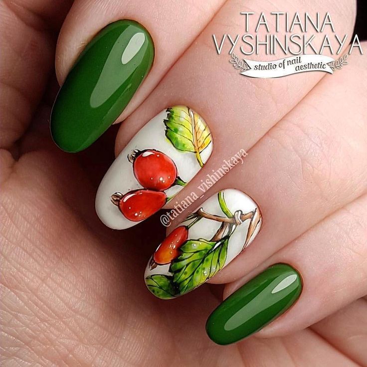 Зеленый цвет имеет богатейшую палитру, с помощью которой можно создать летний, осенний, зимний или весенний маникюр. Естественно, создавая дизайн с листьями необходимо выбирать контрастные оттенки. Поэтому зеленый маникюр лучше всего подходит для осеннего периода. На базе в оливковом, глубоком зеленом оттенке или хаки выигрышно смотрятся оранжевые и красные листья, которые дарит нам осень. И речь идет не только о кленовых, но и популярных в дизайне рябиновых.