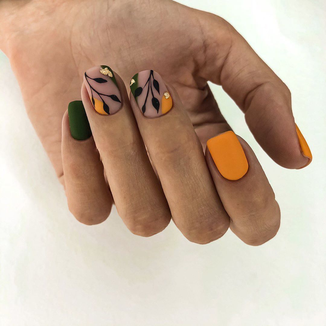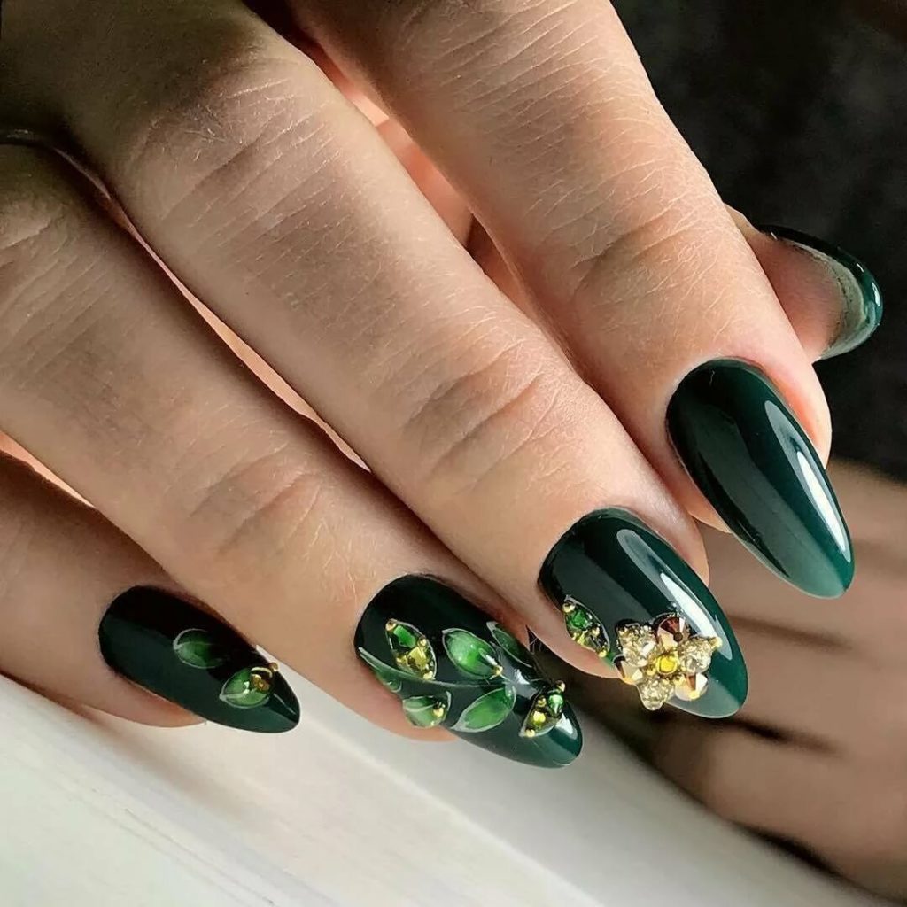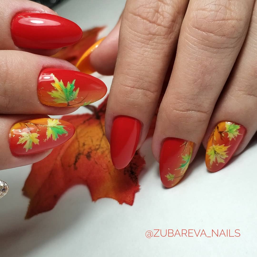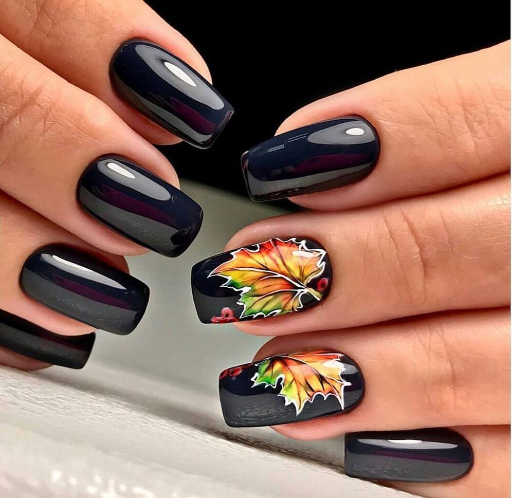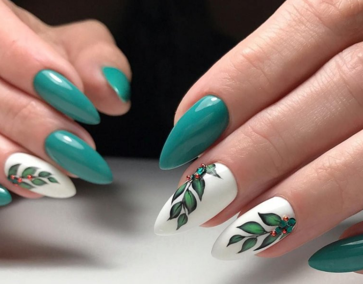 Зеленый цвет имеет богатейшую палитру, с помощью которой можно создать летний, осенний, зимний или весенний маникюр. Естественно, создавая дизайн с листьями необходимо выбирать контрастные оттенки. Поэтому зеленый маникюр лучше всего подходит для осеннего периода. На базе в оливковом, глубоком зеленом оттенке или хаки выигрышно смотрятся оранжевые и красные листья, которые дарит нам осень. И речь идет не только о кленовых, но и популярных в дизайне рябиновых.
