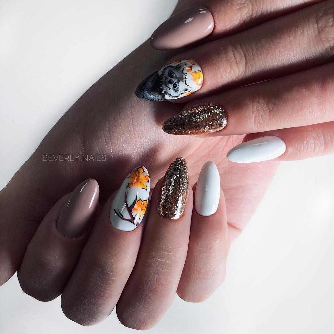 Совет: вместо нюдовой базы можно использовать молочную. Это идеальная база для сложных рисунков. Многие мастера советуют использовать золотой шиммер, который символизирует последние теплые лучики солнца перед наступлением холодного времени года.
