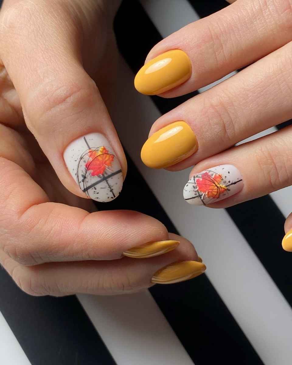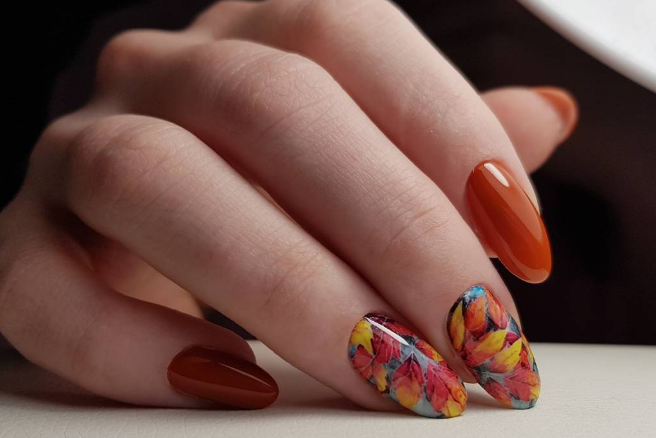 Листья клена в маникюре отлично смотрятся как на контрастной базе, так и сходной. Часто кленовый лист сочетается с другими декорами и техниками — фольгой, перепелиным яйцом или негативным пространством.