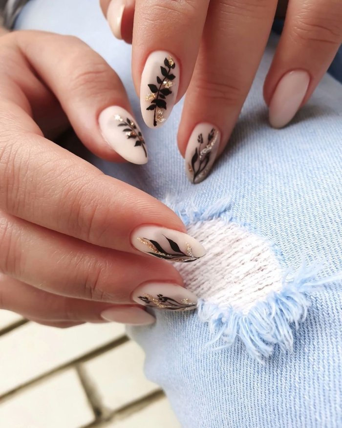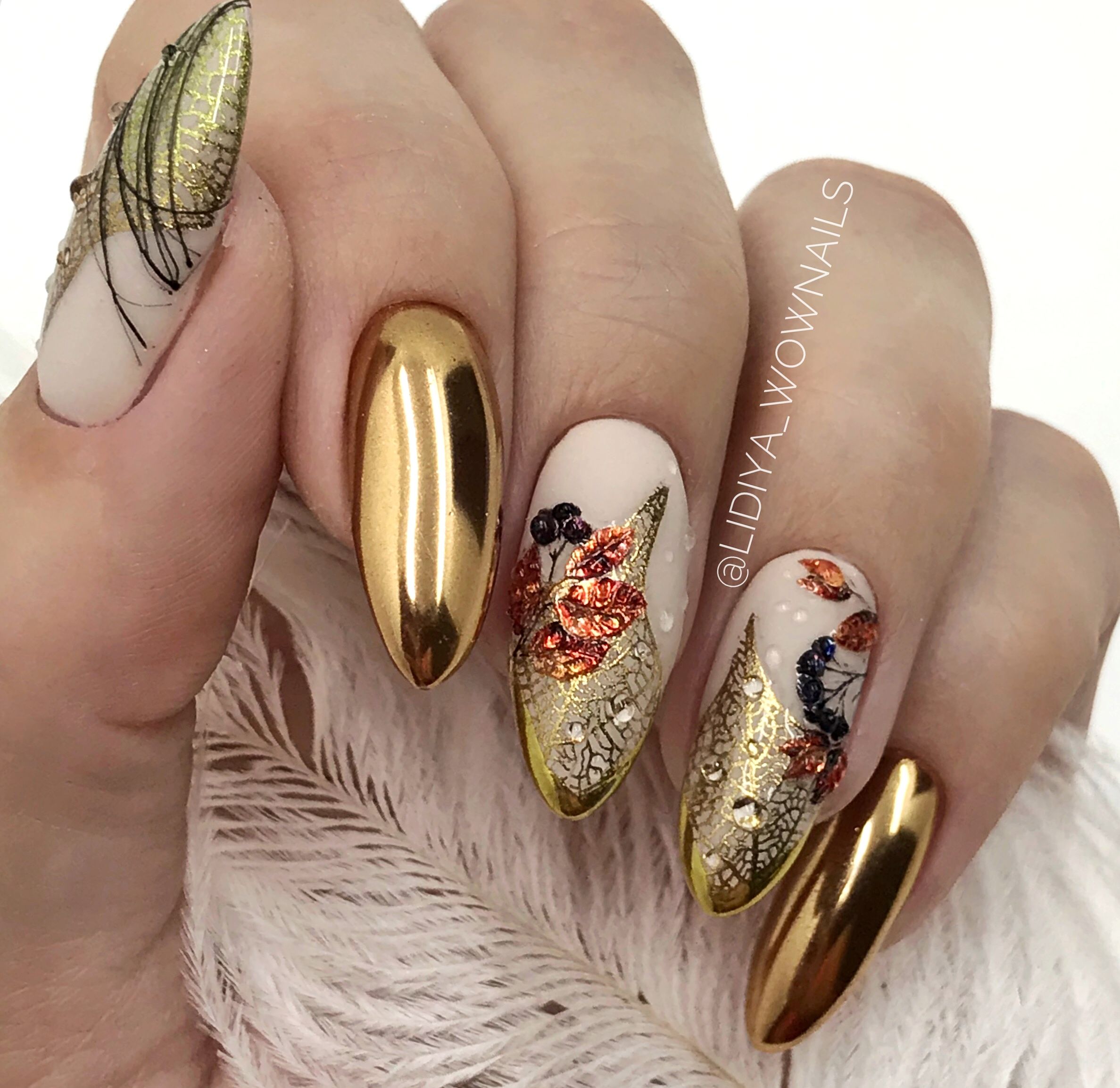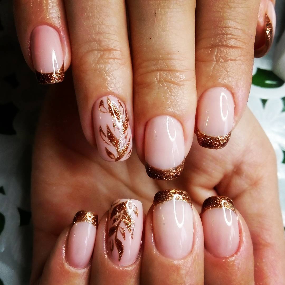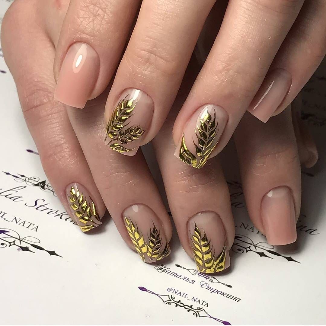 Если хотите, чтобы дизайн ваших ноготков был заметен, выбирайте нюдовую базу. Самый простой и универсальный вариант: нюдовая база, золотые листья, контрастная коричневая прорисовка и немного золотой пудры.