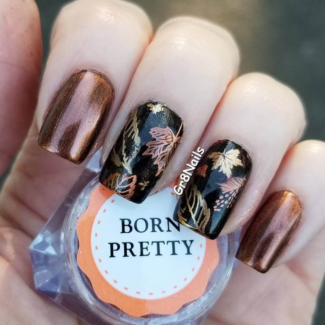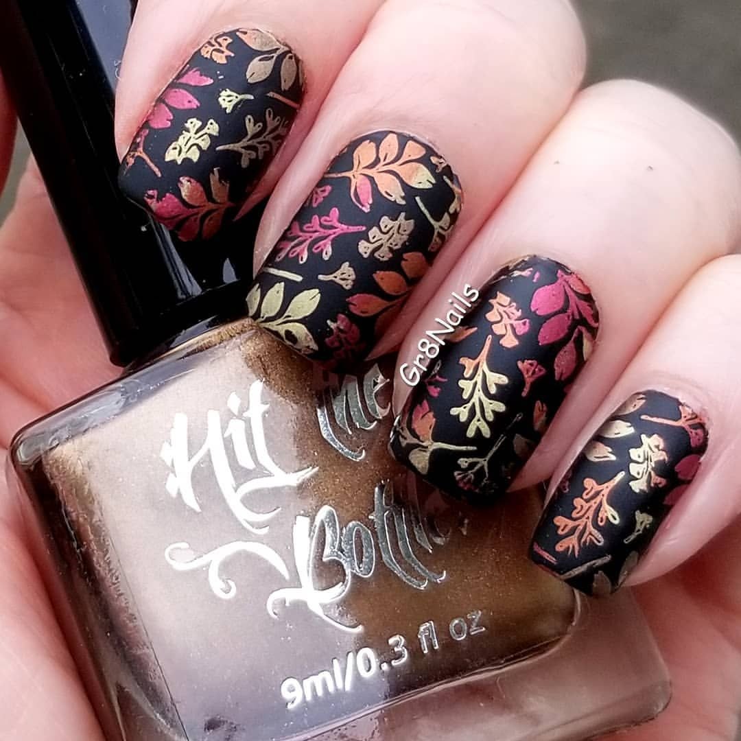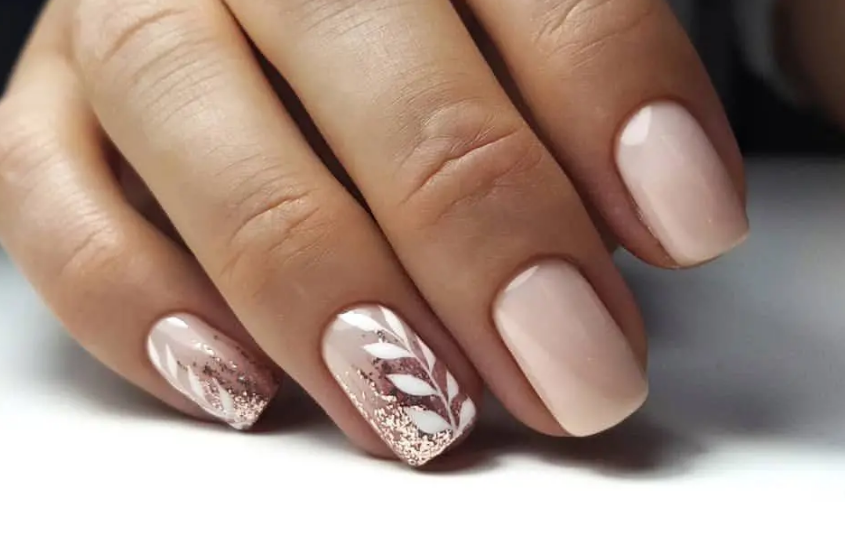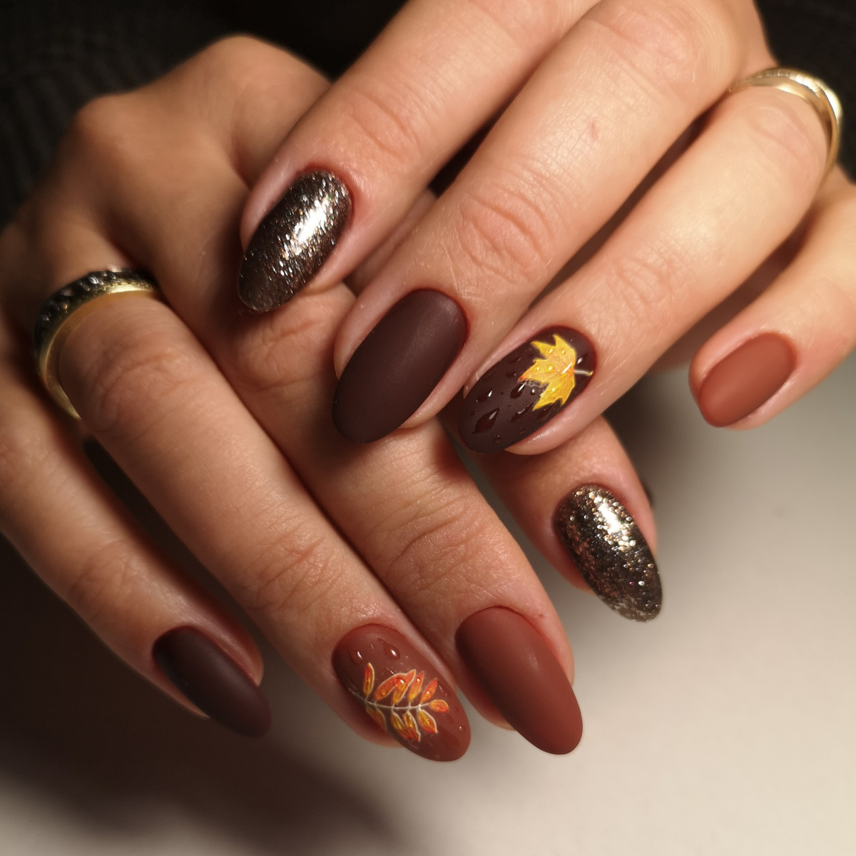 Если хотите, чтобы дизайн ваших ноготков был заметен, выбирайте нюдовую базу. Самый простой и универсальный вариант: нюдовая база, золотые листья, контрастная коричневая прорисовка и немного золотой пудры.