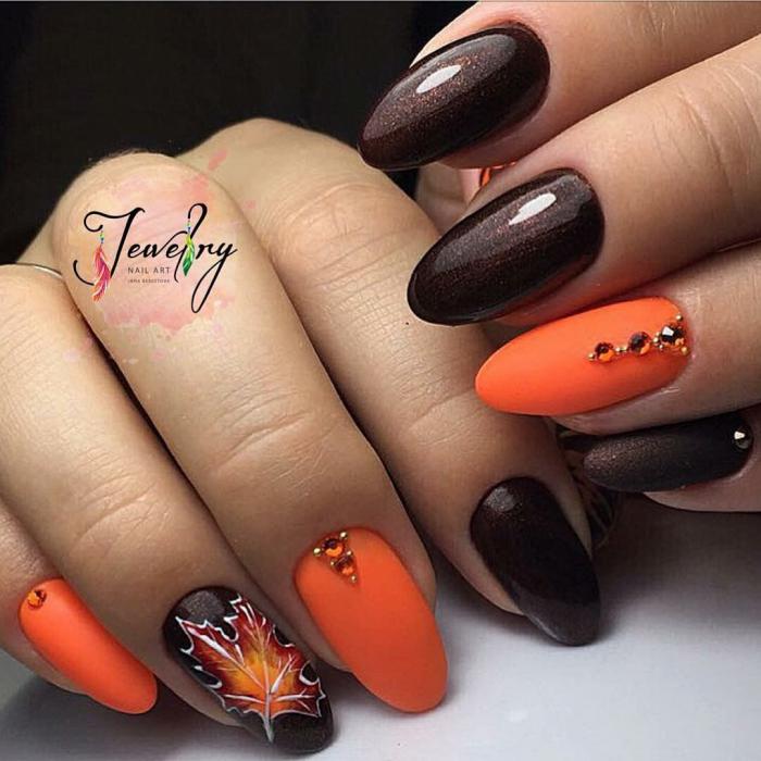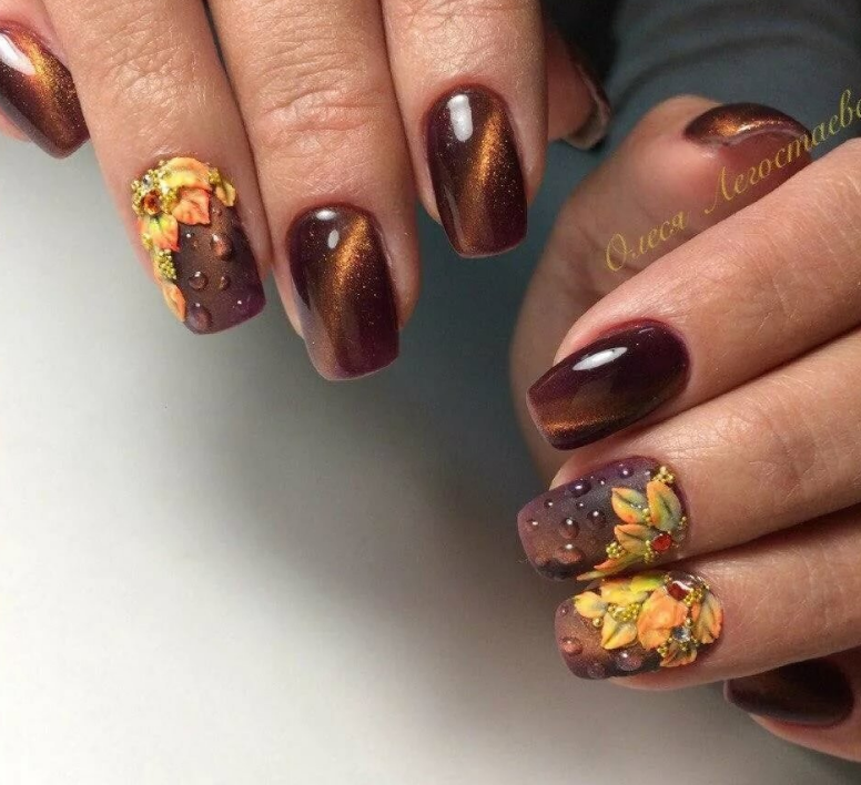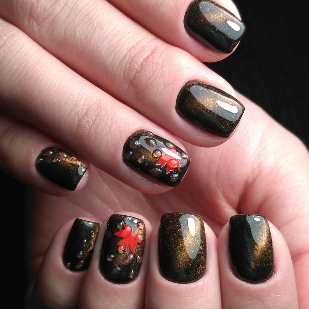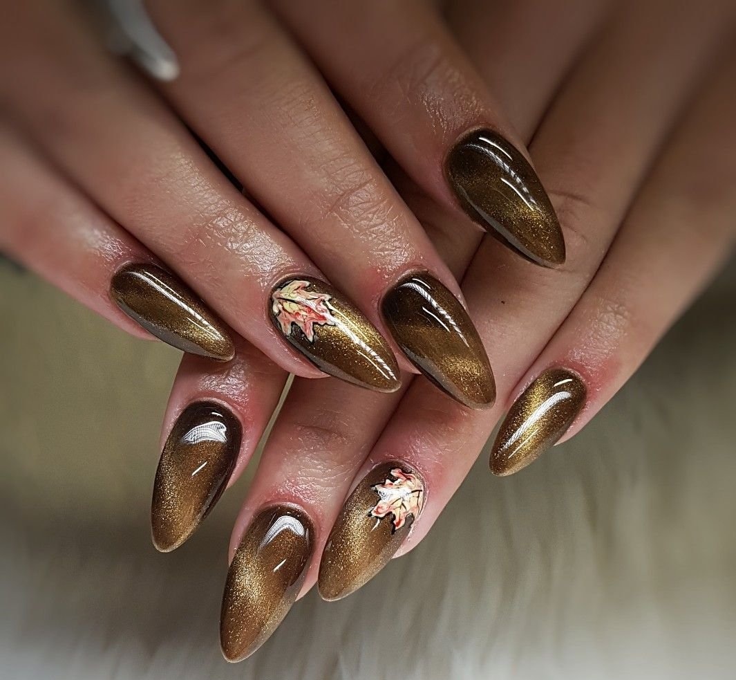 Отличный пример для осеннего дизайна ногтей — сочетание мерцающих ногтей с эффектом кошачий глаз и листьев. Выбирайте контрастные цвета лака, чтобы рисунок был хорошо заметен. Листочки можно нарисовать или использовать трафарет.