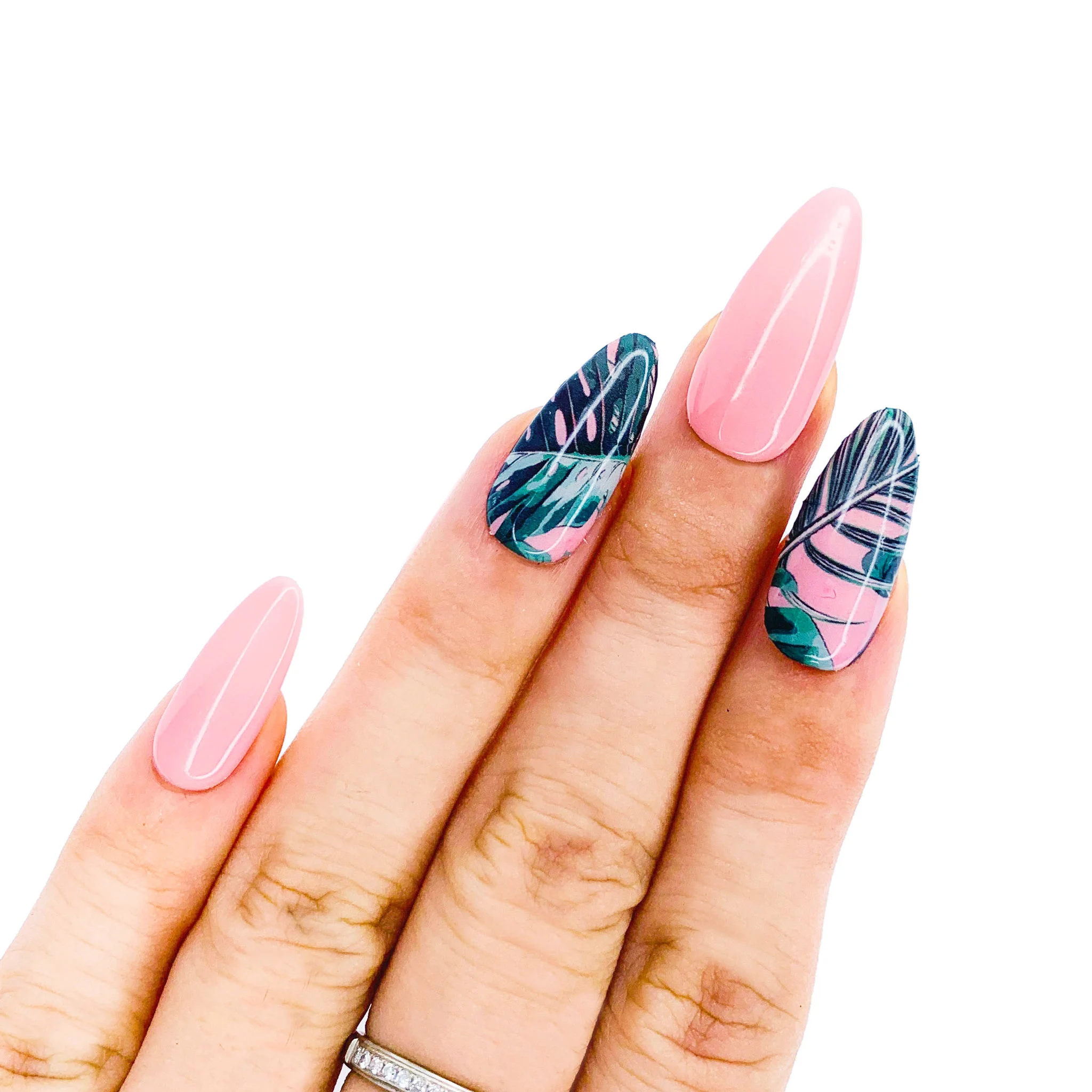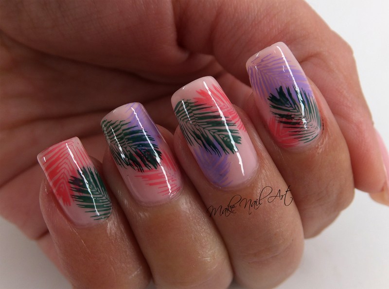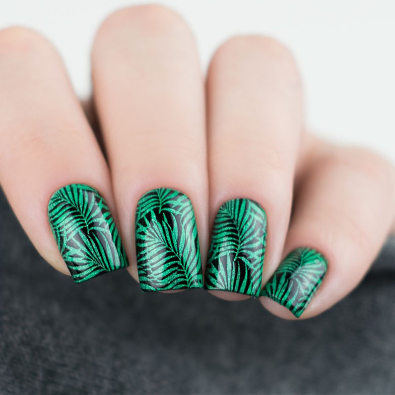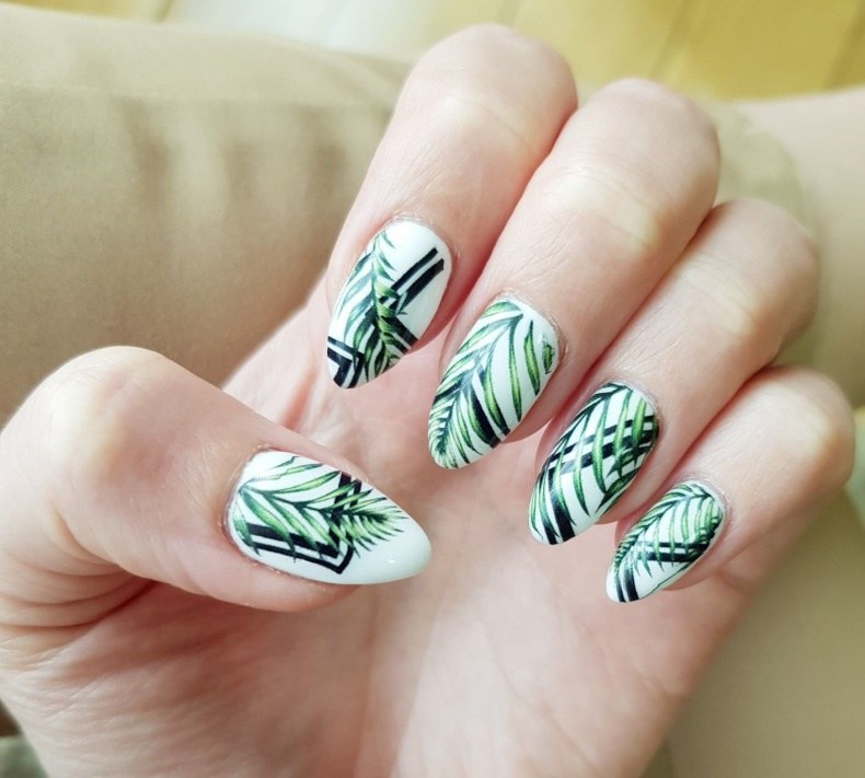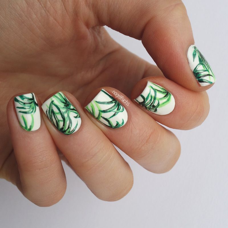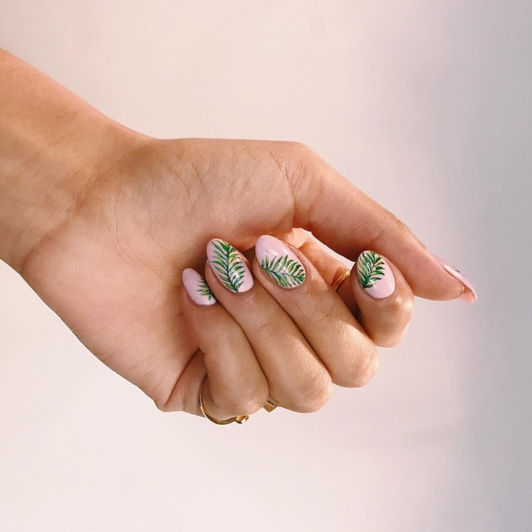 Совет: пальмовые ветки могут быть не только зелеными. Особый шарм маникюру придают разноцветные рисунки веток. Лучше всего размещать их на контрастном или нюдовом фоне.