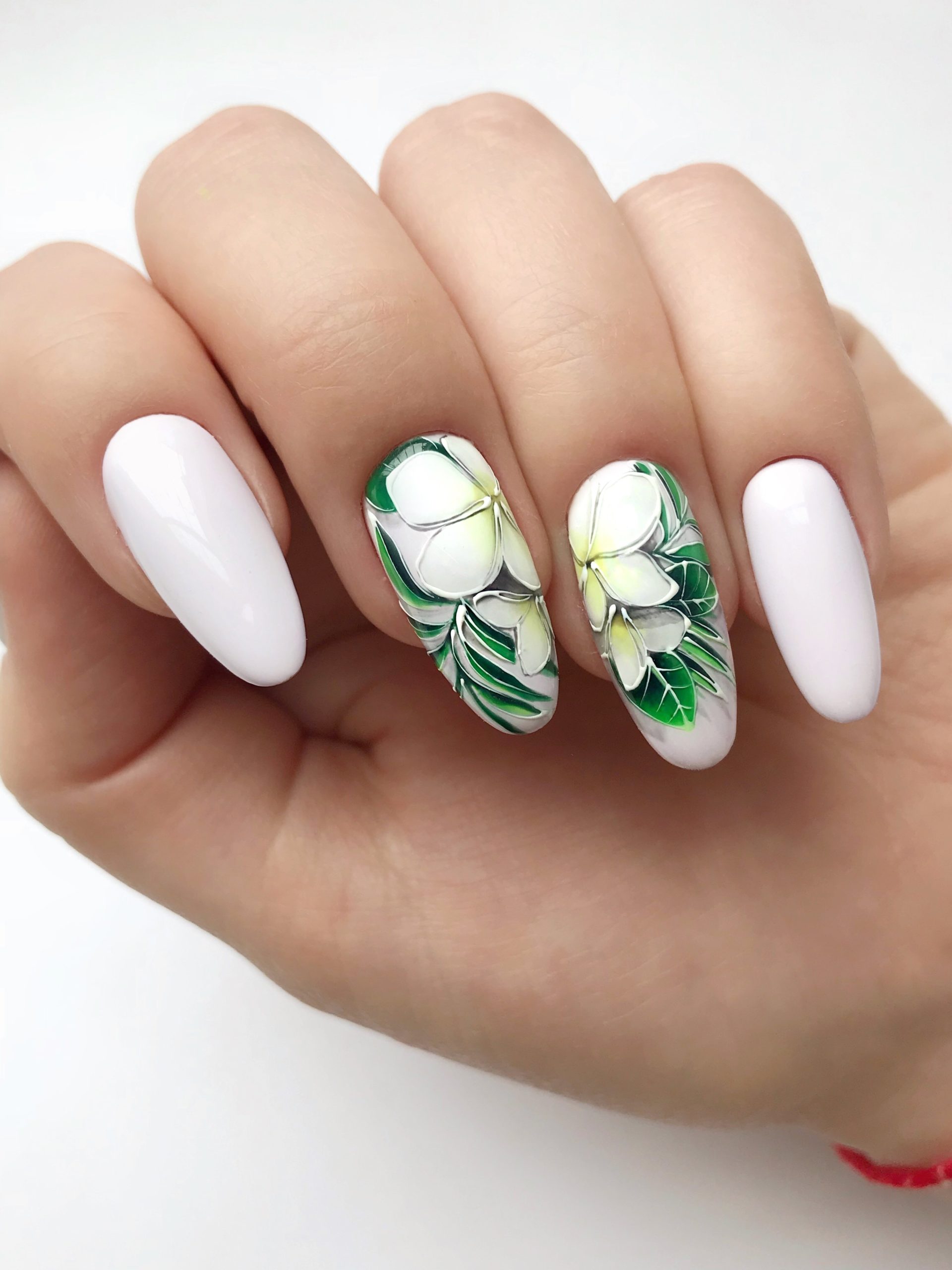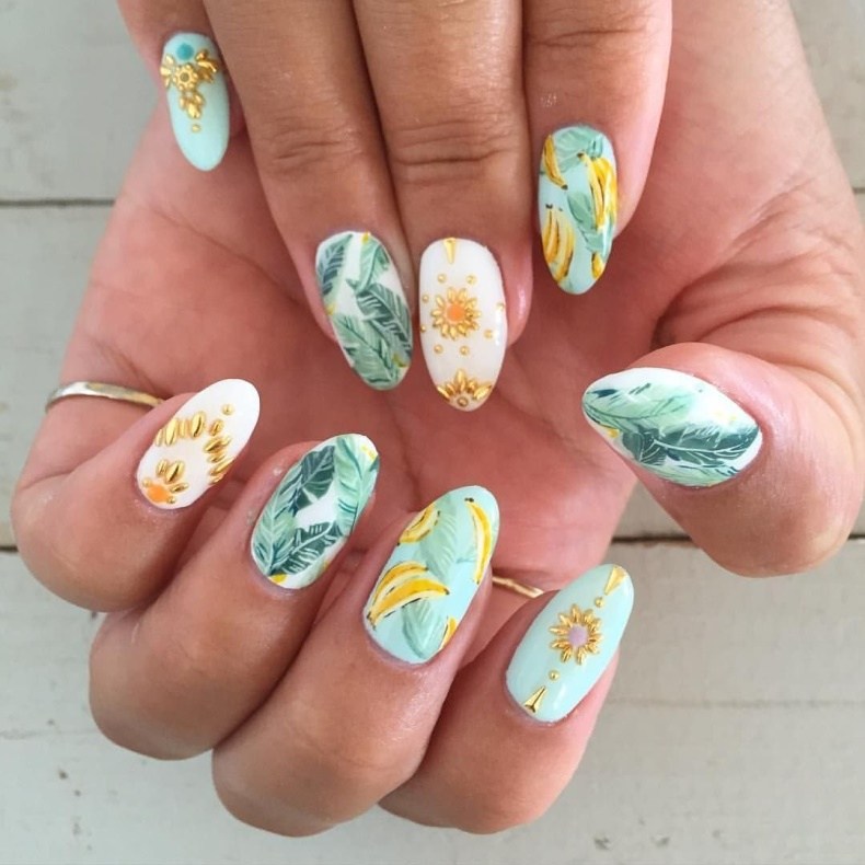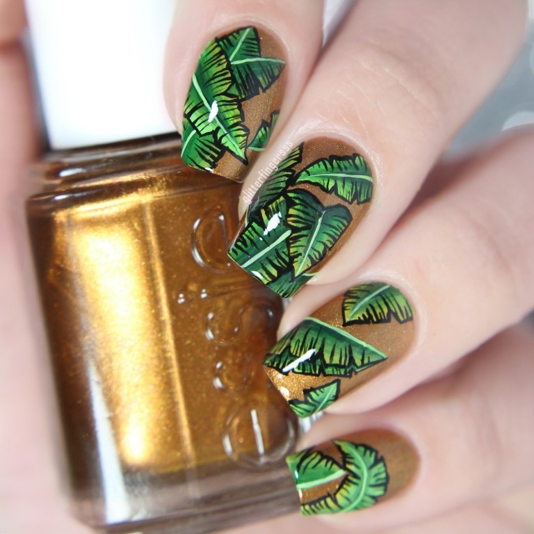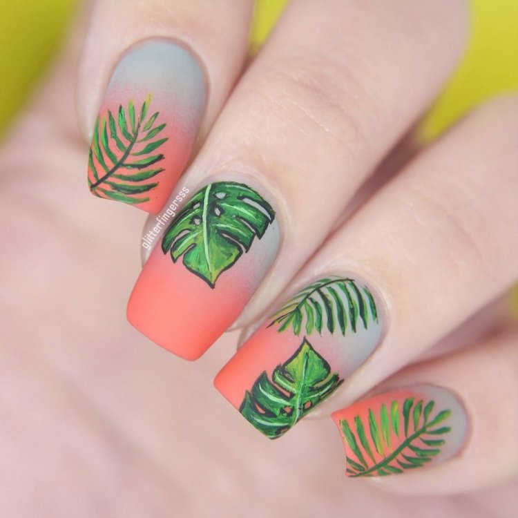 Тропические растения придадут необычности образу. Такой дизайн можно сделать перед поездкой в отпуск, заменив приевшуюся уже морскую тему. Не стоит ограничиваться привычными ветками пальмы, добавляйте в дизайн кокосы, цветы и другие яркие детали.