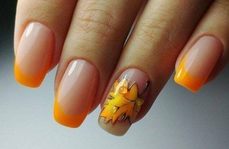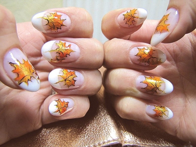 Лист клена — это своеобразный символ осени. Резной, крупный и в этот период окрашенный в самые причудливые оттенки — кленовый лист заслуживает такого внимания со стороны модниц. Для самостоятельного исполнения листик клена довольно сложен. Но его можно нанести с помощью слайдера или трафарета. А уже кистью добавить пару деталей.