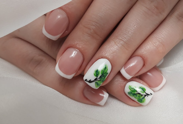 Френч — классика маникюра. Именно поэтому его обязательно нужно попробовать совместить с принтом листья или веточки. Выбирайте любой вариант — улыбка французского маникюра в виде веточки, оформление кончика пластины листиками или классический френч с дополнением в виде растительного принта. Все они будут одинаково эффектно смотреться как летом, так и дождливой осенью.