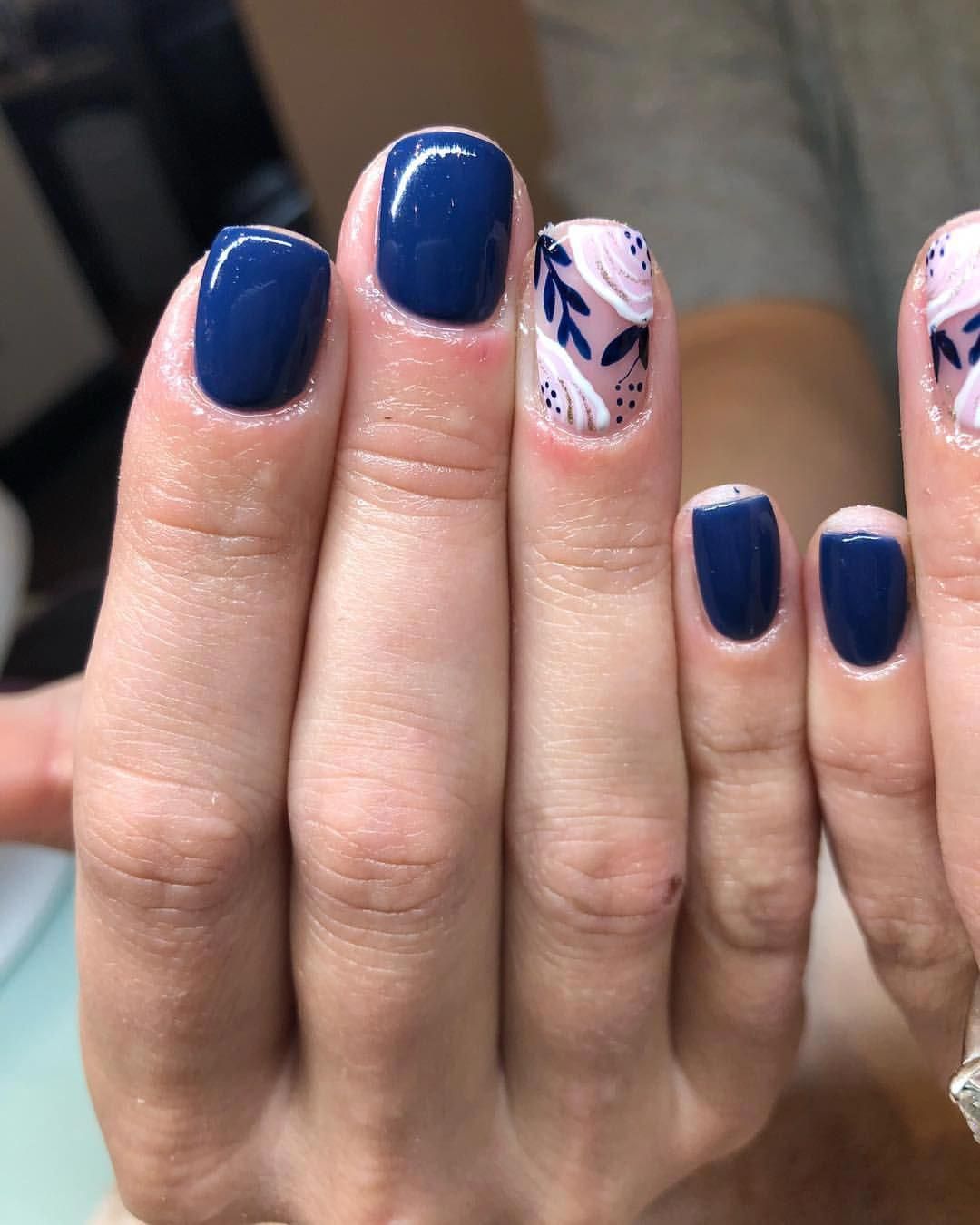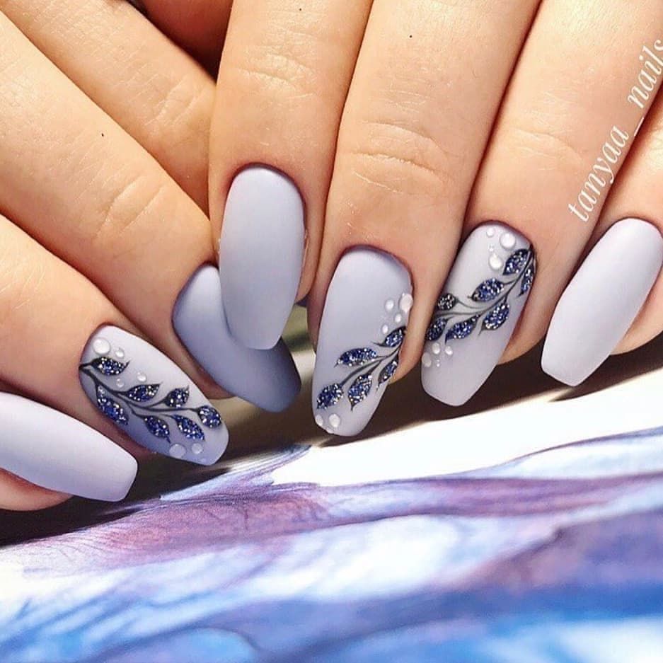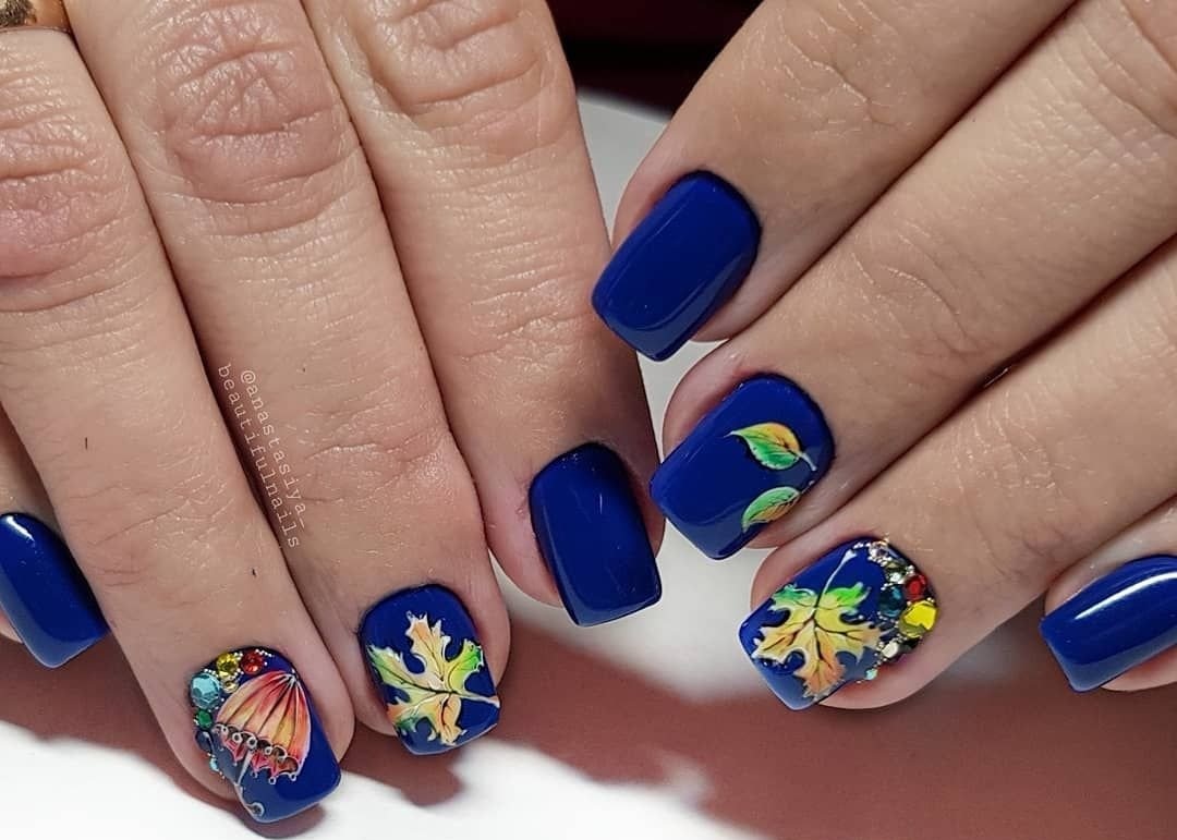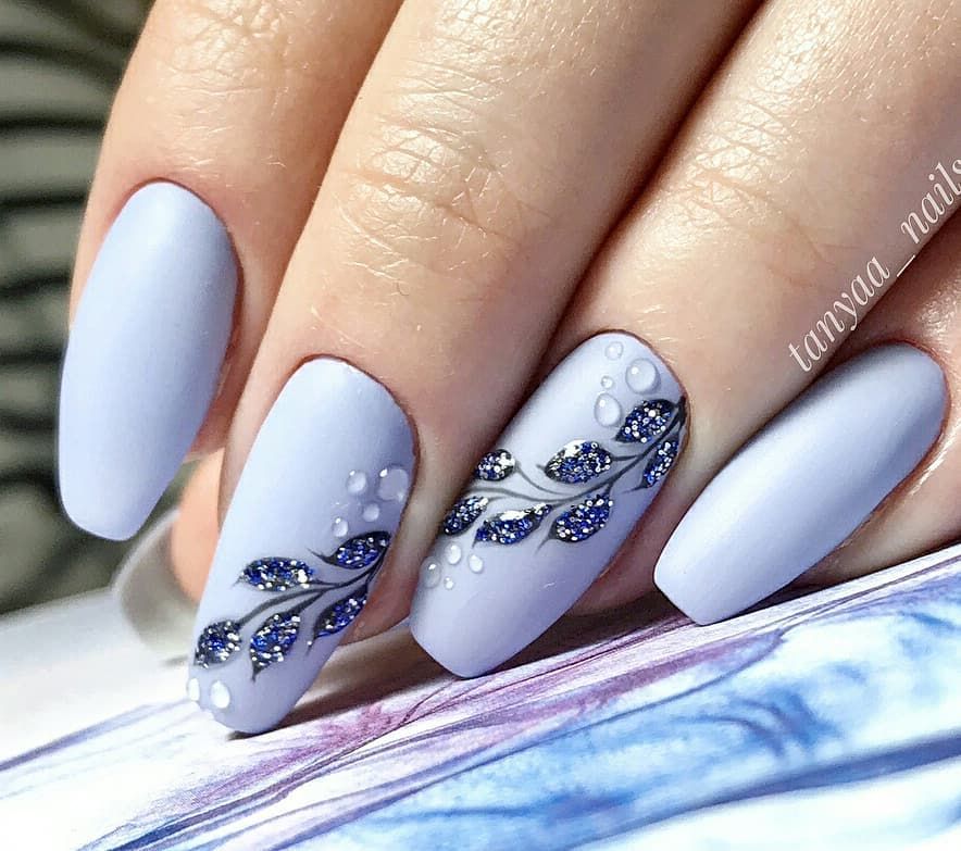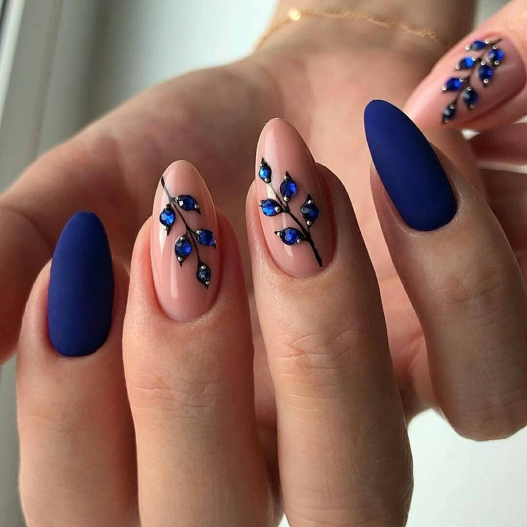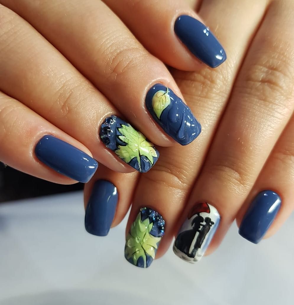 Не обходите вниманием синий цвет. Если вы любите серебряные украшения и минималистичный дизайн — нарисуйте листья, веточки и ягоды серебряным тоном на базе индиго. Для более роскошного маникюра может покрыть базу матовым топом.