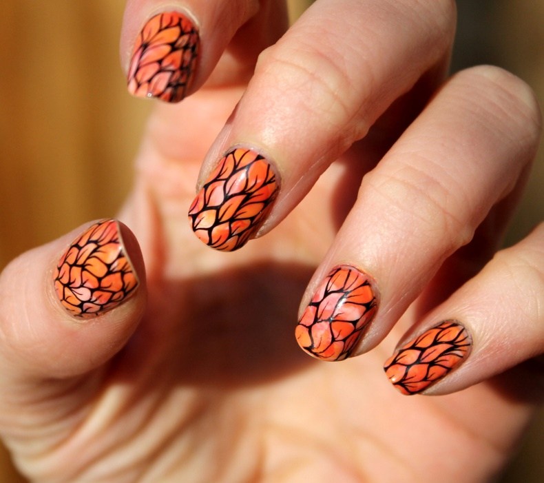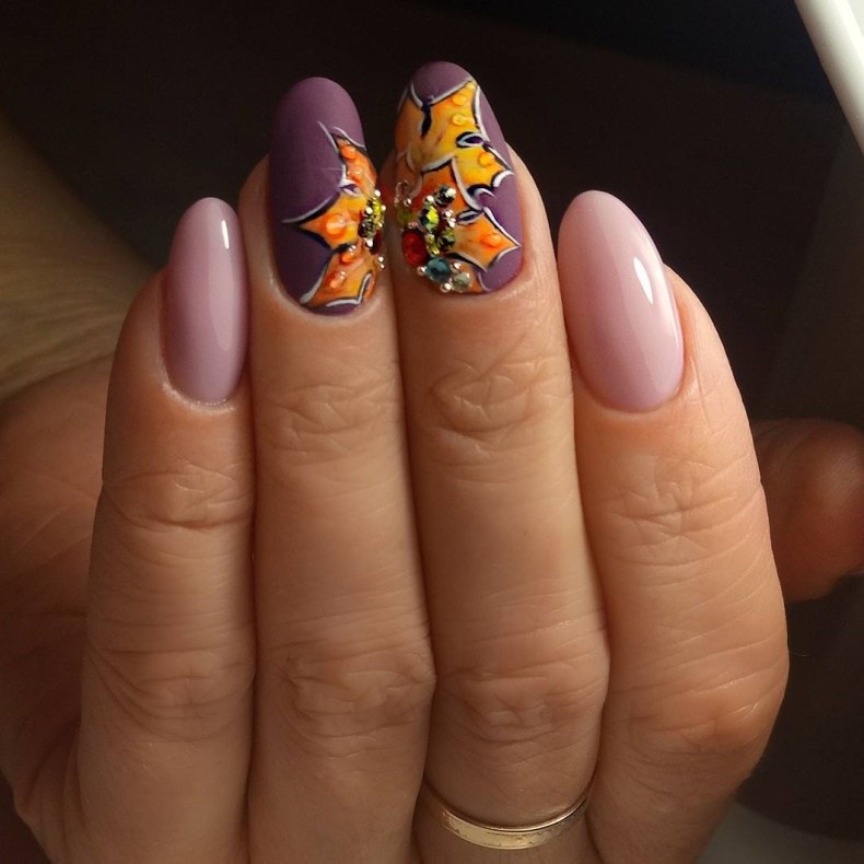 А вот еще одна очень интересная идея, которая позволит совместить летний и осенний маникюр в одном. Предлагаем вам поэкспериментировать и нарисовать на ногтях листья, но совместить их и создать “весеннюю” бабочку. Она станет плодом вашей фантазии и будет выглядеть очень оригинально.