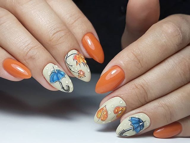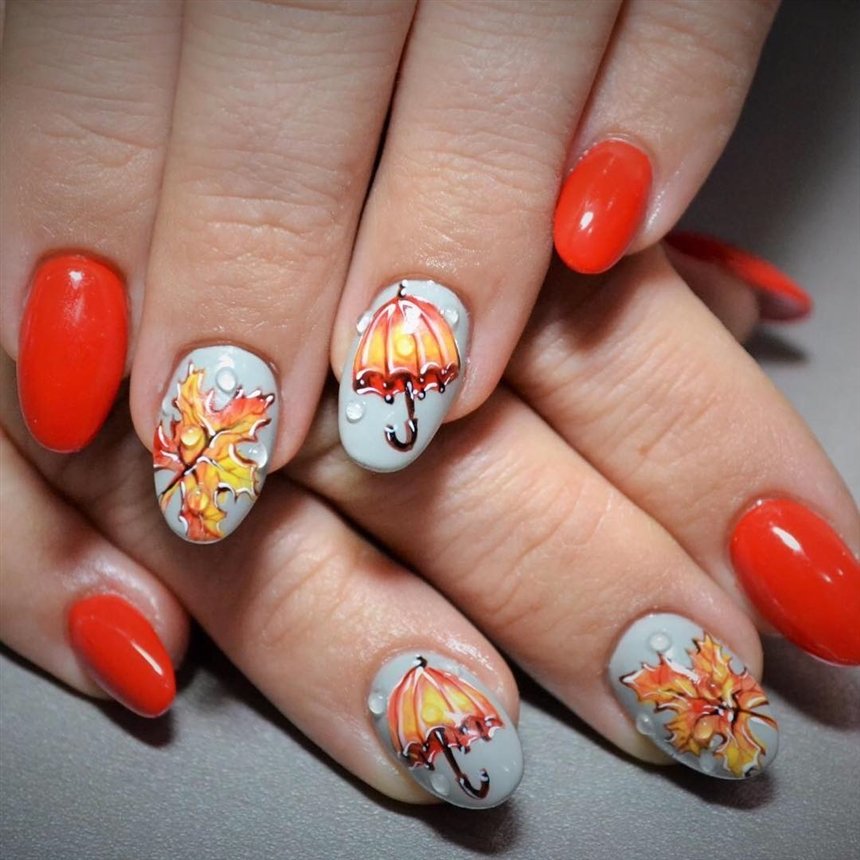 Дождь, лужи, опавшие листья — все это осень. А еще дождевики, резиновые сапоги и, конечно, яркие зонтики. Именно их можно нарисовать на ногтях в паре с листочками и веточками, чтобы создать стильный осенний маникюр.