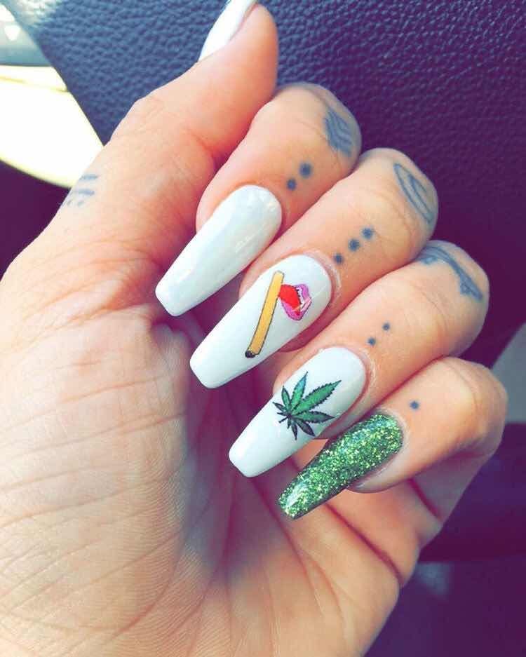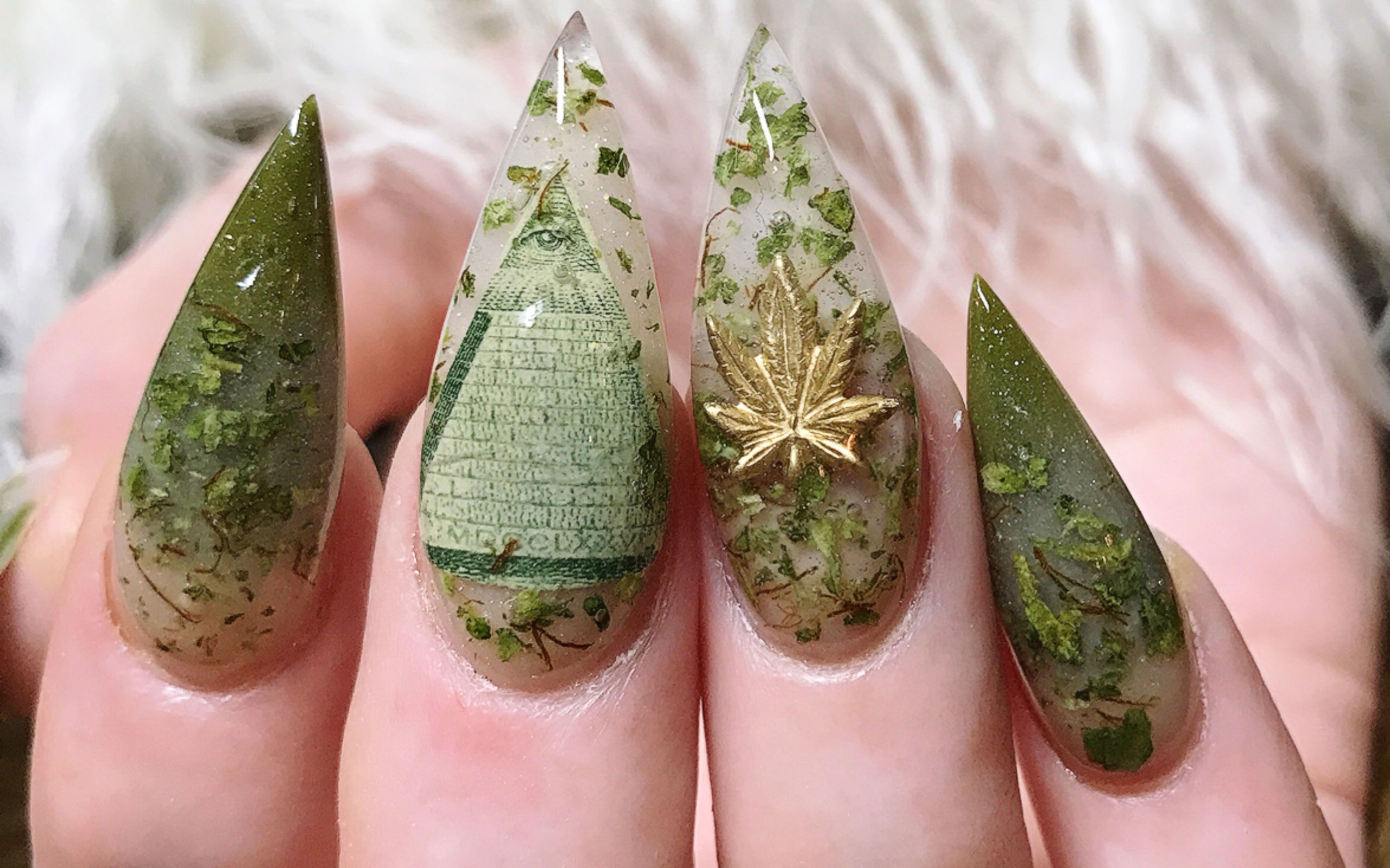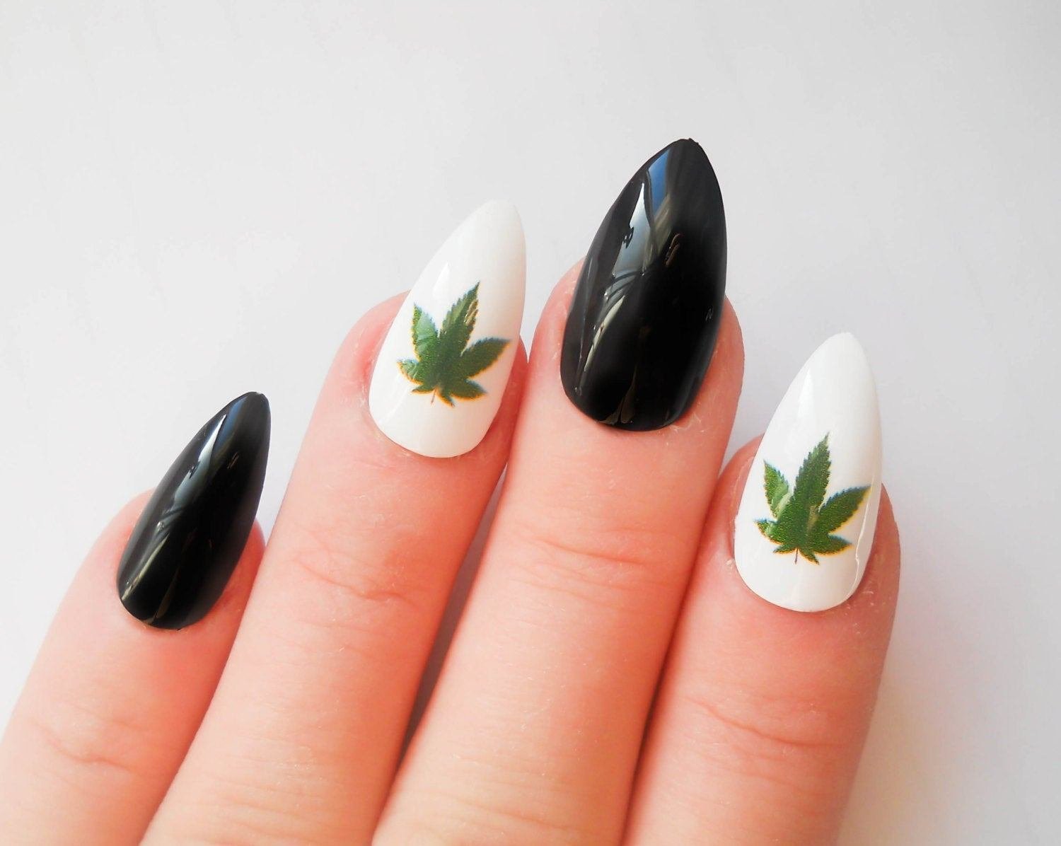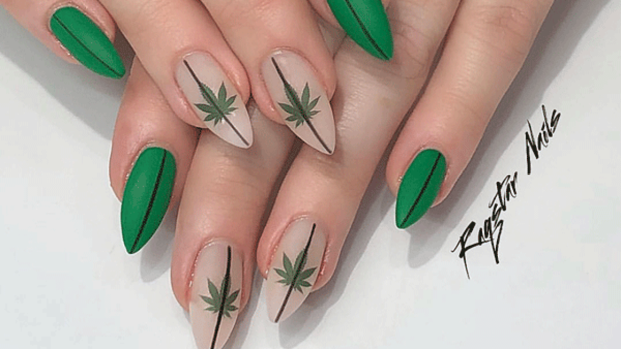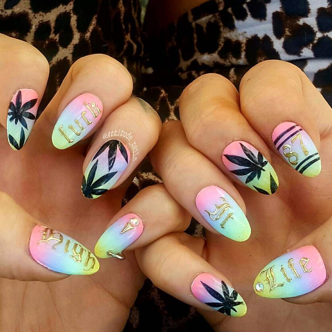 Несмотря на противоречивое отношение к этому растению в разных странах, одежда и другие вещи с листиками марихуаны пользуется большой популярностью. Не стал исключением и нейл-арт.
