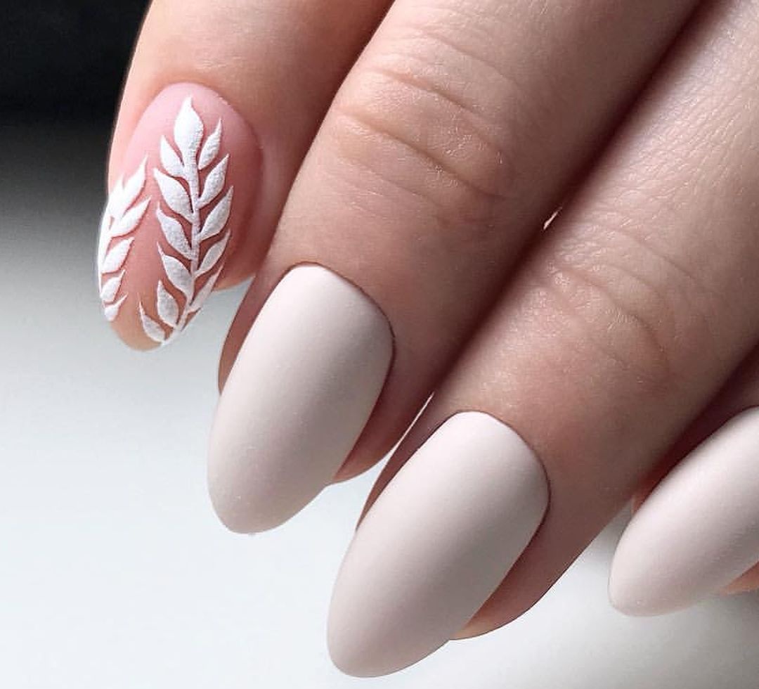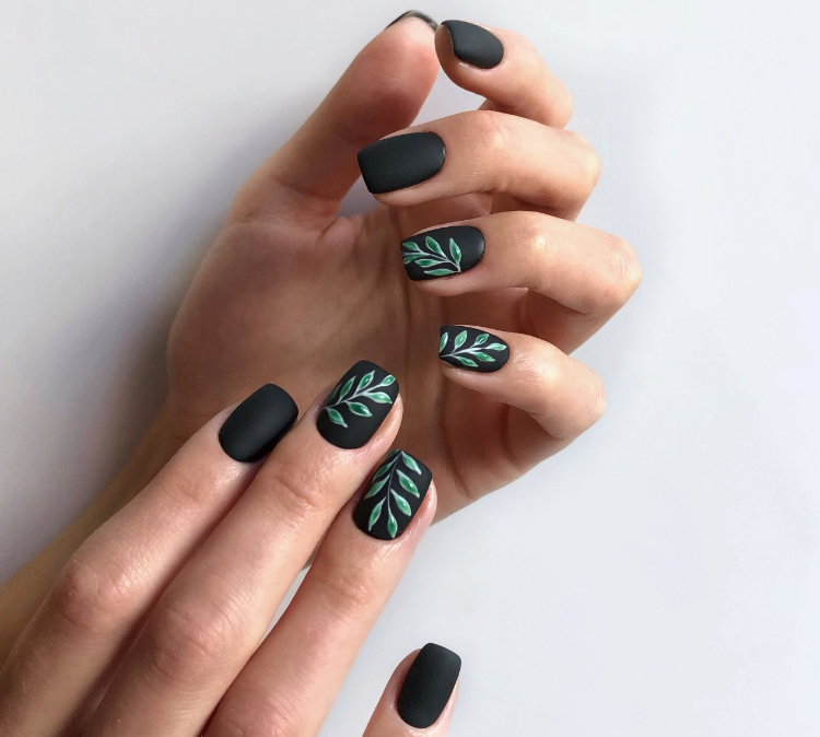 Матовый топ — прием, позволяющий сделать образ стильным и ухоженным. Для листового маникюра рекомендуем выбрать именно матовую поверхность. На такой базе зеленые веточки и листики выглядят свежо и по-настоящему.