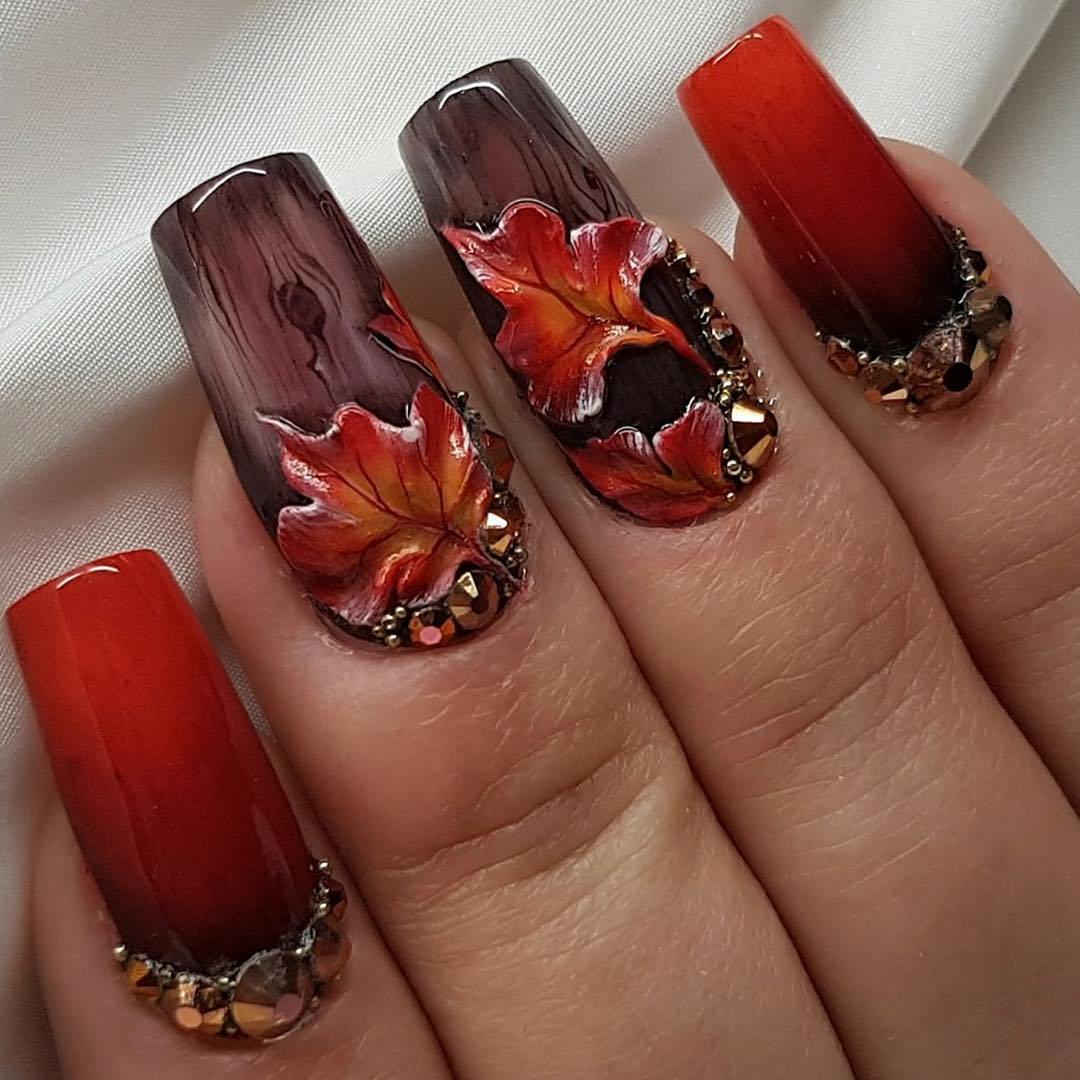 Прозрачные блоки на цветном ногте вкупе с листьями — очень интересный прием. так получается создать объемный эффект. Выбирайте не более двух оттенков лака для создания базы, наносите рисунок или наклейку на пластины и у вас получится идеальный листовой дизайн ногтей.