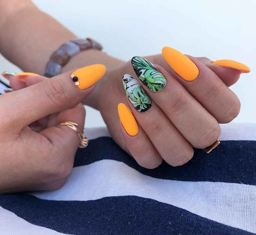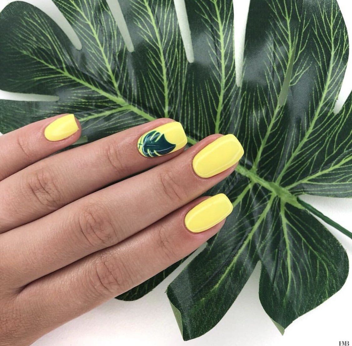 Летом модницы используют яркие и даже вычурные цвета. Например, кислотные и неоновые. Такой дизайн самодостаточен. Если вы выбираете нейтральную или спокойную базу, обязательно дополните ее растительными мотивами. И самый простой вариант — листья.