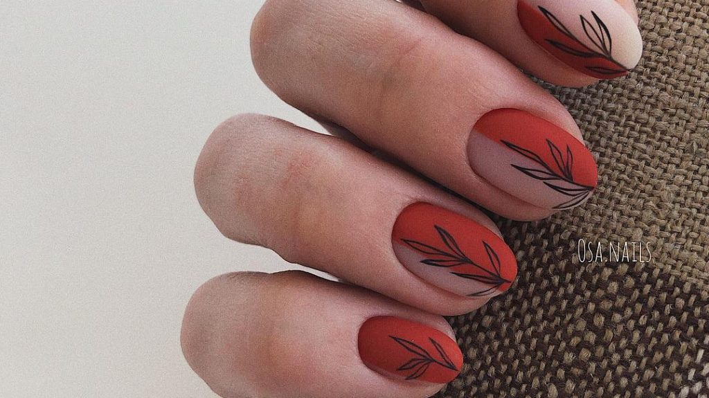 Хотите самостоятельно сделать довольно сложный дизайн ногтей? Выбирайте нейтральную базу (лучше матовую), немного фольги и рисунок листья. Все вместе это смотрится стильно и лаконично.