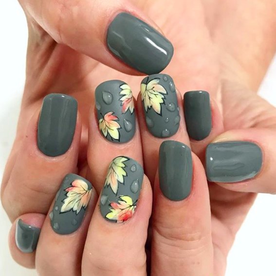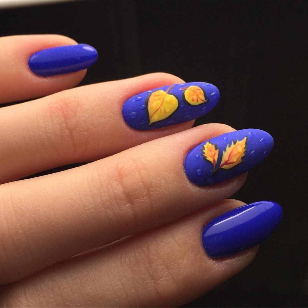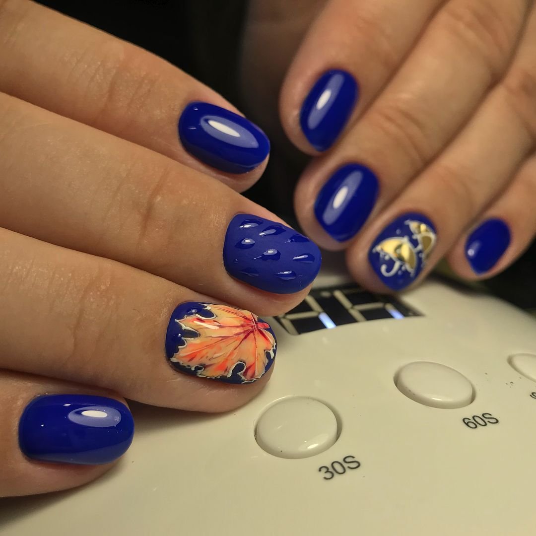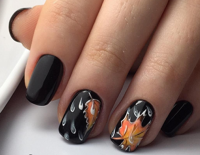 Дождь — вот еще один атрибут осени. И даже если за окном стоят погожие дни, стоит использовать этот вариант декора для дизайна ногтей. прозрачные объемные капли рядом с яркими огненными листьями сделают осенний маникюр неповторимым и удивительно красивым. Капельки сделать просто — с помощью глянцевого топа или геля для наращивания.