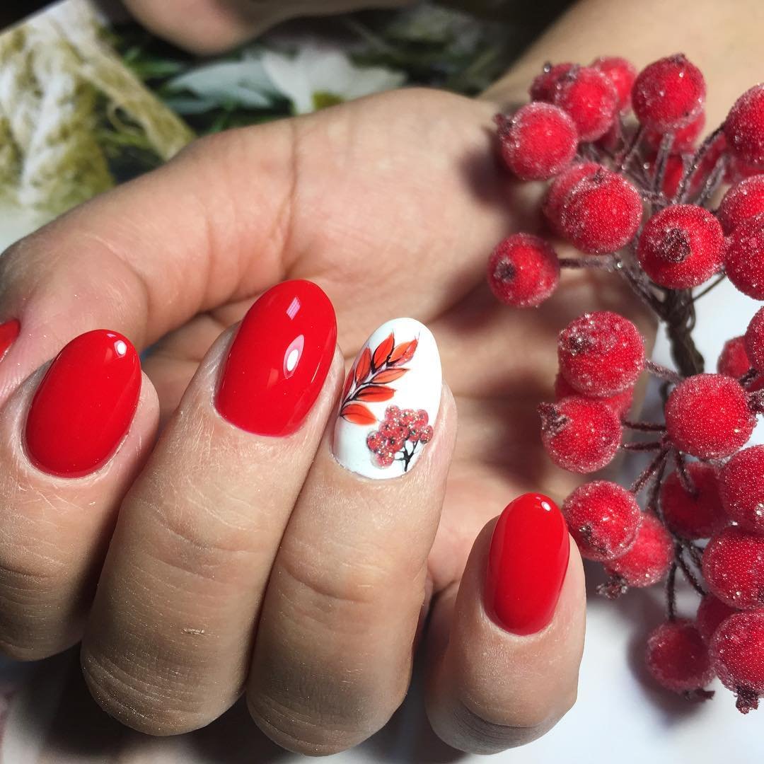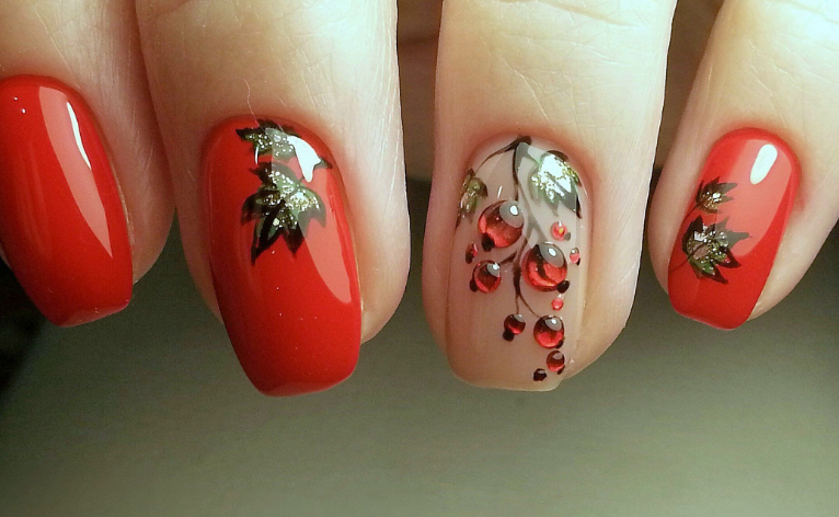 Осенью привлекательными становятся не только листья, но и ягоды. Наиболее популярен маникюр с рябиной. Ее можно нарисовать, выбирая оттенок от оранжевого до красного, наклеить слайдер или сделать рисунок с помощью трафарета. Если хотите сделать дизайн объемным и более интересным — сделайте ягоды с помощью страз. Но не усердствуйте — достаточно пары ягод.
