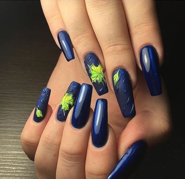 Для длинных ноготков можно выбрать более смелые решения — крупные листочки, длинные веточки. Да и акцентов можно сделать больше. чем один или два. Например, можно оформить все ногти в стиле total — покрыть пластины лиственным принтом. Нанести его можно как кисточкой, так и использовать слайдеры, трафарет и аэрограф.