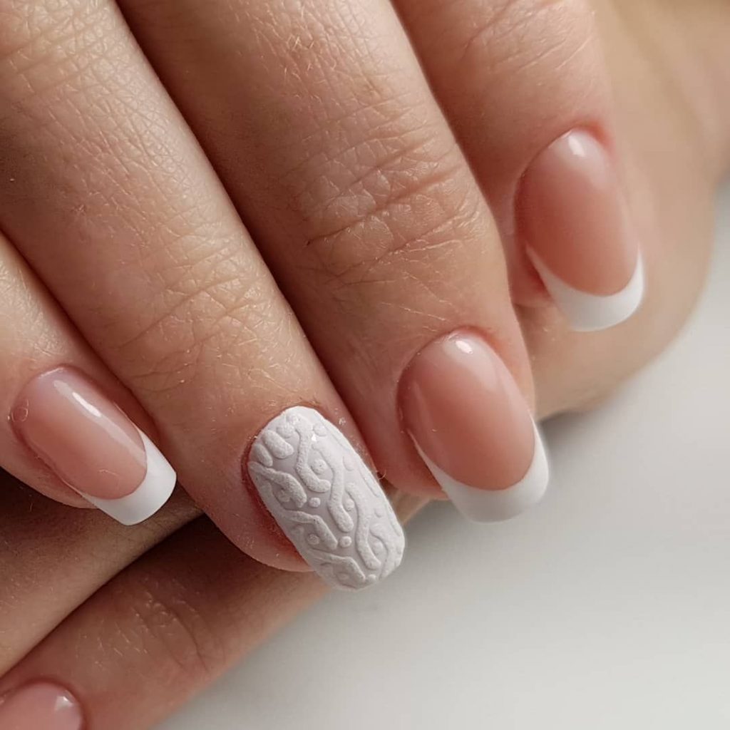 Зимой френч становится иным. Он активно сочетается с рисунками — звездами, морозными узорами, шарфиками и шапочками. Почему бы не сделать » теплый акцент» и не украсить один или два ноготка вязаными косами. Лучше делать это в цвет с улыбкой френча. Но это необязательное правило. Вы можете выбрать контрастные оттенки.