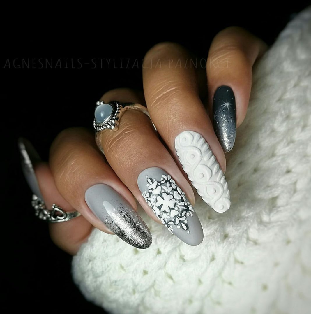 Отдельно скажем о сочетании вязаной фактуры в маникюре и рисунка снежинки. Последняя — обязательный атрибут зимнего стиля в нейл-арте. Практически каждая модница за зиму успевает нарисовать на своих ноготках яркие затейливые снежинки или звездочки.
