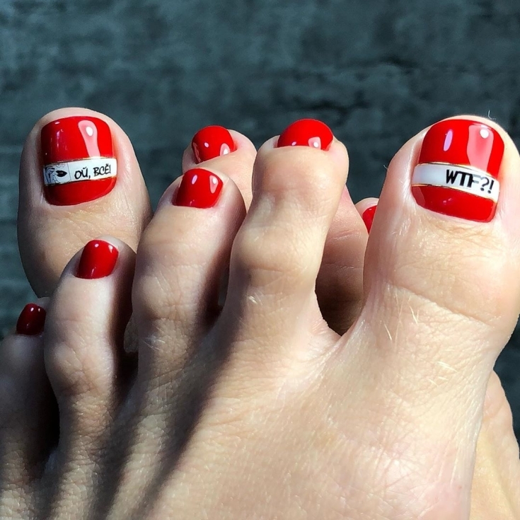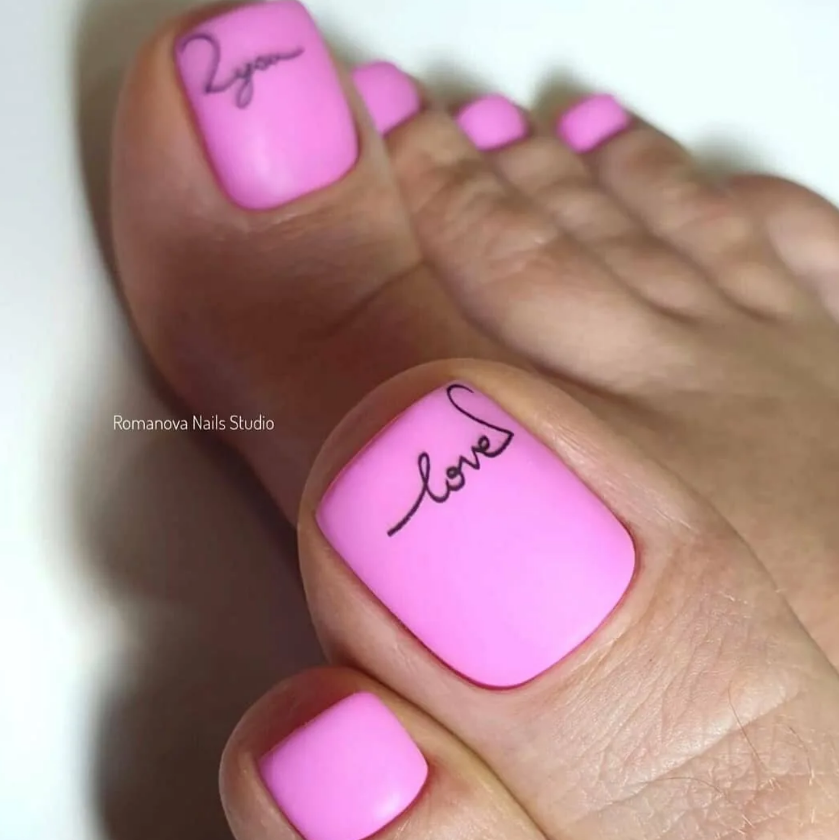 Надписей много не бывает. Можно выделить каждый отдельный ноготь. Или нанести текст любого сочинения на свой большой палец ногтя на ноге. Мастера делают такой рисунок как на русском языке, так и на английском и любом другом. Конечно, иностранные слова выглядят более ярко и оригинально.