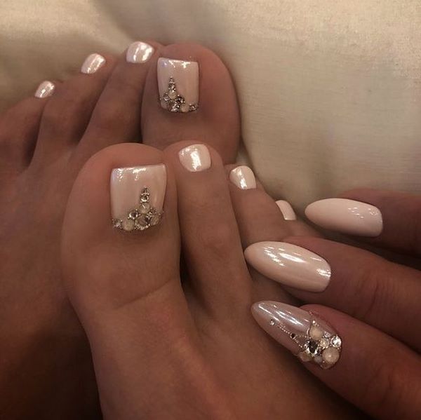 Такой цвет выбирают девушки на свадьбу, будучи невестой, а также представительницы органов власти, банковской сферы, педагоги, да и простые школьницы. Цвет ни к чему не обязывает, а также подходит под любой наряд и образ. Отлично сочетается с другими тонами, может использоваться как основа для френча, для рисования на нем картинок или фигур. Все это вы можете воплотить, если сделаете педикюр в нюдовых тонах.