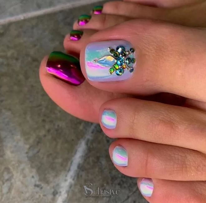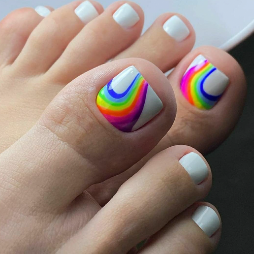 Сложно представить, но в 2026 году, летом, в тренде будет педикюр, где каждый ноготок выкрашен в разные цвета. Своеобразная радуга будет всегда рядом с вами, если вы захотите воспользоваться таким вариантом. Правда, разноцветный педикюр смотрится уместно лишь на девушках, которые сделали его специально под какое – то событие (К примеру, поездка на море, день рождение). Во всех остальных случаях, особенно, когда этого не позволяет профессия, предпочтение следует отдать классическим тонам в педикюре и маникюре.
